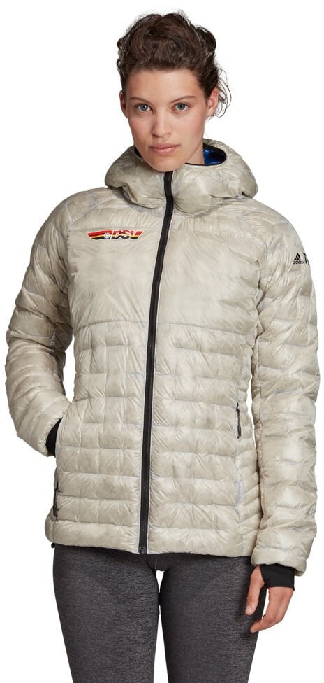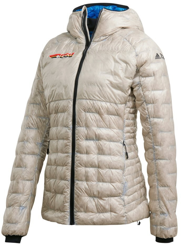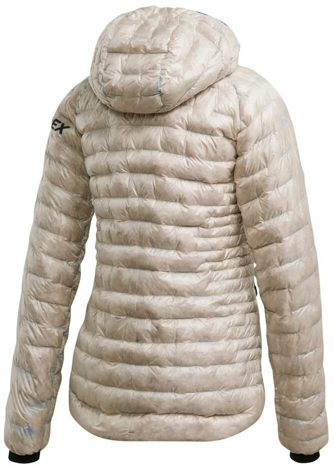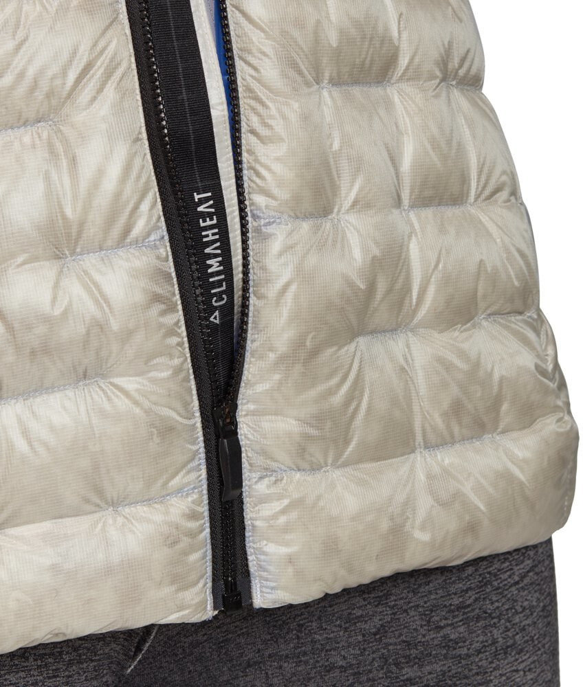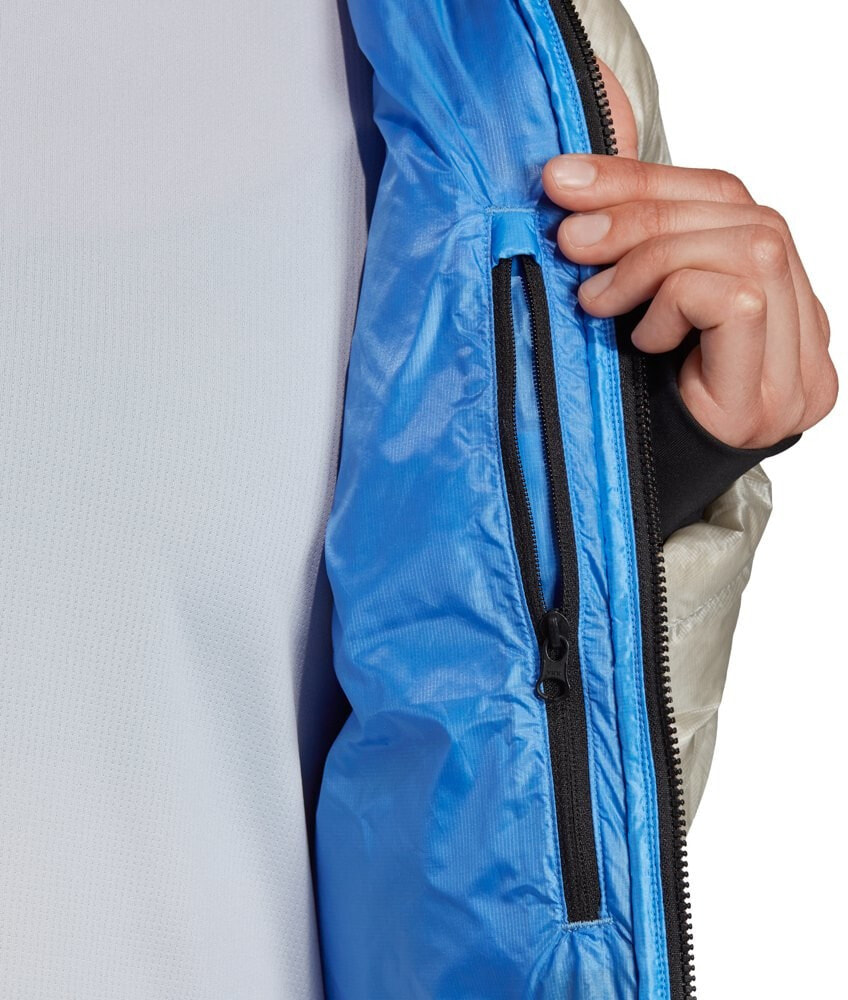 – Shell: 100% nylon ripstop; Inserts below armpits: 52% polyester / 31% nylon / 17% elastane polar fleece; Fill: 90% goose down / 10% feathers