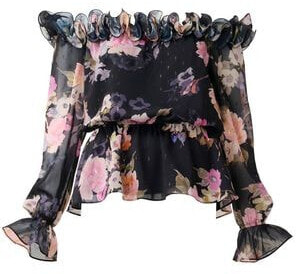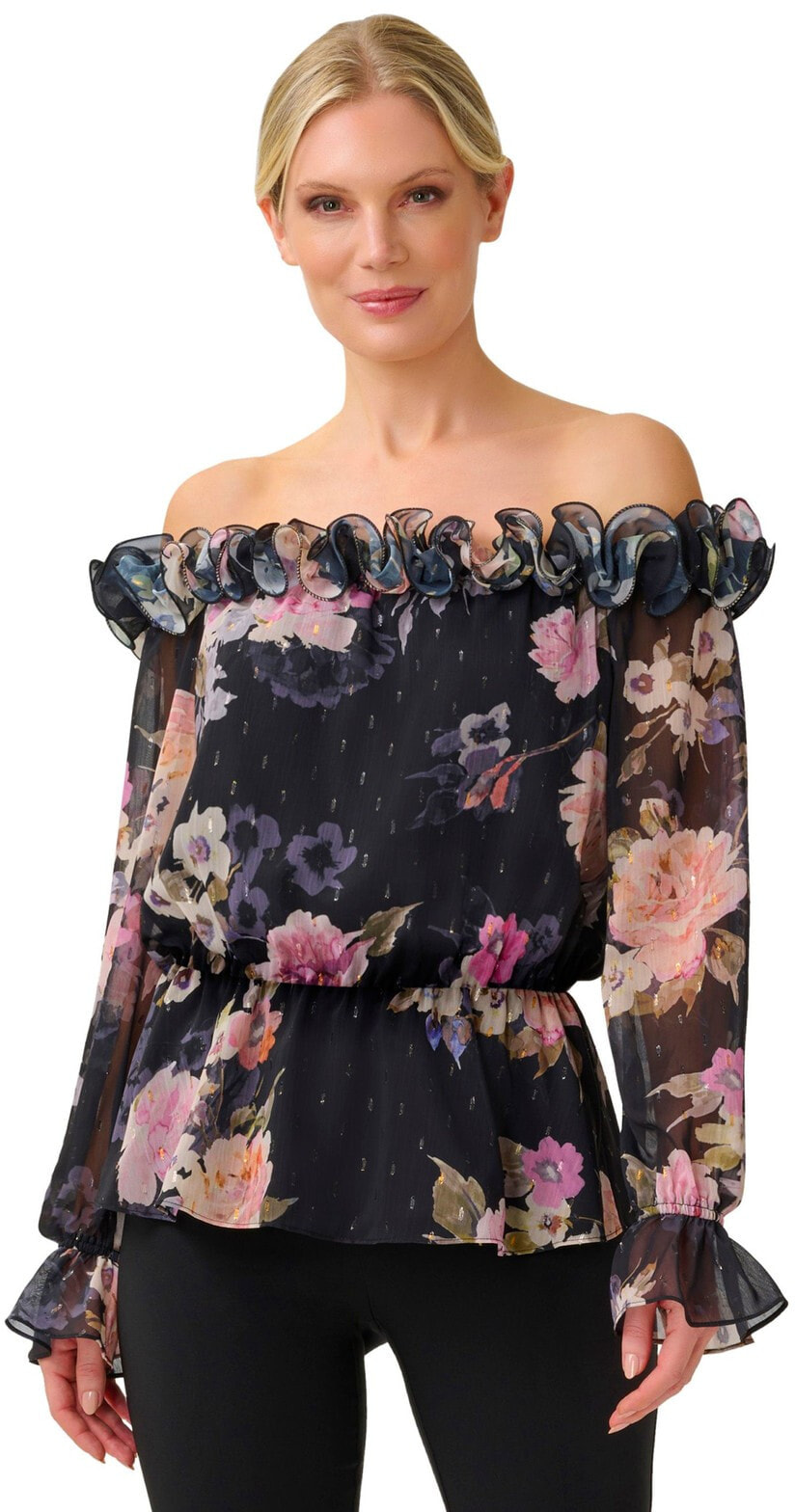 Feminine and versatile, our off-the-shoulder pullover top blooms with a fresh floral print on metallic clip dot woven chiffon fabric. We love the playful rosette accents along the neckline. Designed in our iconic (and ultra-flattering) blouson silhouette. All the details: long sleeves with bell cuffs. Wearable on repeat for so many occasions. Team with your favourite jeans for a girl’s night out or with straight-leg pants or a pencil skirt for a more elevated look.