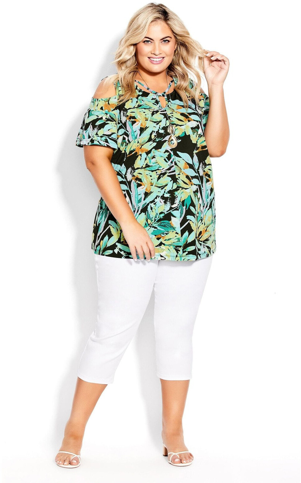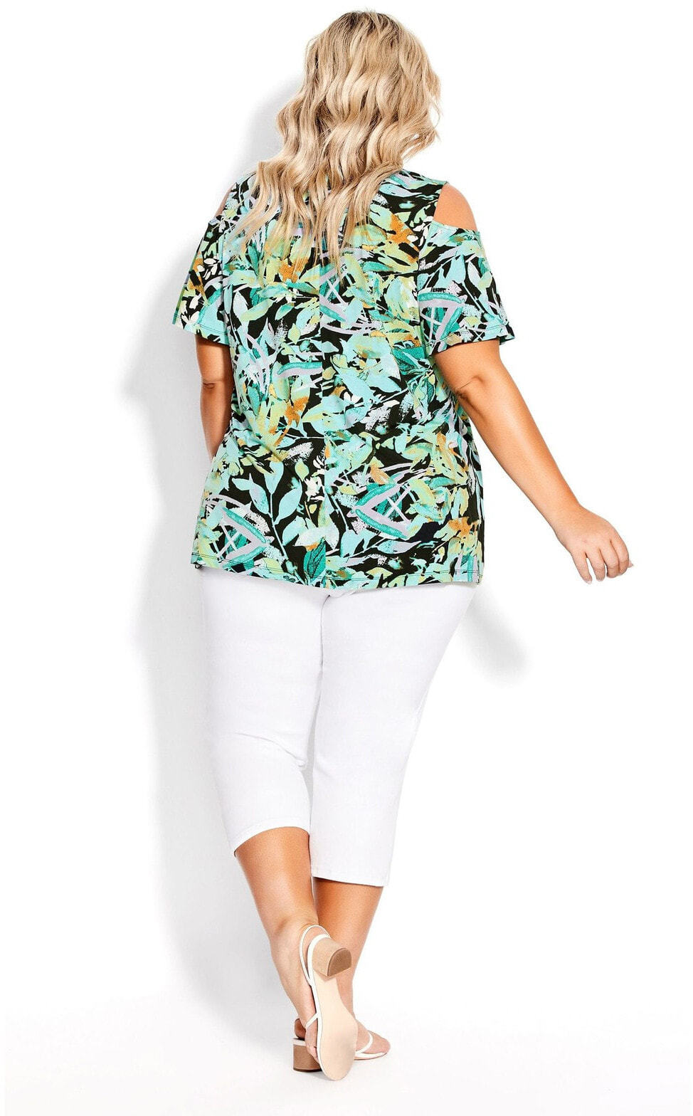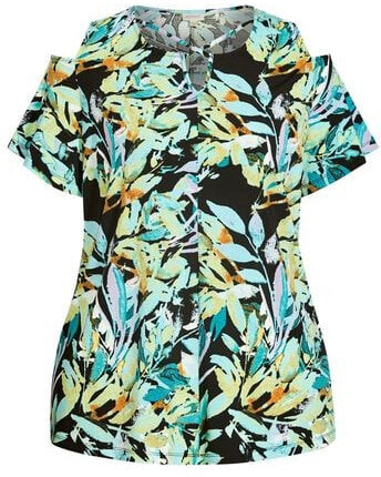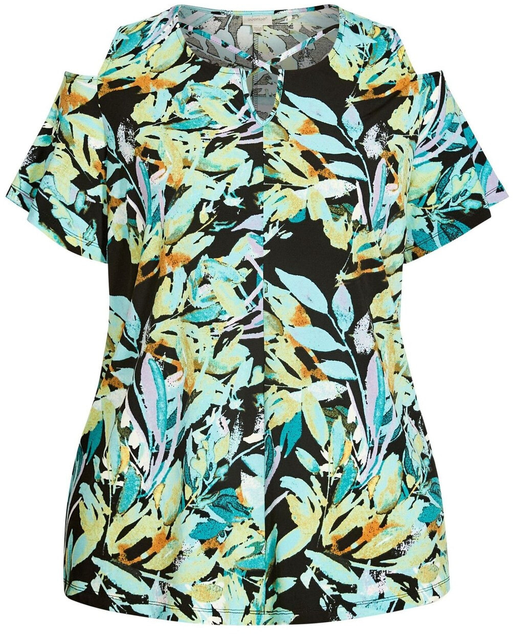 Finish your outfit with fresh style of the Cold Shoulder Print Top. Crossover strap neckline details add a bold touch to this relaxed silhouette, perfect for everyday wear. Key Features Include: – Round notched neckline with crossover straps, Short flutter sleeves with cold shoulder cut outs, Wide shoulder straps, Pull-over fit, Relaxed silhouette, Stretch knit fabrication and Straight hemline at hips.