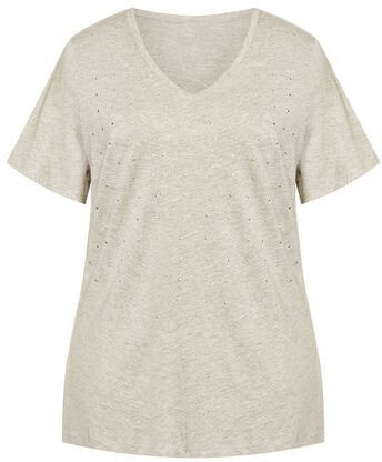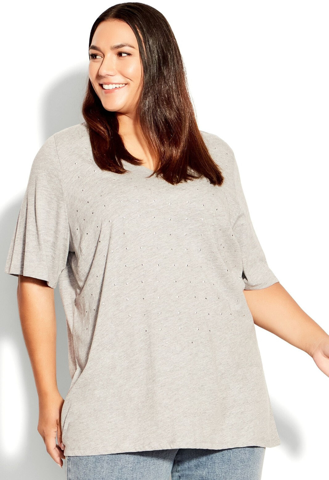 Add a stunning touch to your everyday look with the bold finish of the sparkling stars top. This go-to grey T-shirt is a perfect pick for any occasion with star stud details, a soft Cotton fabrication and a relaxed silhouette. Key Features Include: – V-neckline, short sleeves, pull-over style, darted bust for shape, star-studded bodice embellishments, relaxed silhouette, 100% cotton fabrication and straight hemline at hips. Keep this T-shirt cuddled up with a longline cardigan.
