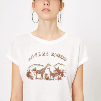 Baskılı Kısa Kollu Pamuklu Tişört Model Bilgileri: Boy:175 cm, Göğüs:83, Bel:63, Kalça:85, Modelin Bedeni:S