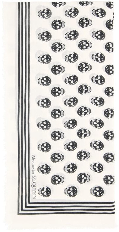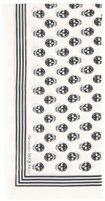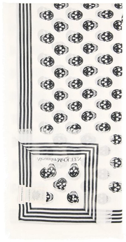 Alexander McQueen Biker thin scarf with all-over Skull motif and striped, short-fringed edges. Logo lettering print.