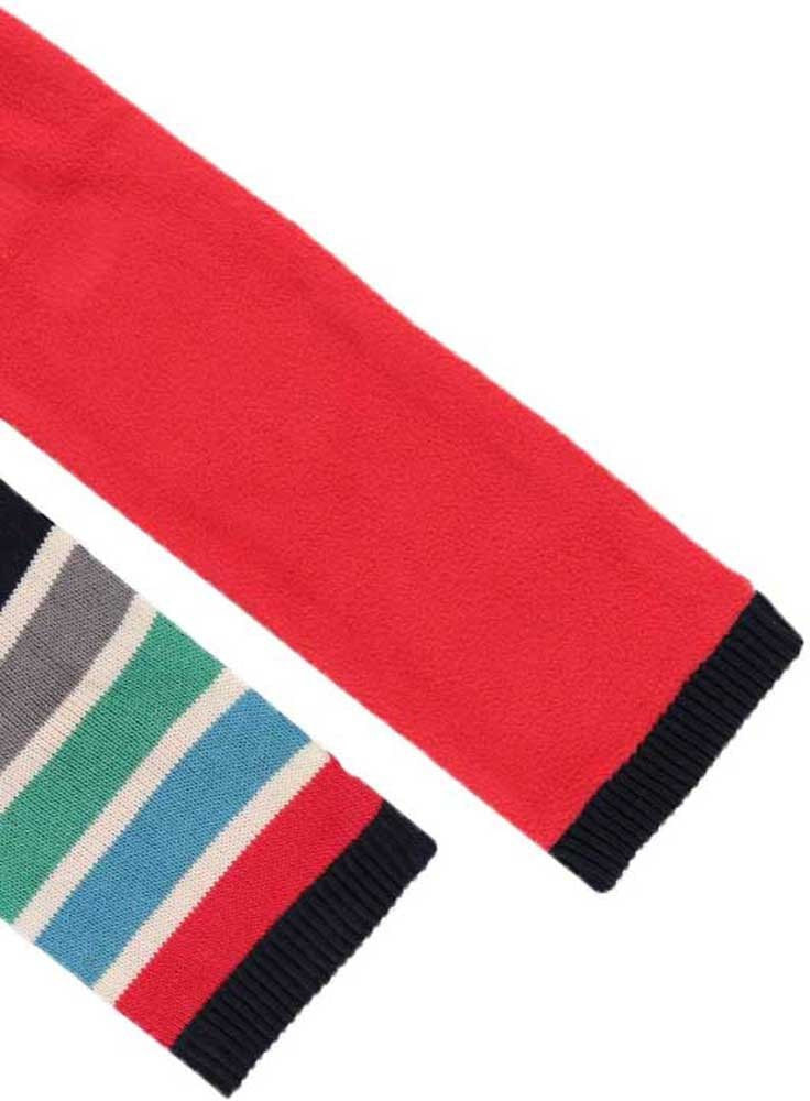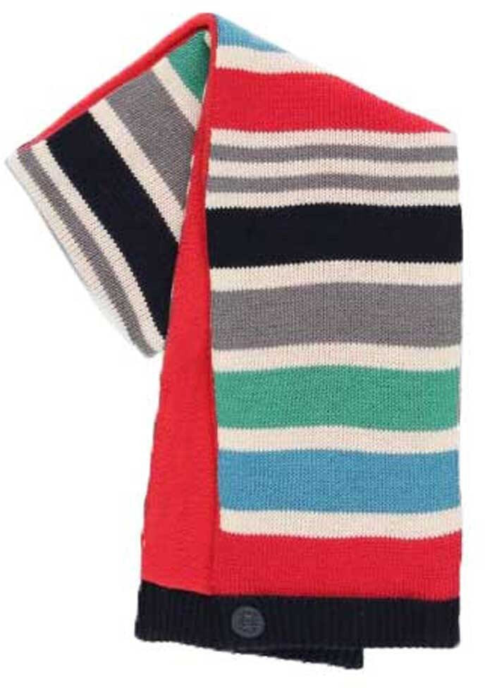 Knitted scarf for boys with stripes in several colours. The inside is made of red fleece fabric. Decorated with a label with brand detail. Sizes available XS, S and M.