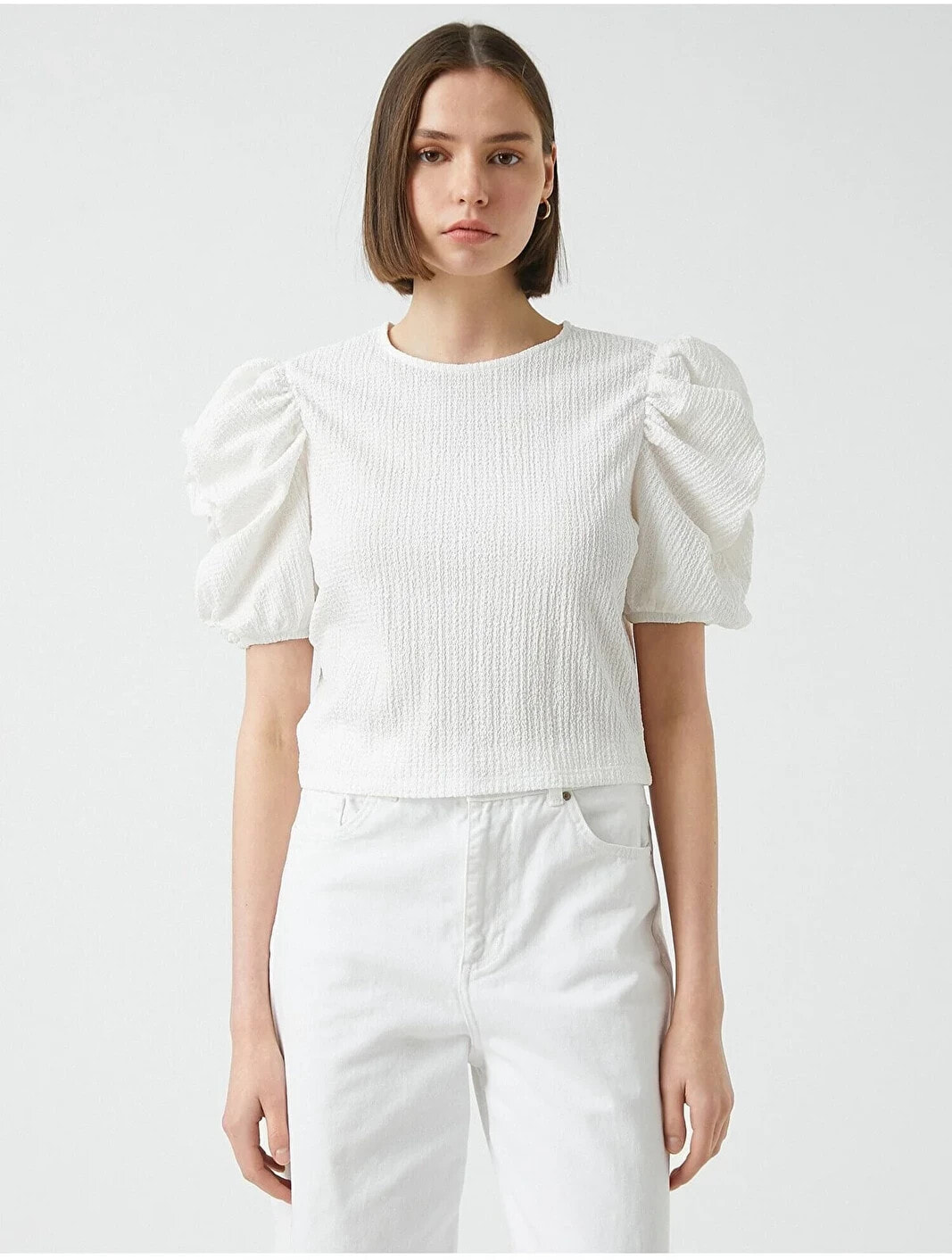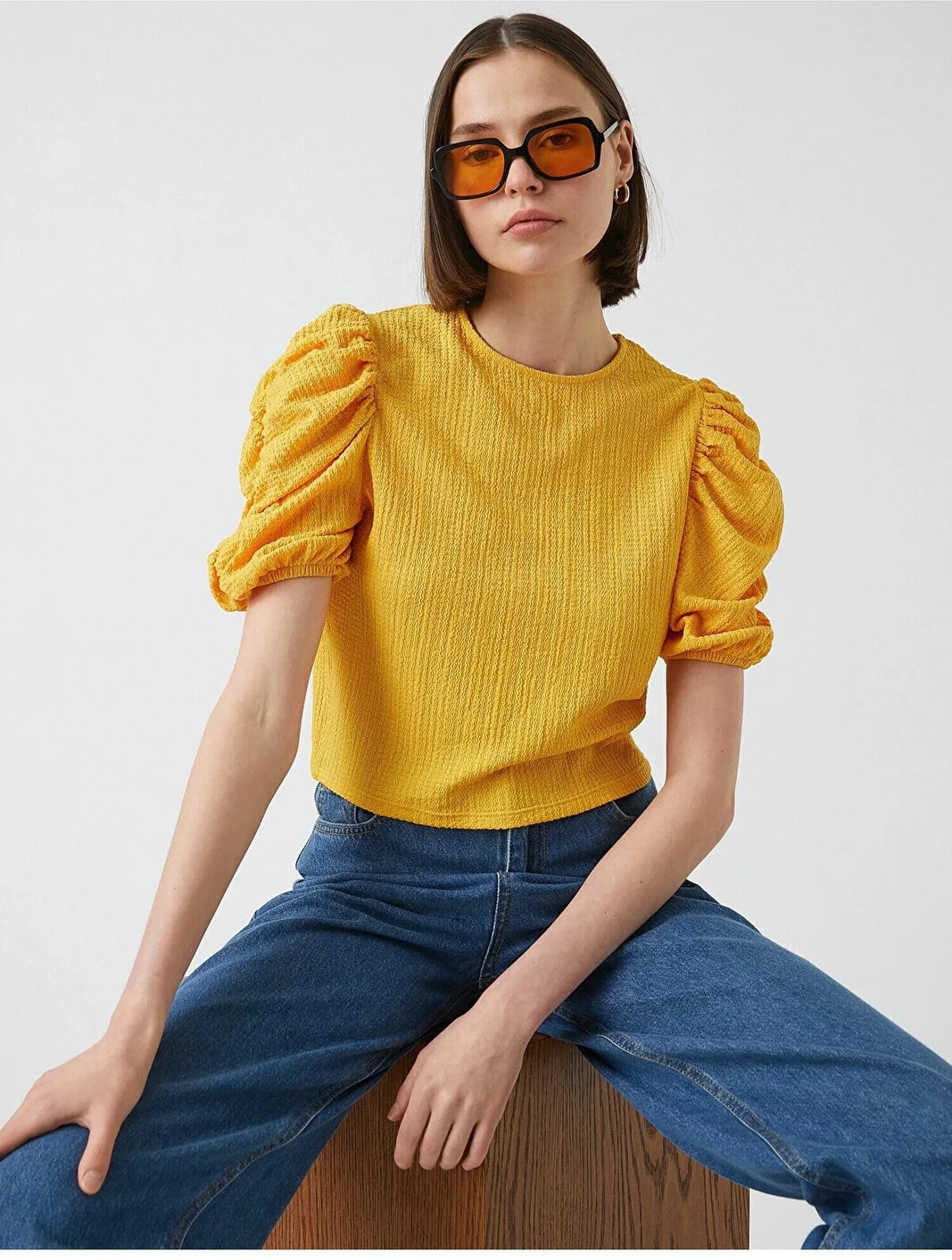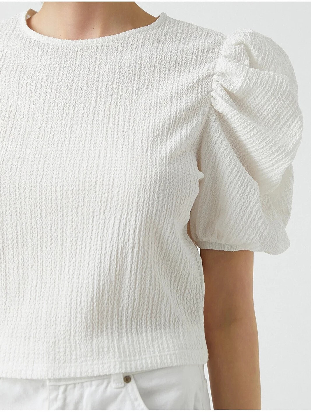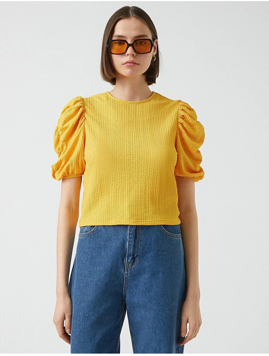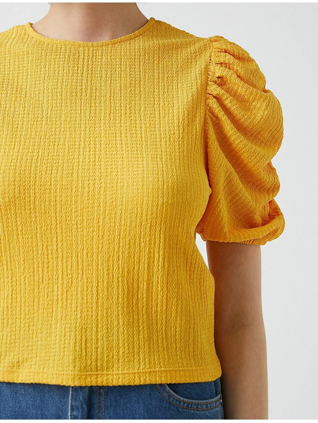 Büzgü detaylı, balon kollu, bisiklet yaka tişört. Model Bilgileri: Boy:173 cm, Göğüs:84, Bel:62, Kalça:89, Modelin Bedeni:S