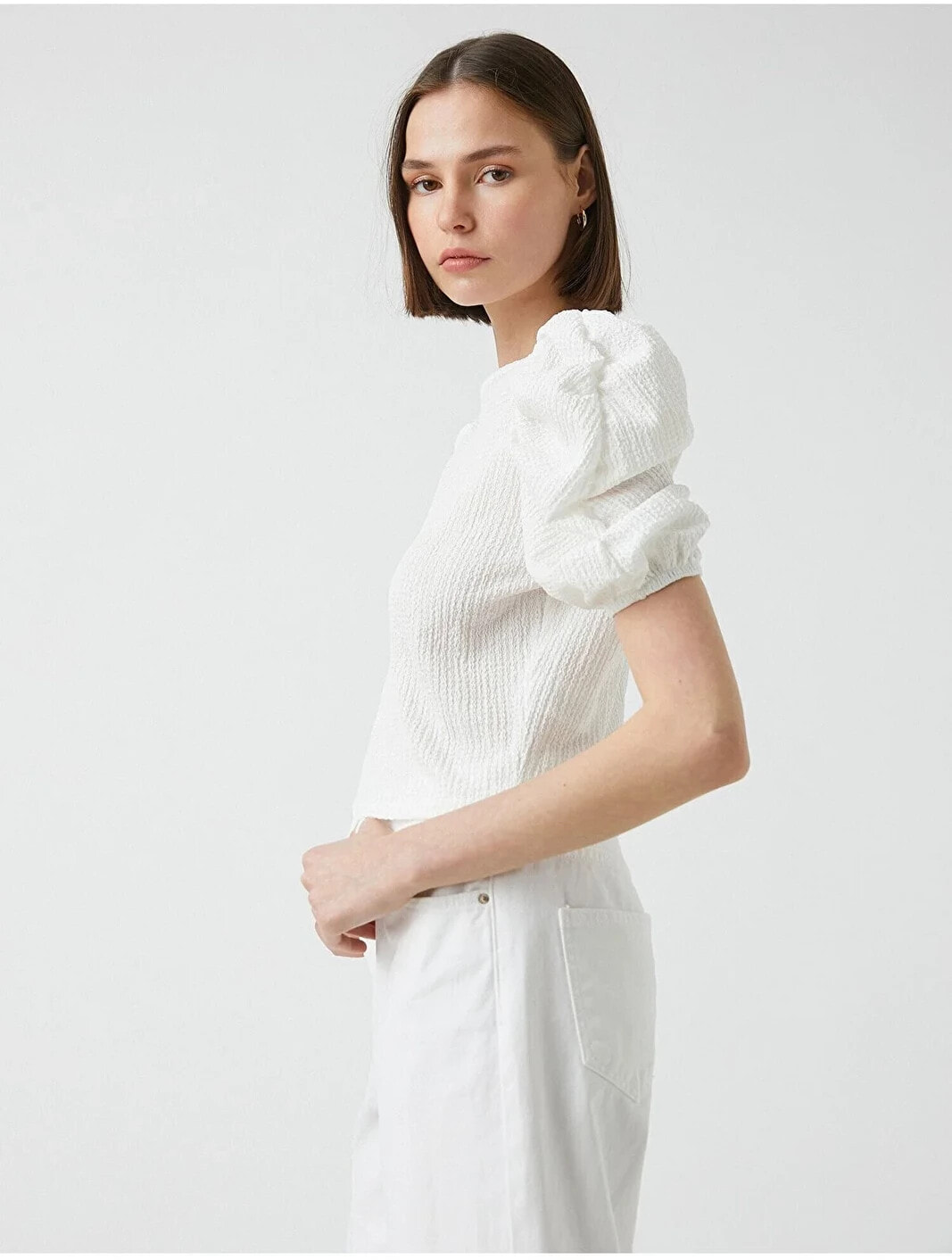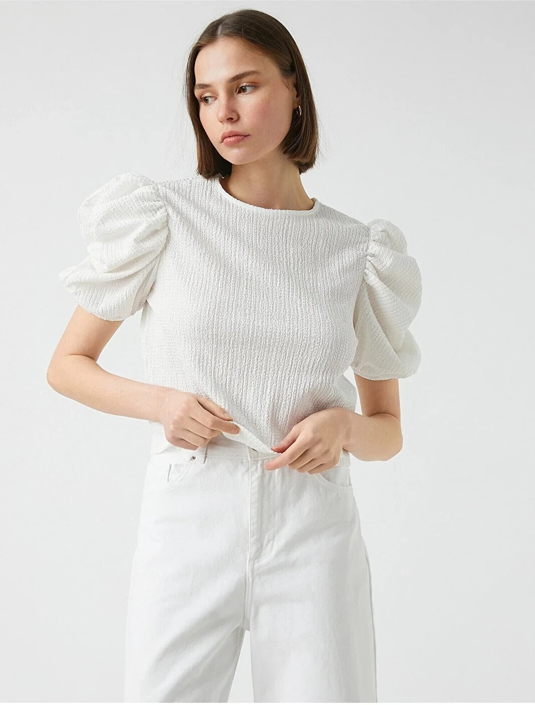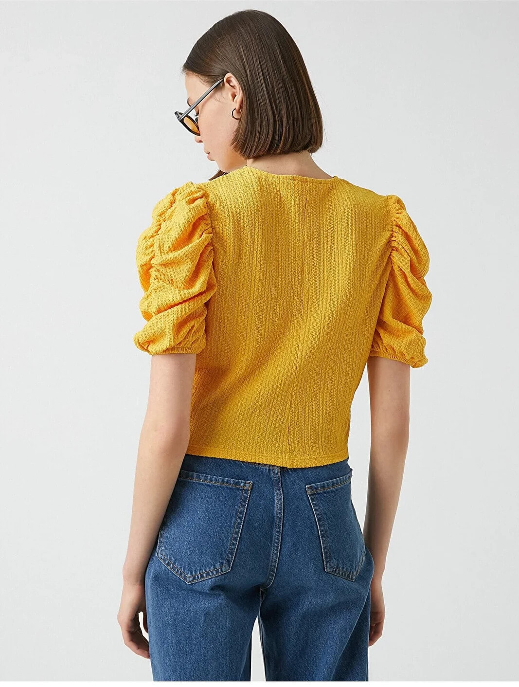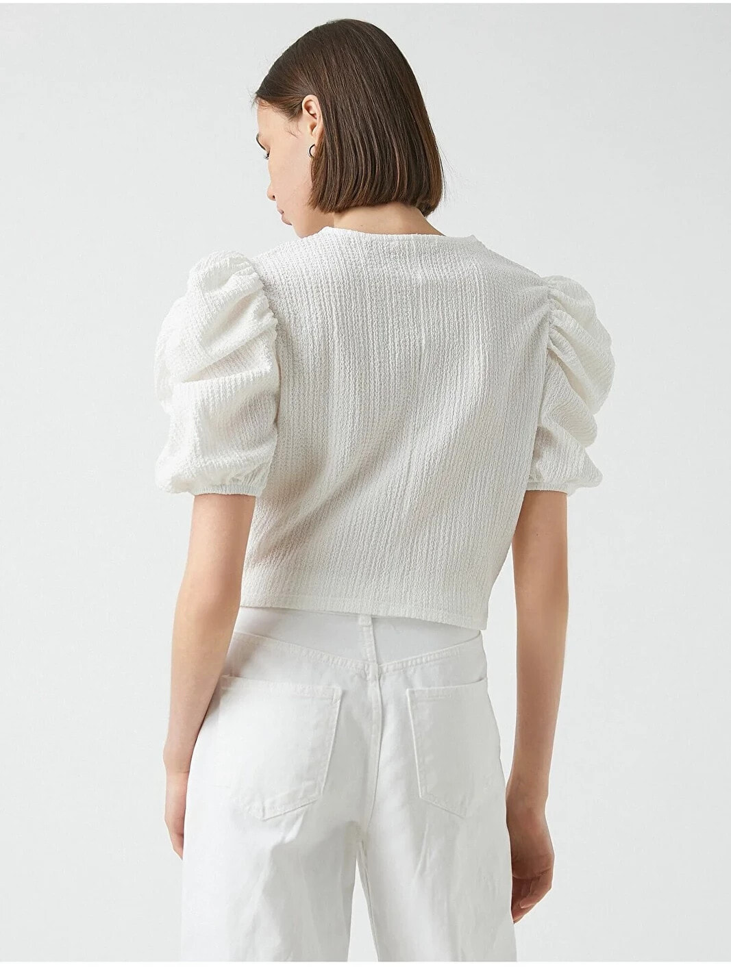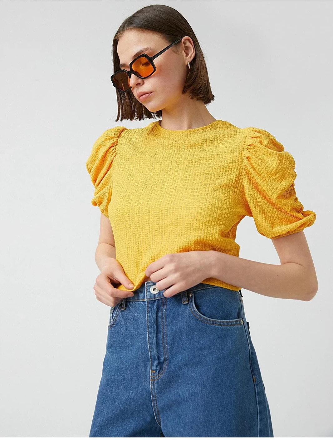 Büzgü detaylı, balon kollu, bisiklet yaka tişört. Model Bilgileri: Boy:173 cm, Göğüs:84, Bel:62, Kalça:89, Modelin Bedeni:S