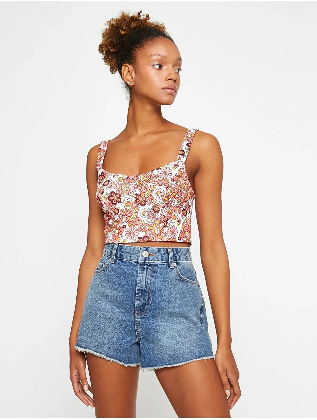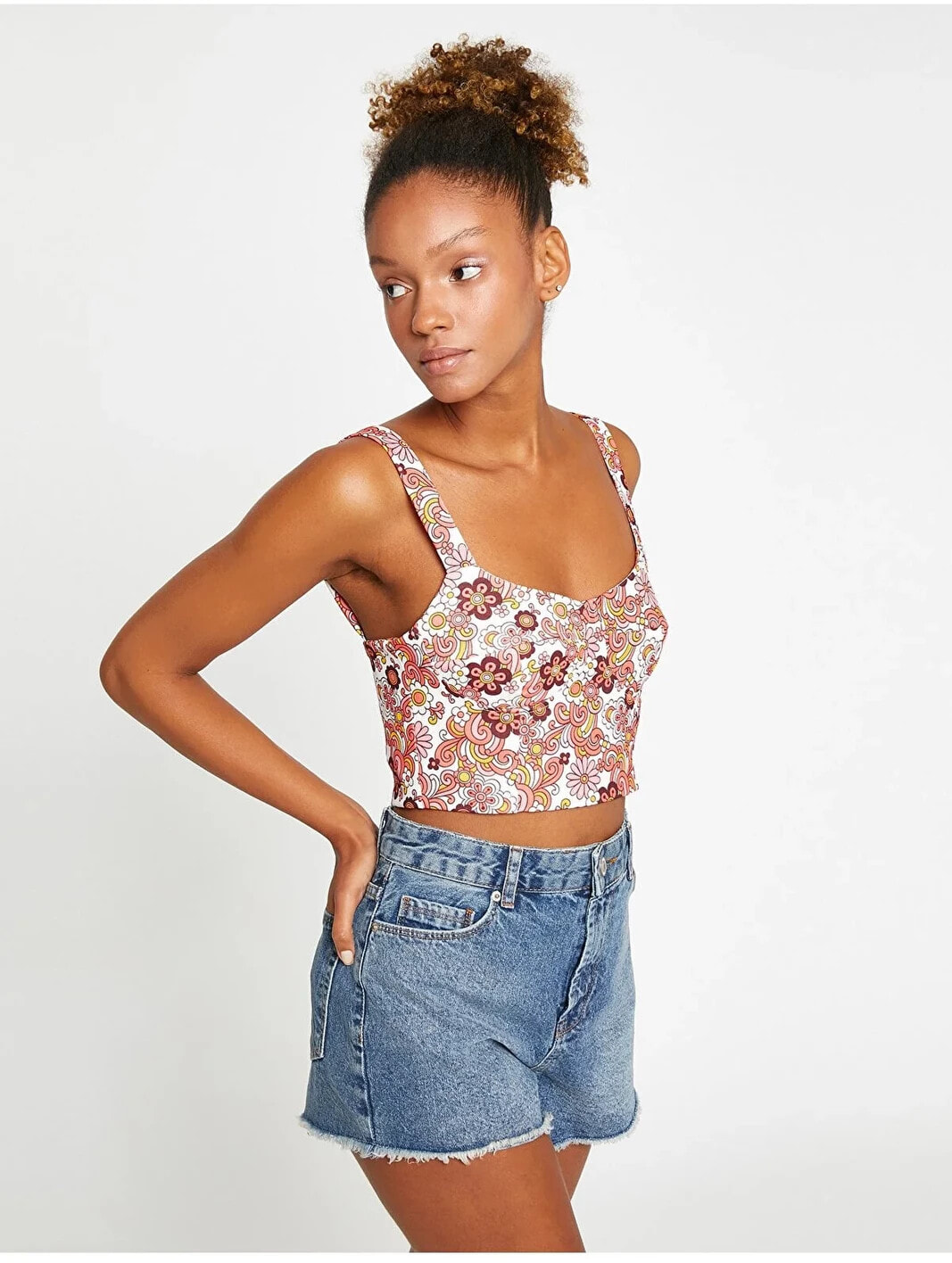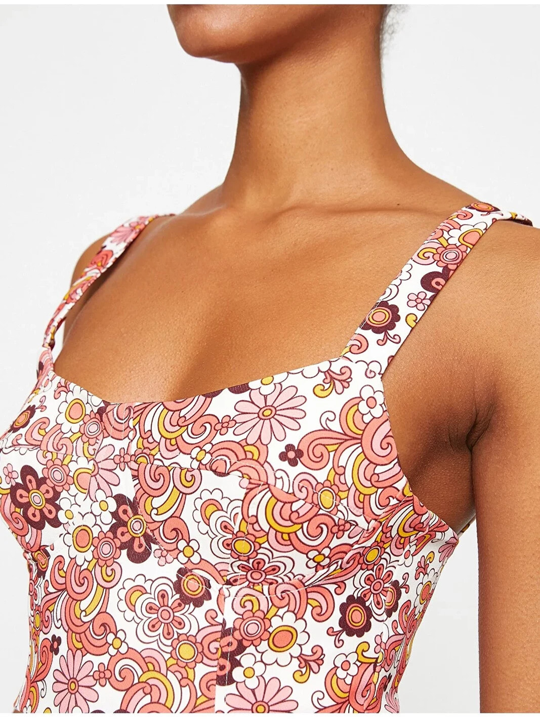 Çiçekli, askılı, göğüs kuplu, crop atlet.