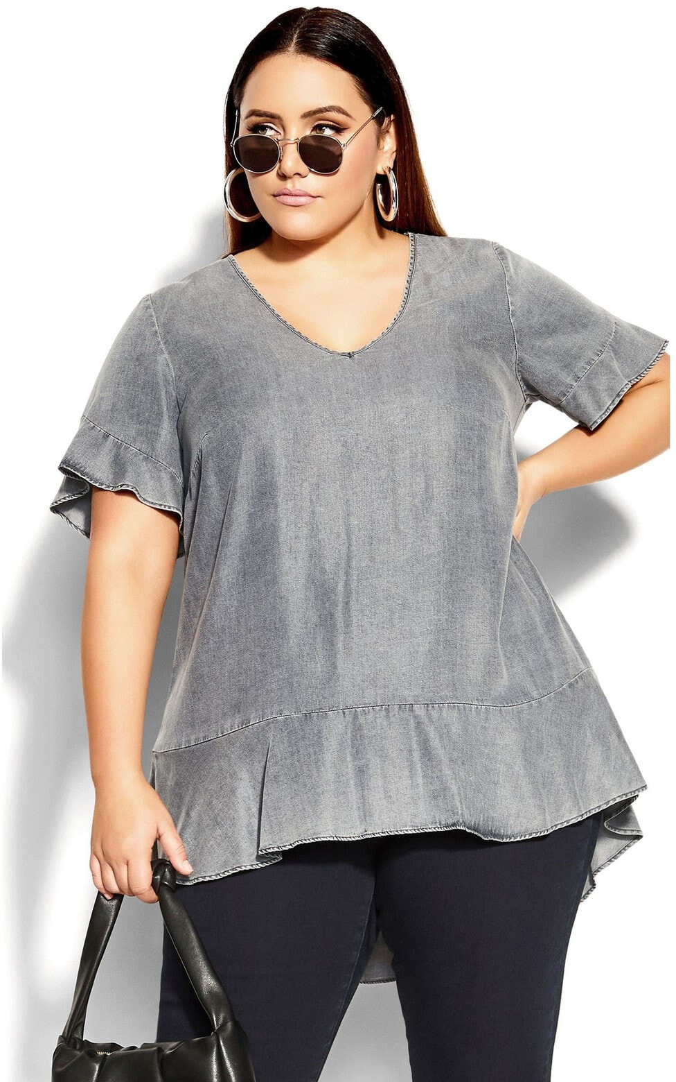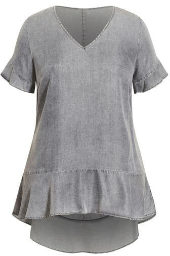 Rock a chic casual aesthetic in the laidback yet flirty styling of our Pared Frill Top! Featuring a V-neckline, frilled hemline and 100% lyocell construction, this casual top is perfect for shopping days, coffee catch up and everything in between. Key features include V-neckline, short sleeves, relaxed fit, 100% lyocell fabrication, frilled hemline, pull over style and hip length. Opt for a street-savvy vibe with ripped jeans, low-heeled sandals and sleek skinny sunglasses.