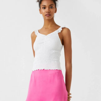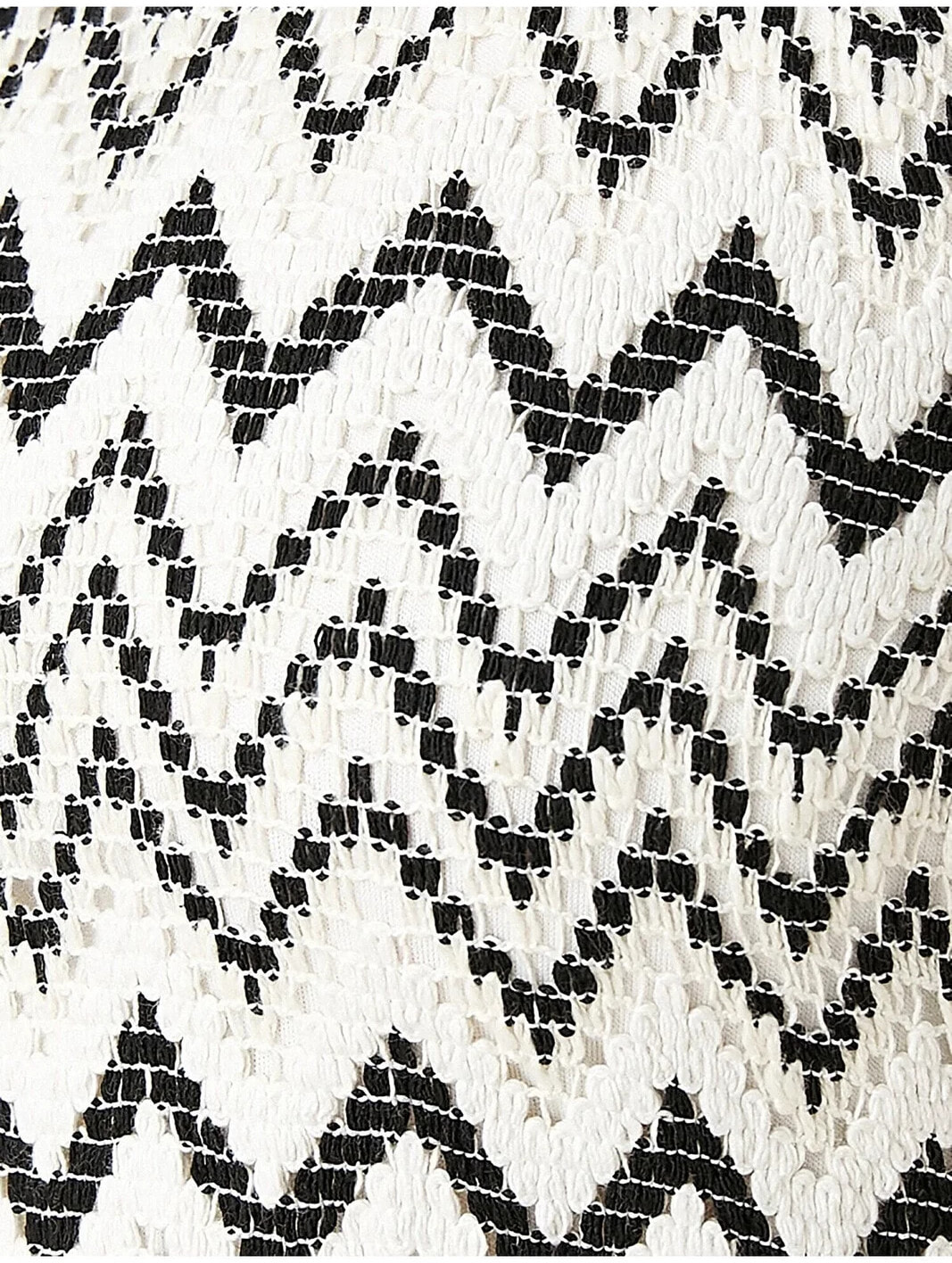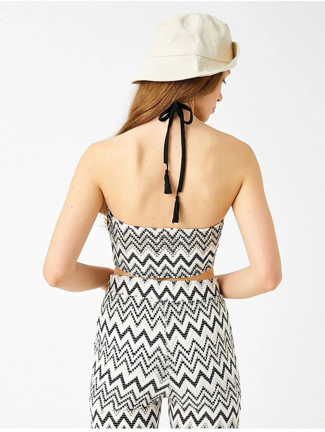 Boyundan bağlamalı, desenli, püsküllü, crop atlet. Model bilgileri:Boy:173 cm, göğüs:78, bel:57, kalça:87, modelin bedeni:S