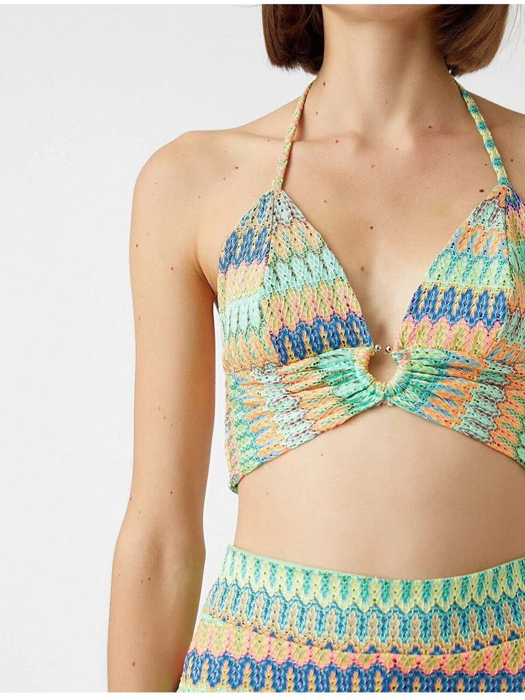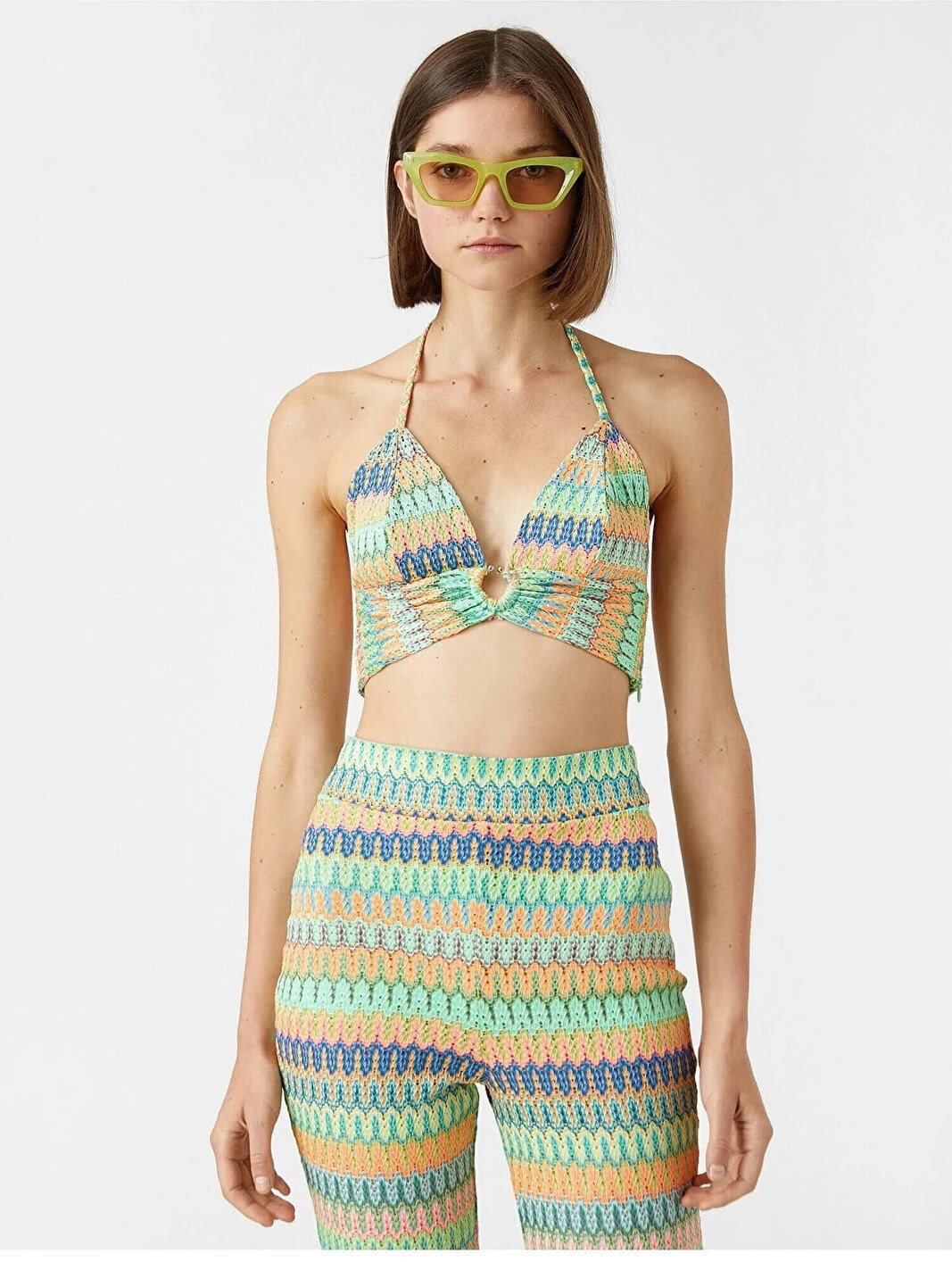 Boyundan bağlamalı, pencere detaylı, desenli, crop atlet. Model Bilgileri: Boy:175 cm, Göğüs:76, Bel:58, Kalça:1, Modelin Bedeni:S