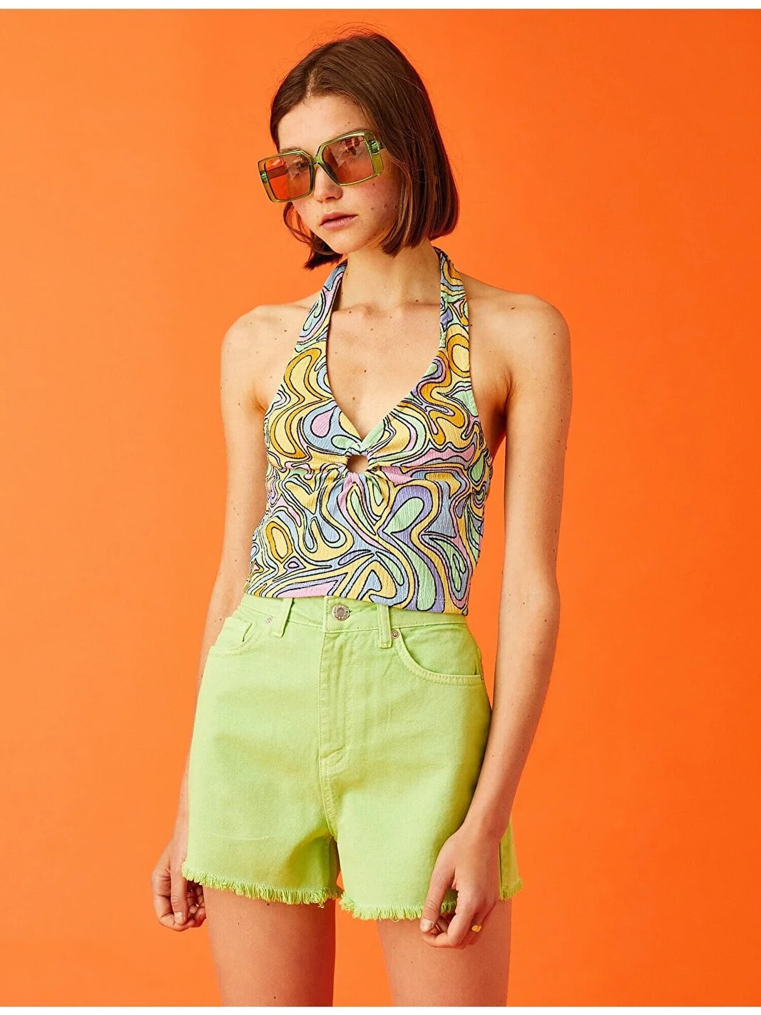 Pencere detaylı, desenli, halter yaka, crop atlet. Model Bilgileri: Boy:175 cm, Göğüs:76, Bel:58, Kalça:1, Modelin Bedeni:S