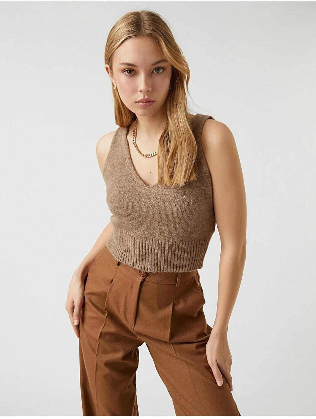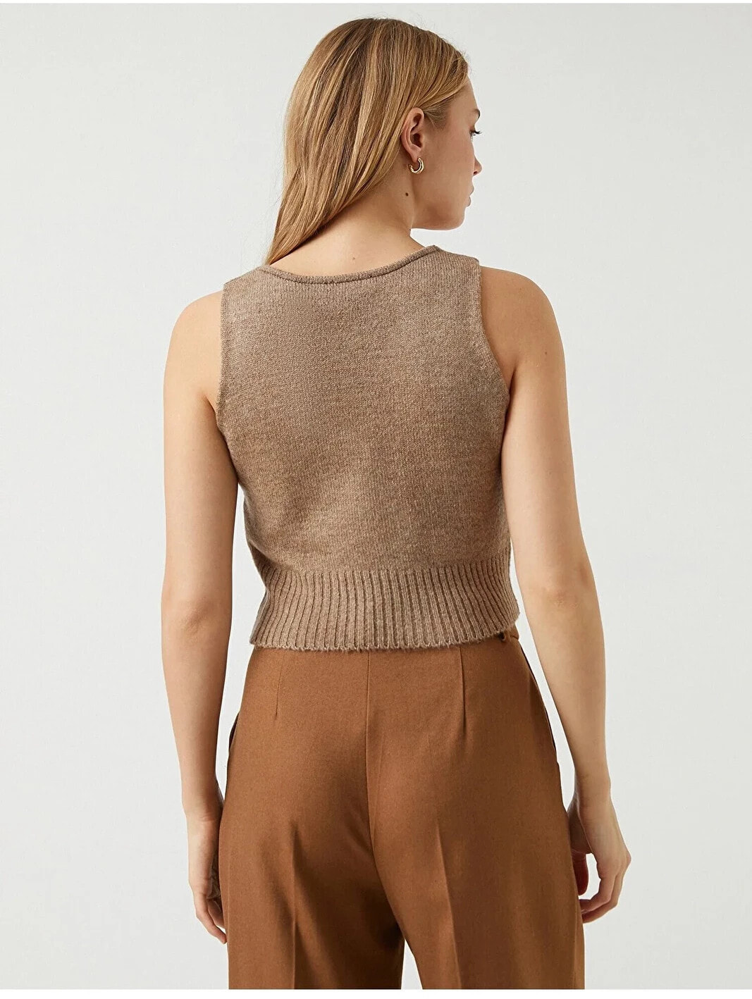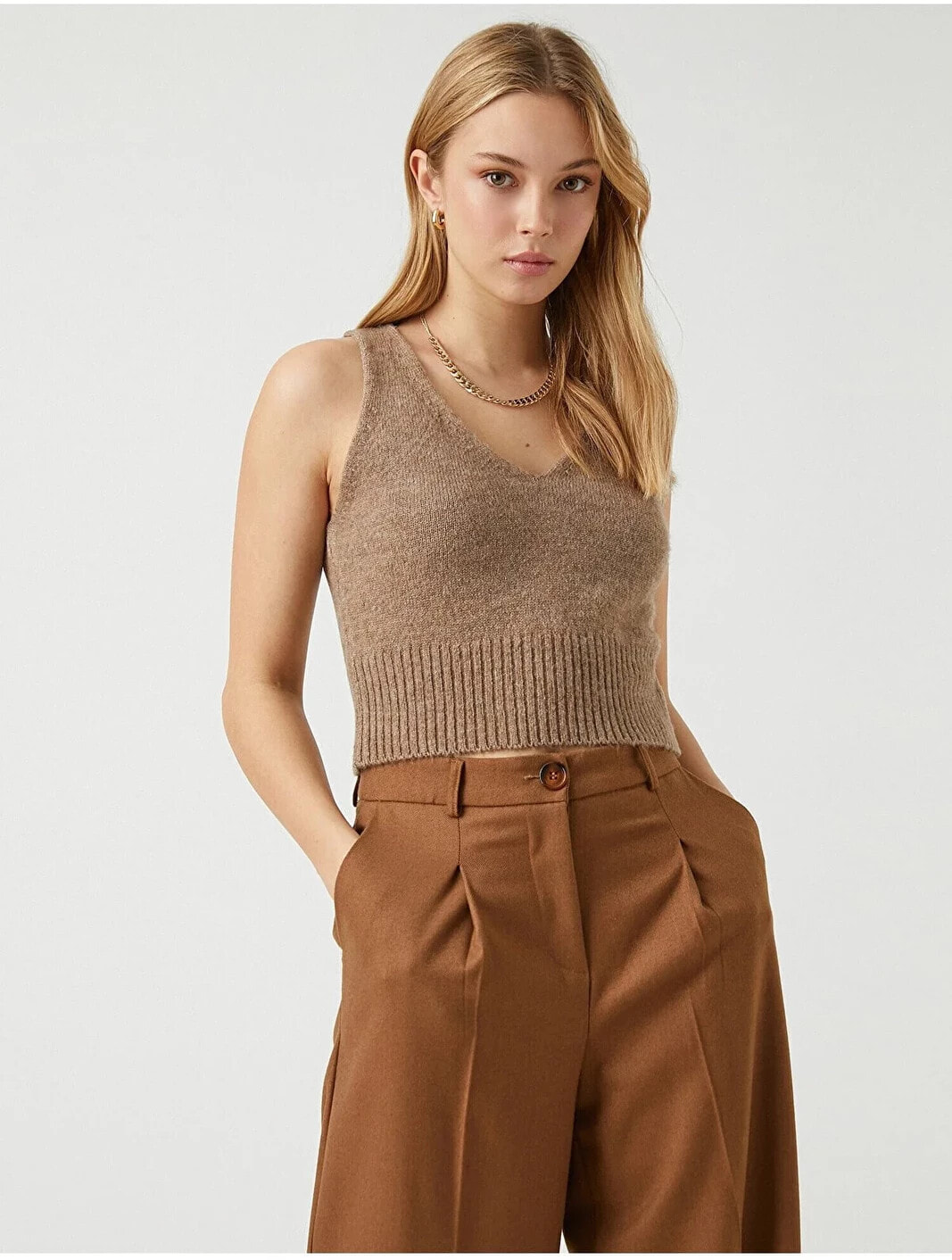 V yaka, örgü, crop atlet. Model Bilgileri: Boy:173 cm, Göğüs:79, Bel:58, Kalça:86, Modelin Bedeni:S