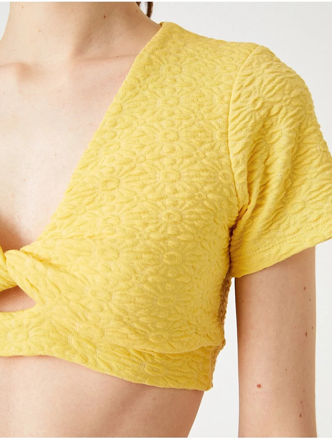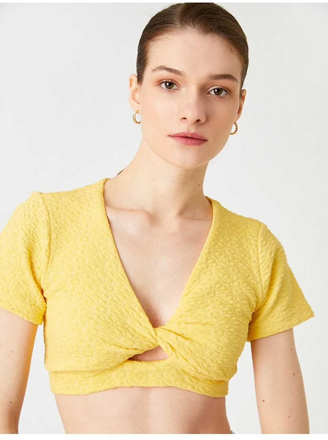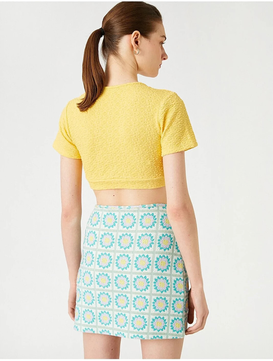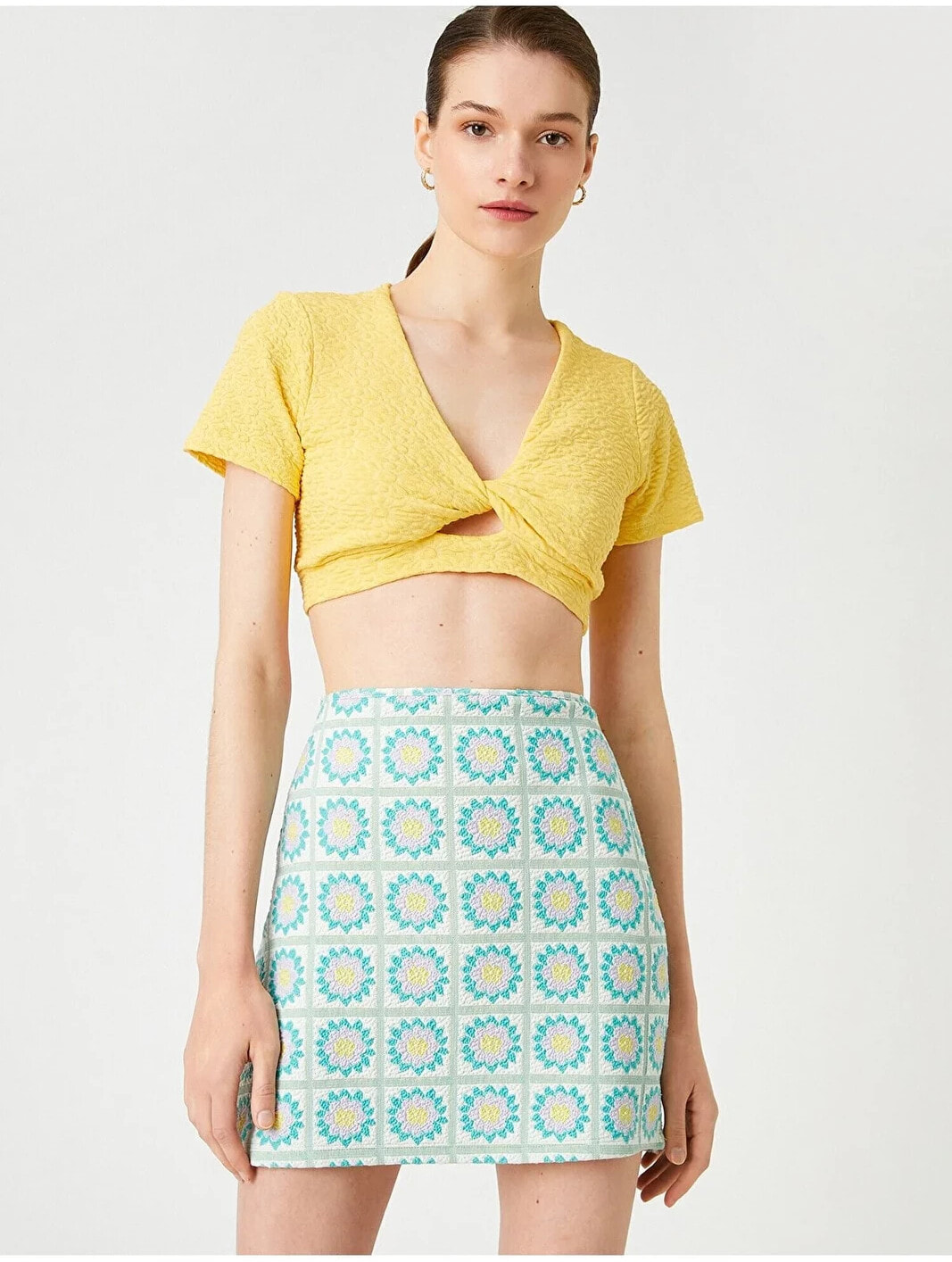 Kısa kollu, v yaka, pencere detaylı, desenli, crop atlet. Model bilgileri:Boy:177 cm, göğüs:80, bel:61, kalça:89, modelin bedeni:S