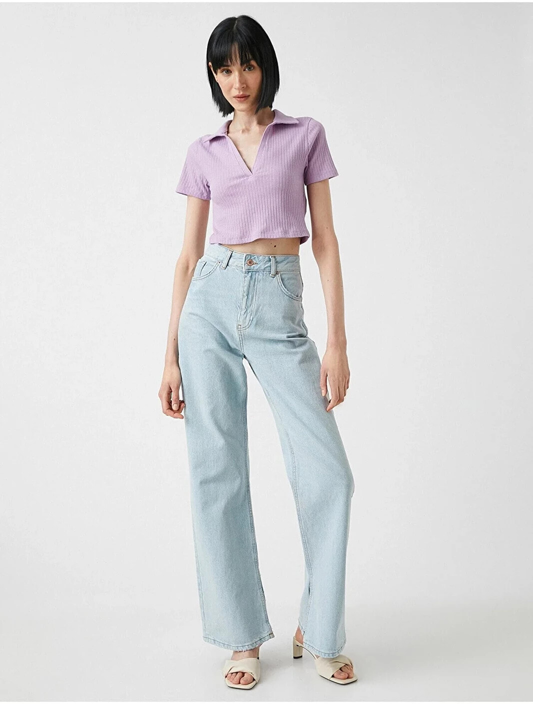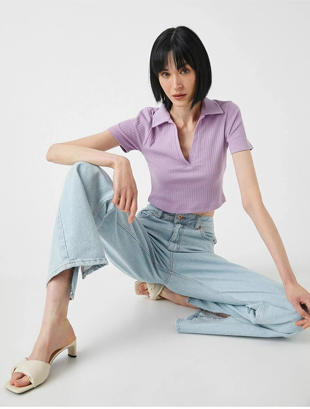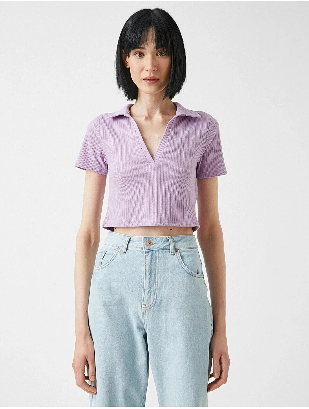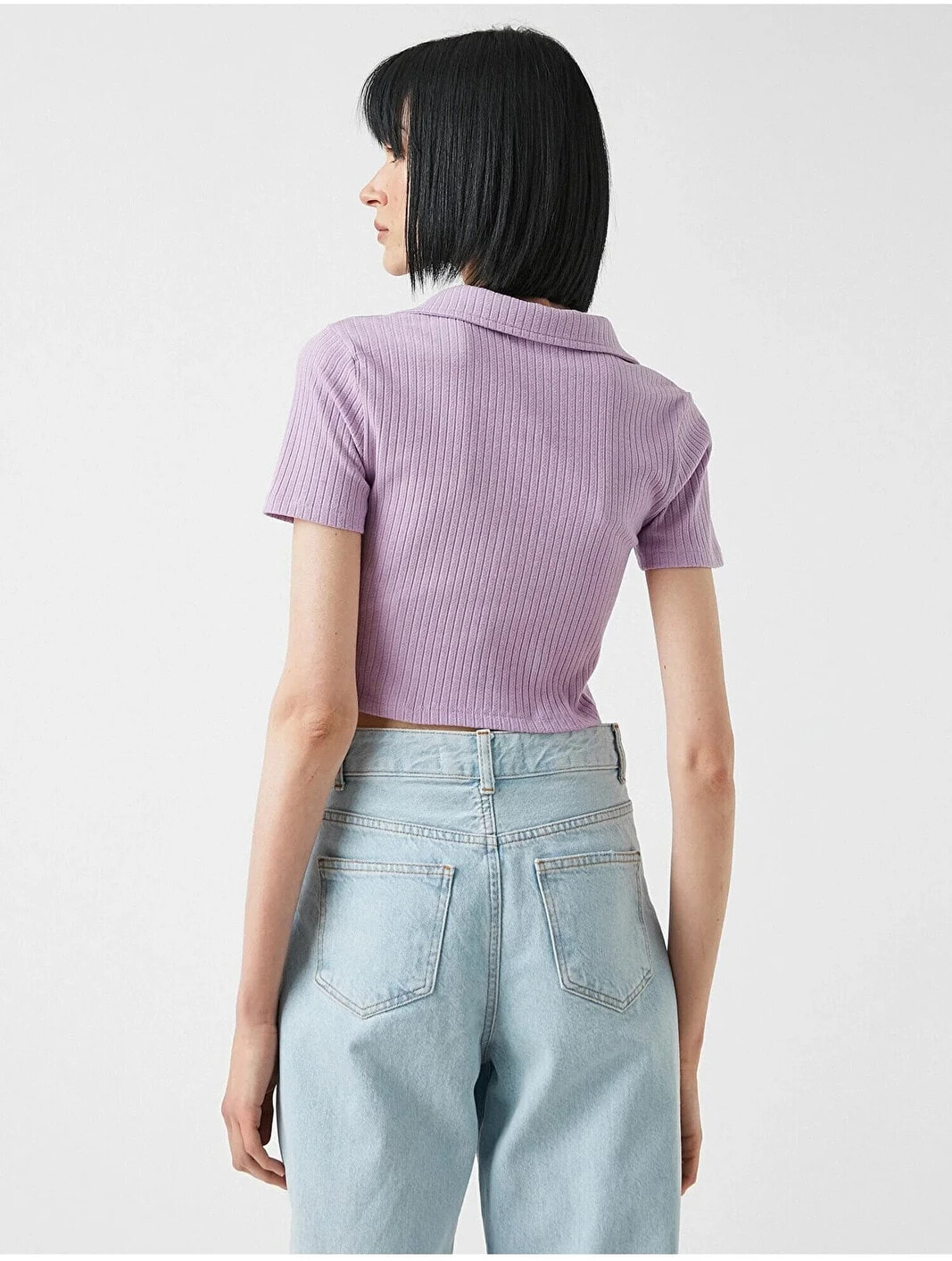 Kısa kollu, polo yaka, crop tişört. Model Bilgileri: Boy:178 cm, Göğüs:80, Bel:58, Kalça:88, Modelin Bedeni:S