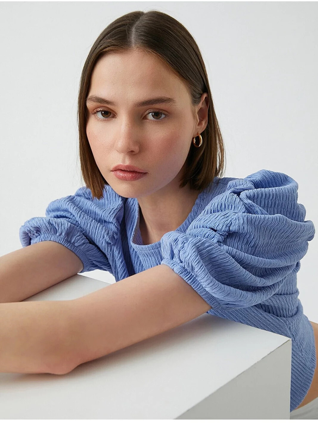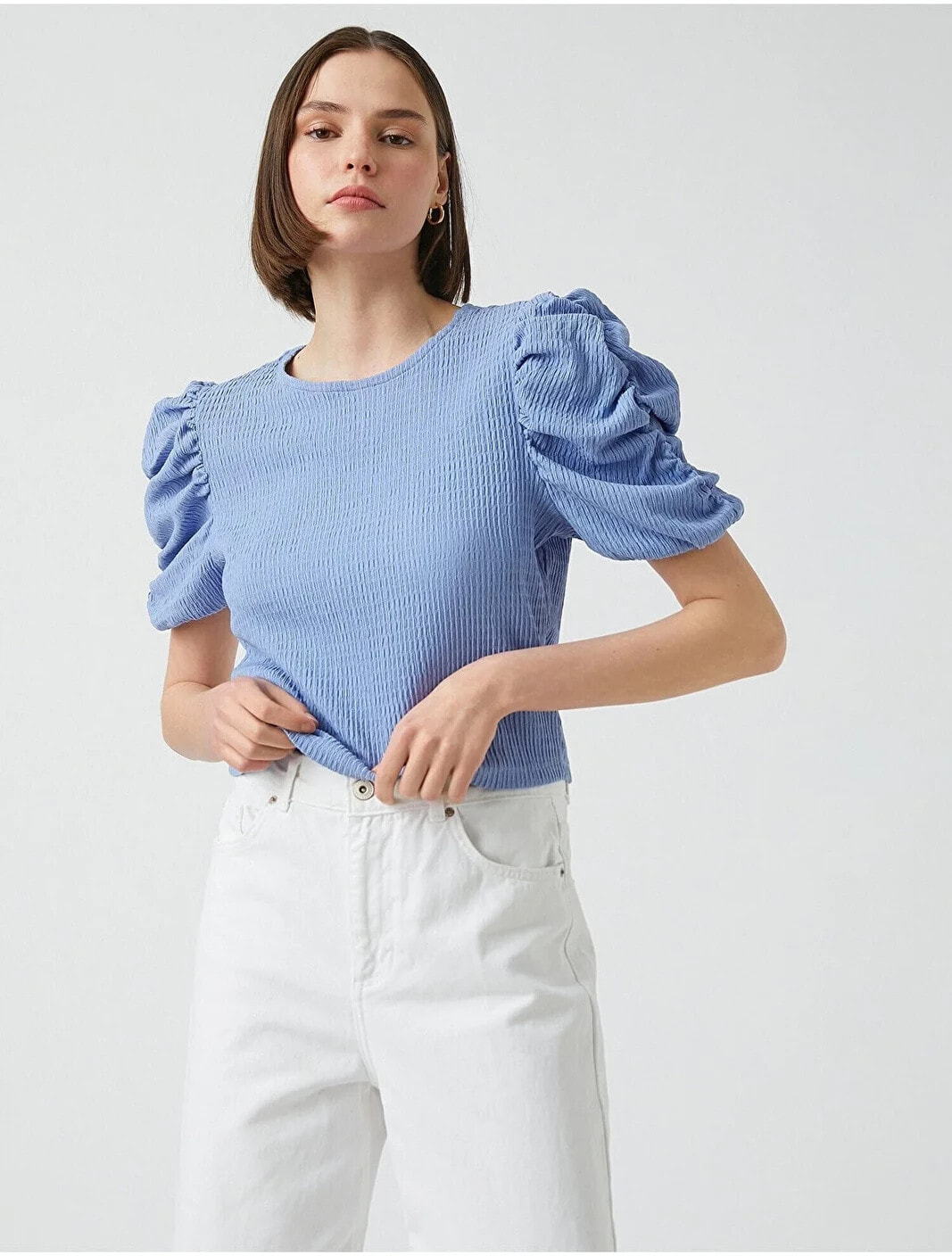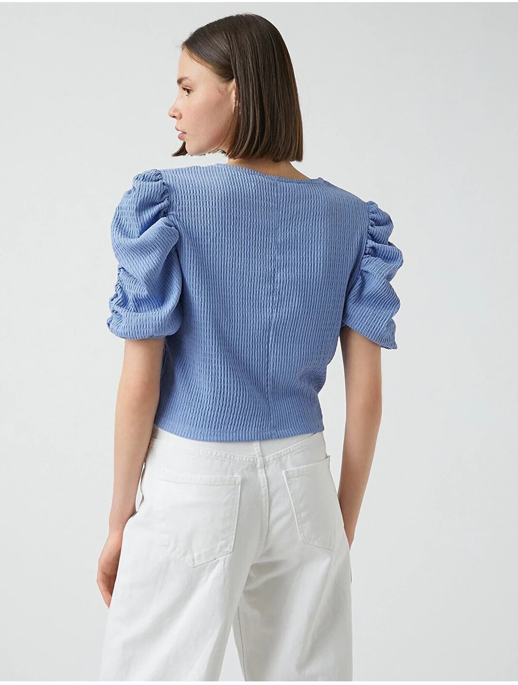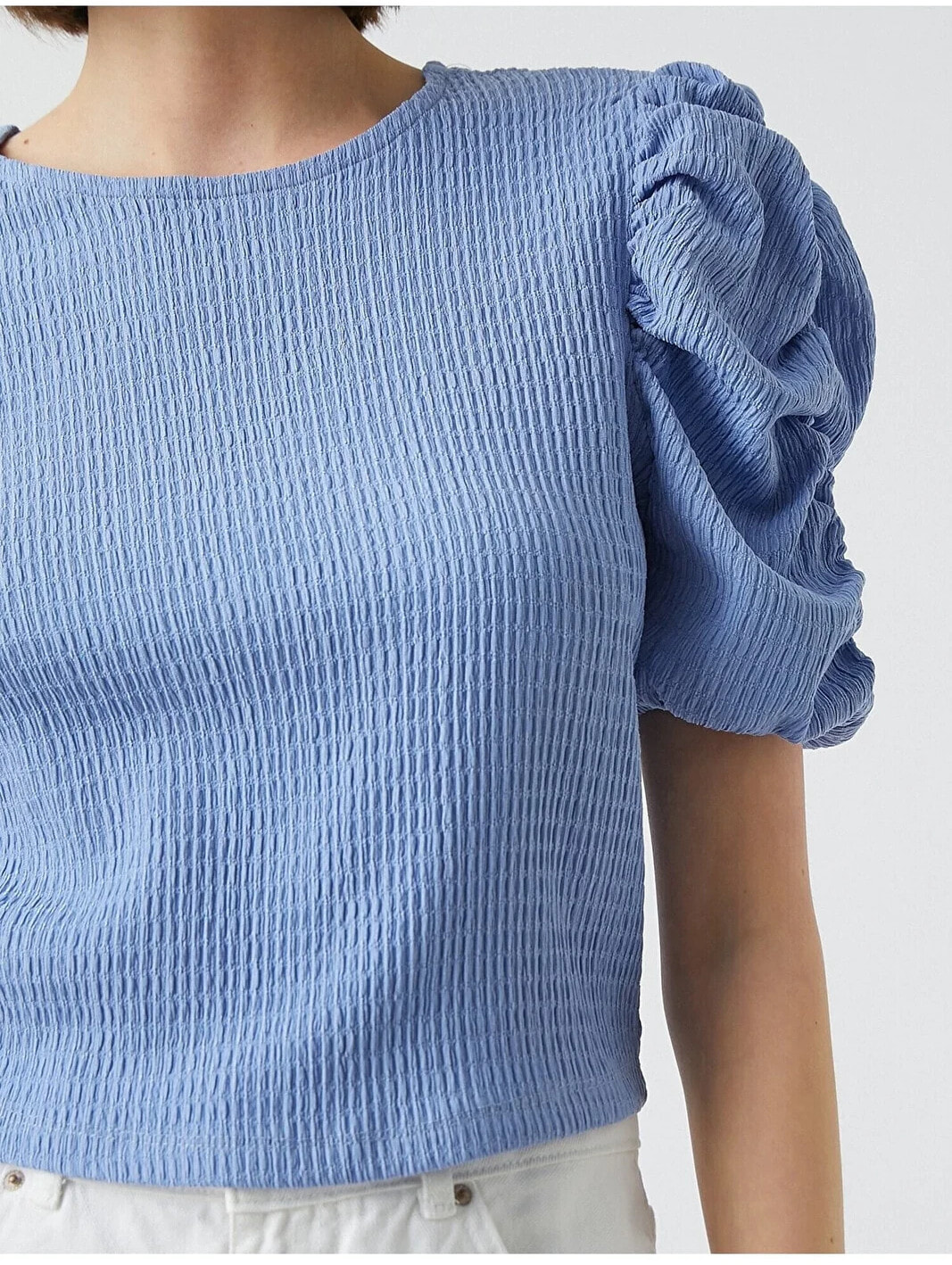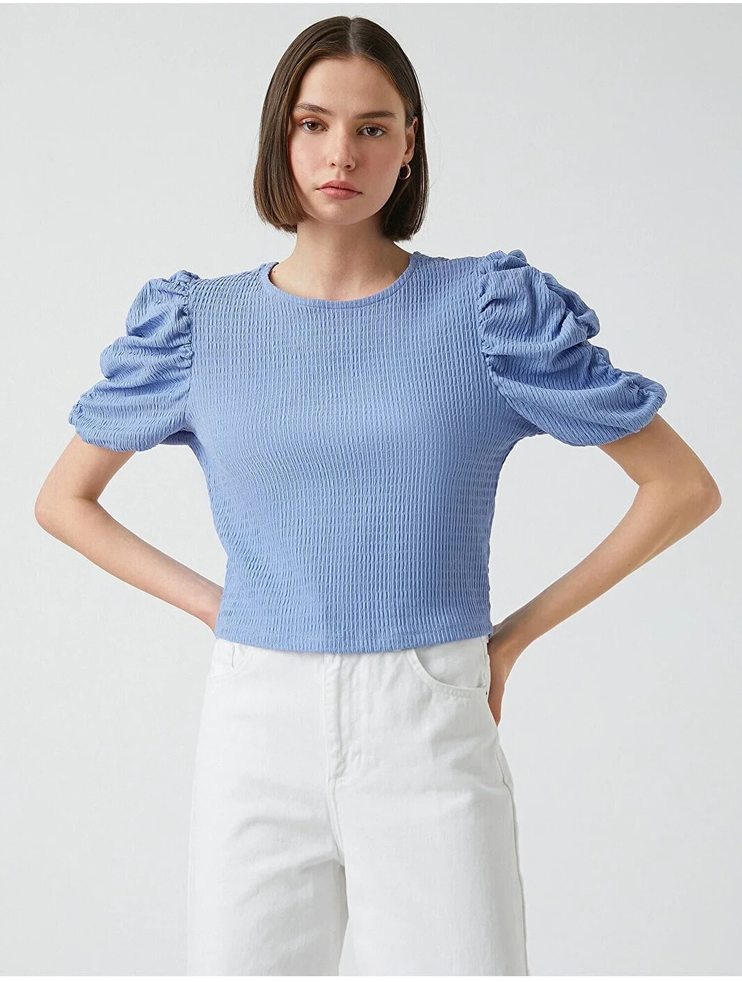 Balon kollu, bisiklet yaka, crop tişört. Model Bilgileri: Boy:173 cm, Göğüs:84, Bel:62, Kalça:89, Modelin Bedeni:S