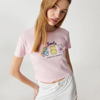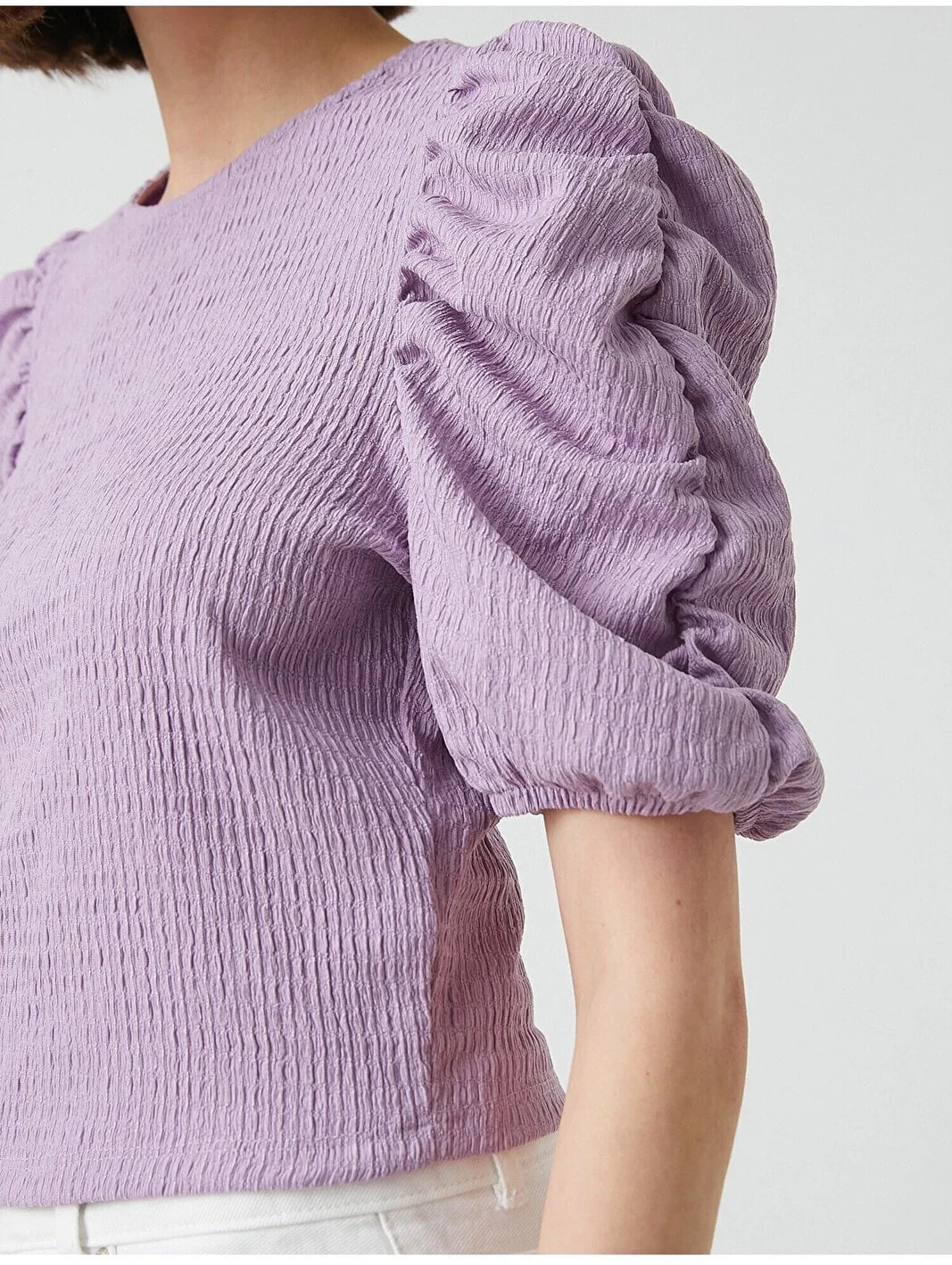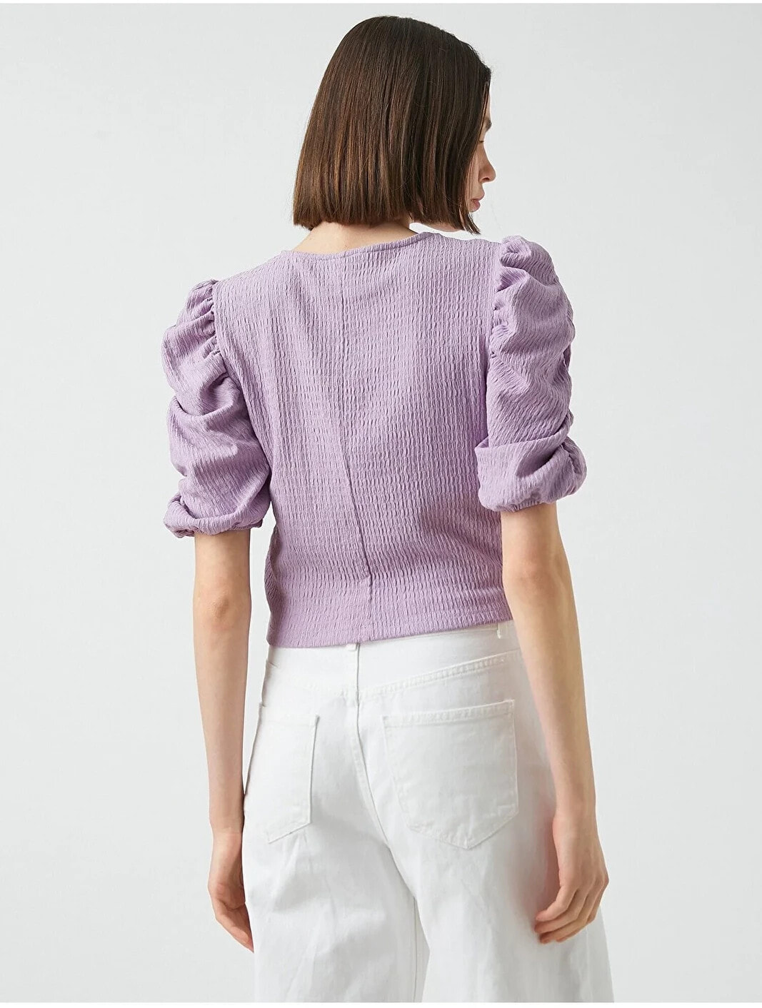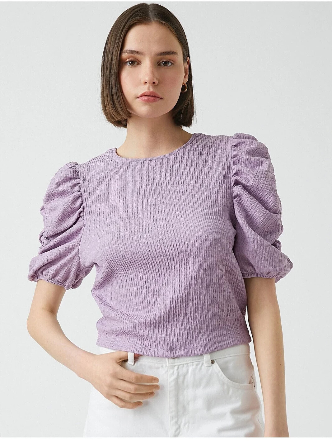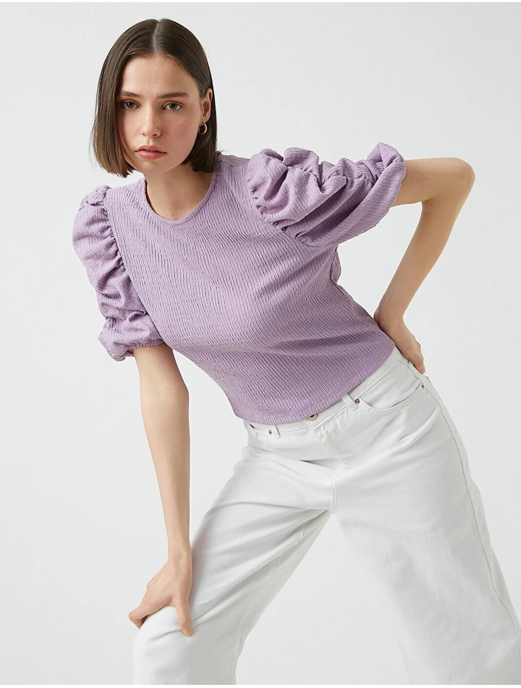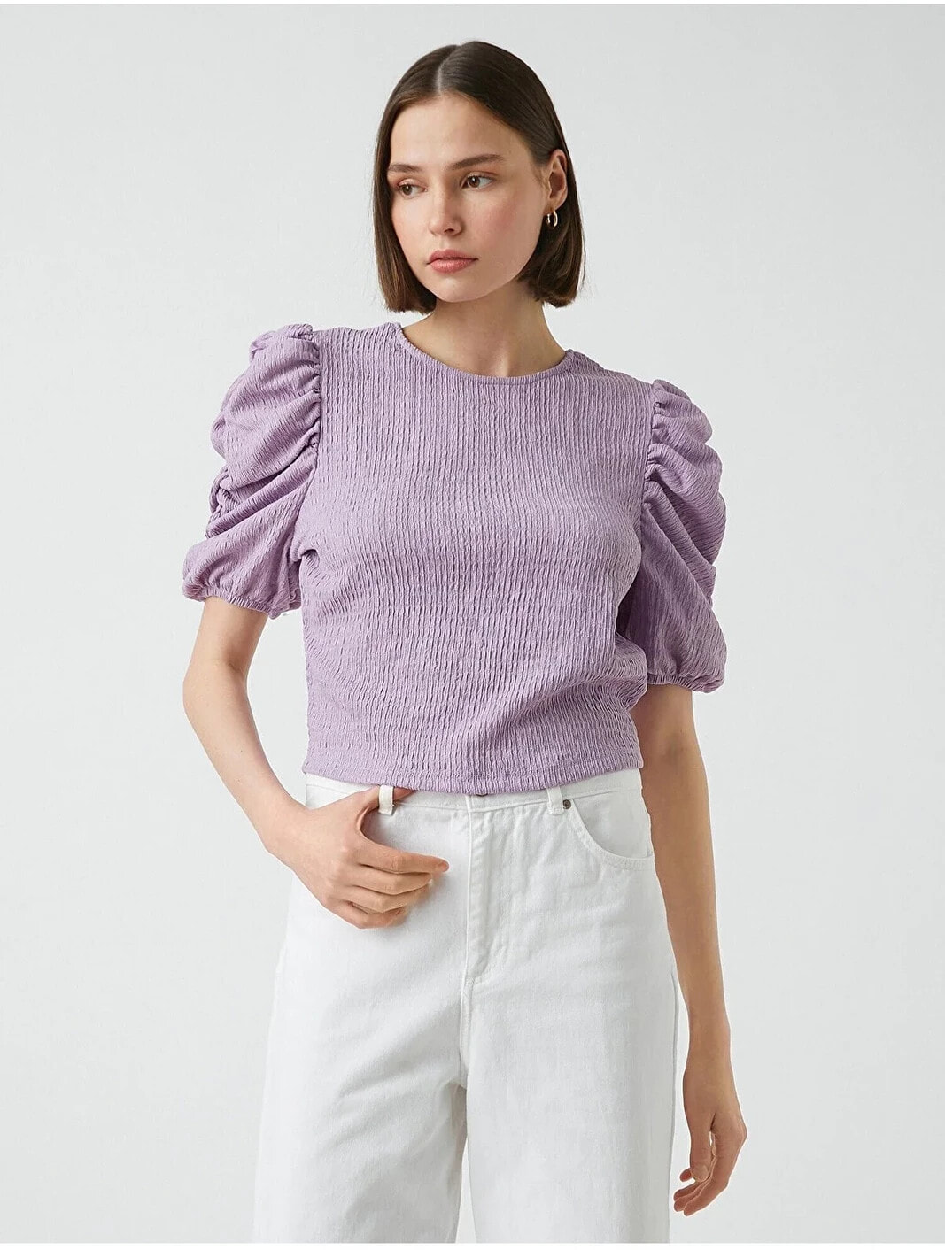 Balon kollu, bisiklet yaka, crop tişört. Model Bilgileri: Boy:173 cm, Göğüs:84, Bel:62, Kalça:89, Modelin Bedeni:S