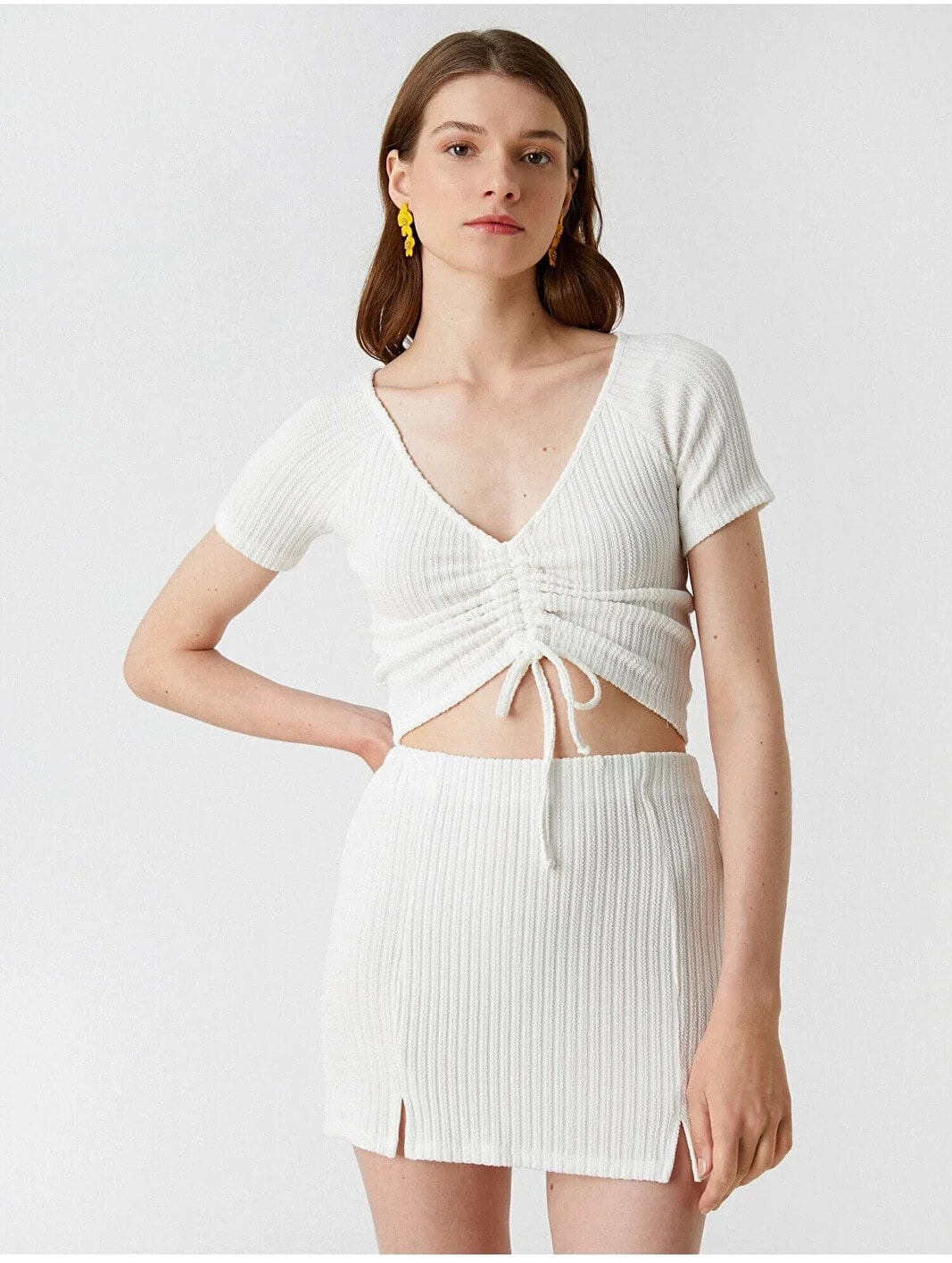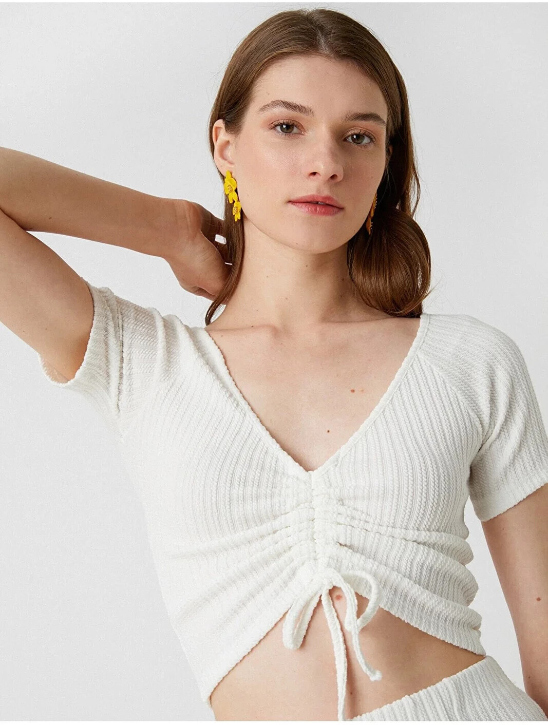 Tek başına anahtar bir görünümün parçası olan V yaka, büzgülü, crop tişört dinamik stiline havalı bir dokunuş sağlıyor. Model Bilgileri: Boy:177 cm, Göğüs:80, Bel:61, Kalça:89, Modelin Bedeni:S