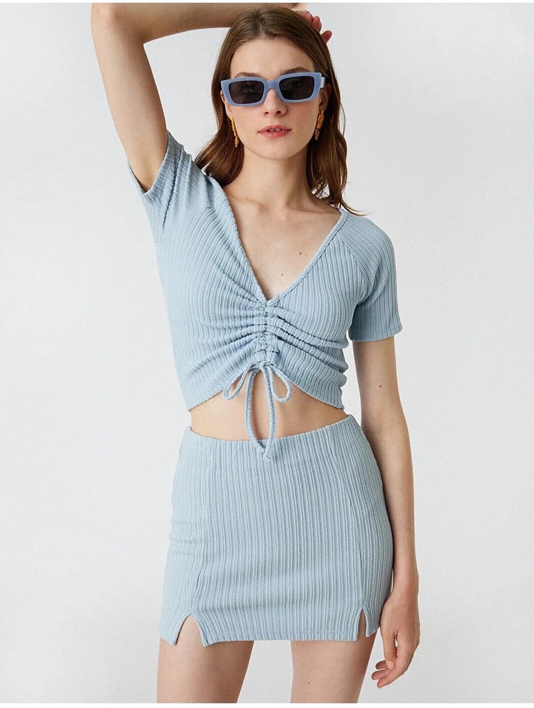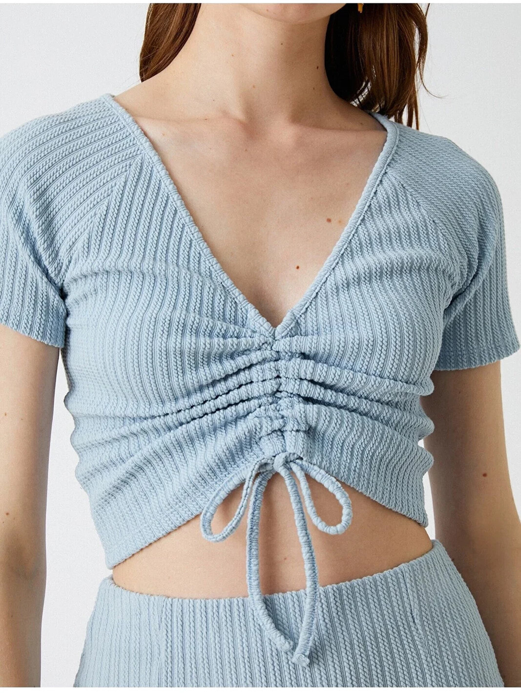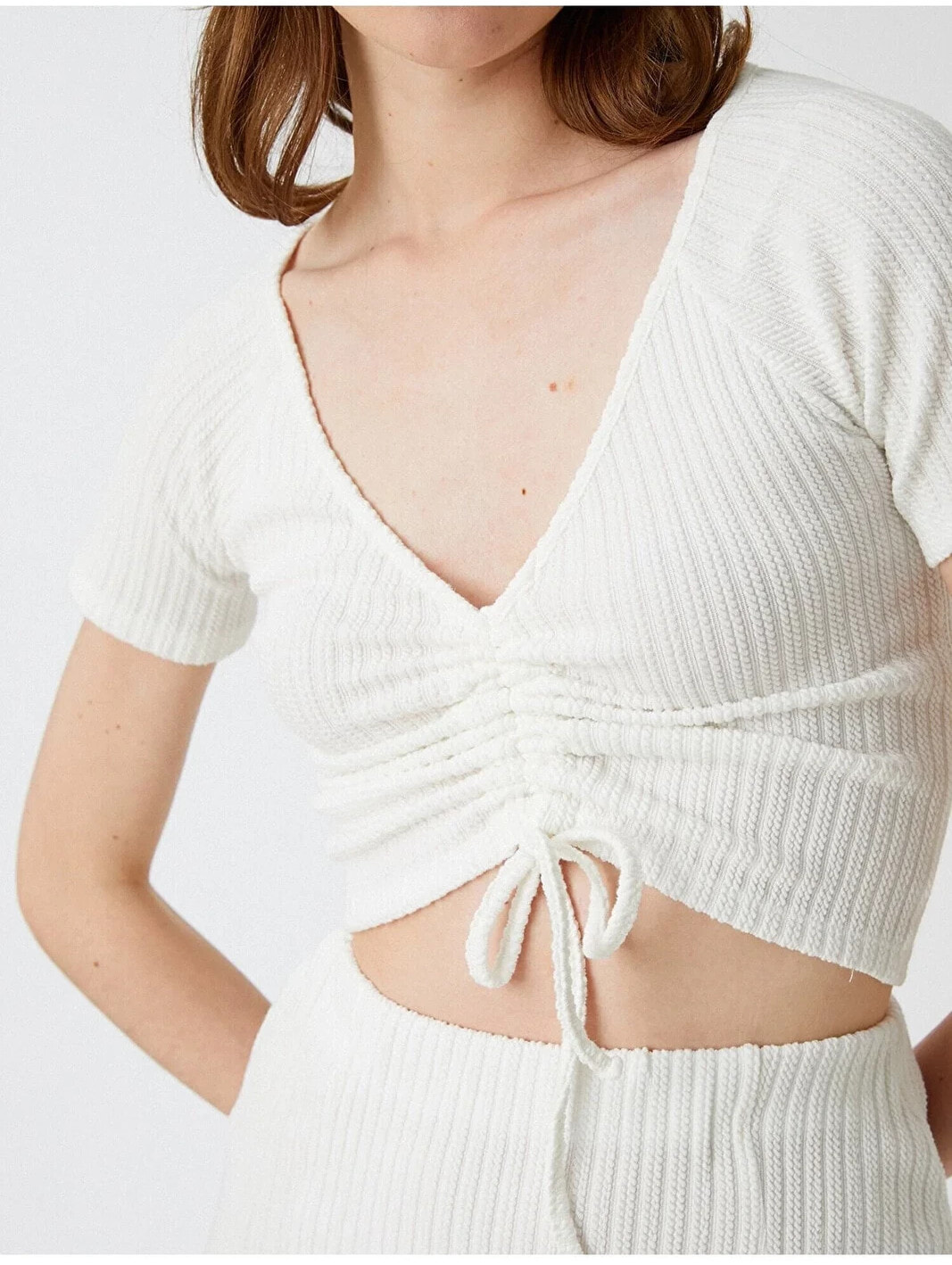 Tek başına anahtar bir görünümün parçası olan V yaka, büzgülü, crop tişört dinamik stiline havalı bir dokunuş sağlıyor. Model Bilgileri: Boy:177 cm, Göğüs:80, Bel:61, Kalça:89, Modelin Bedeni:S