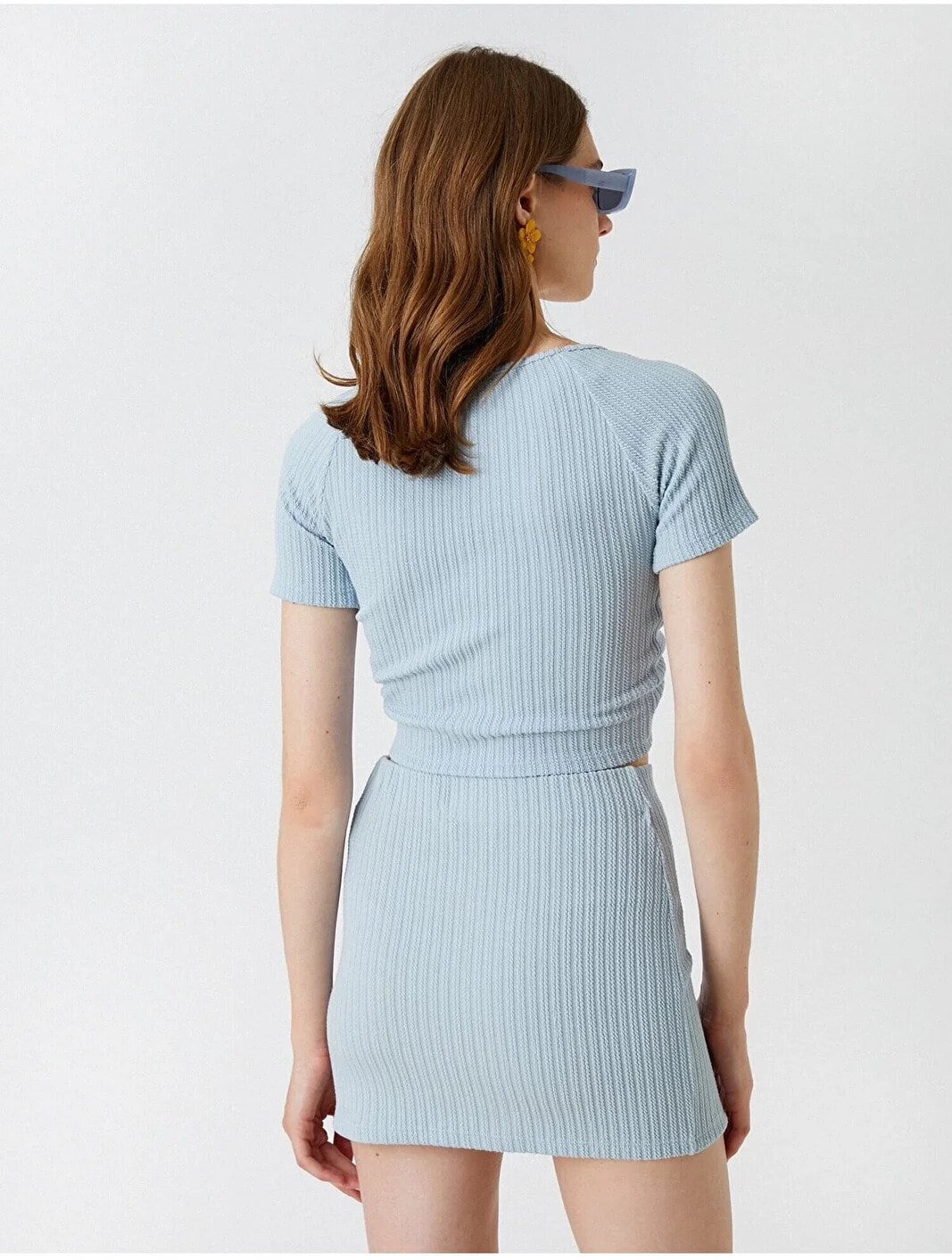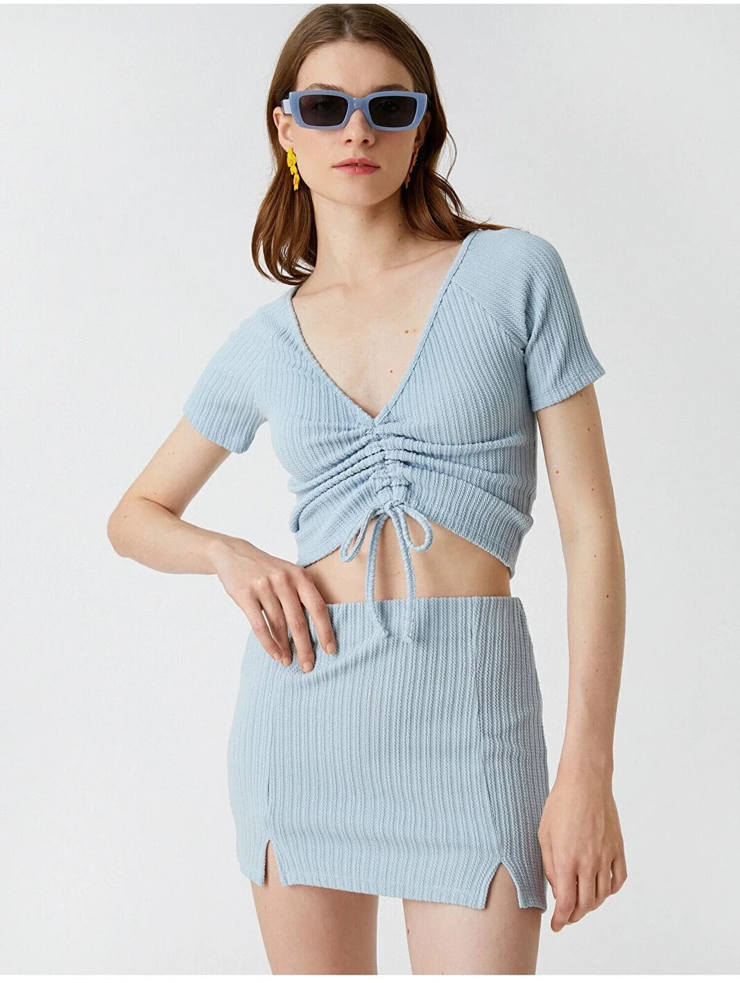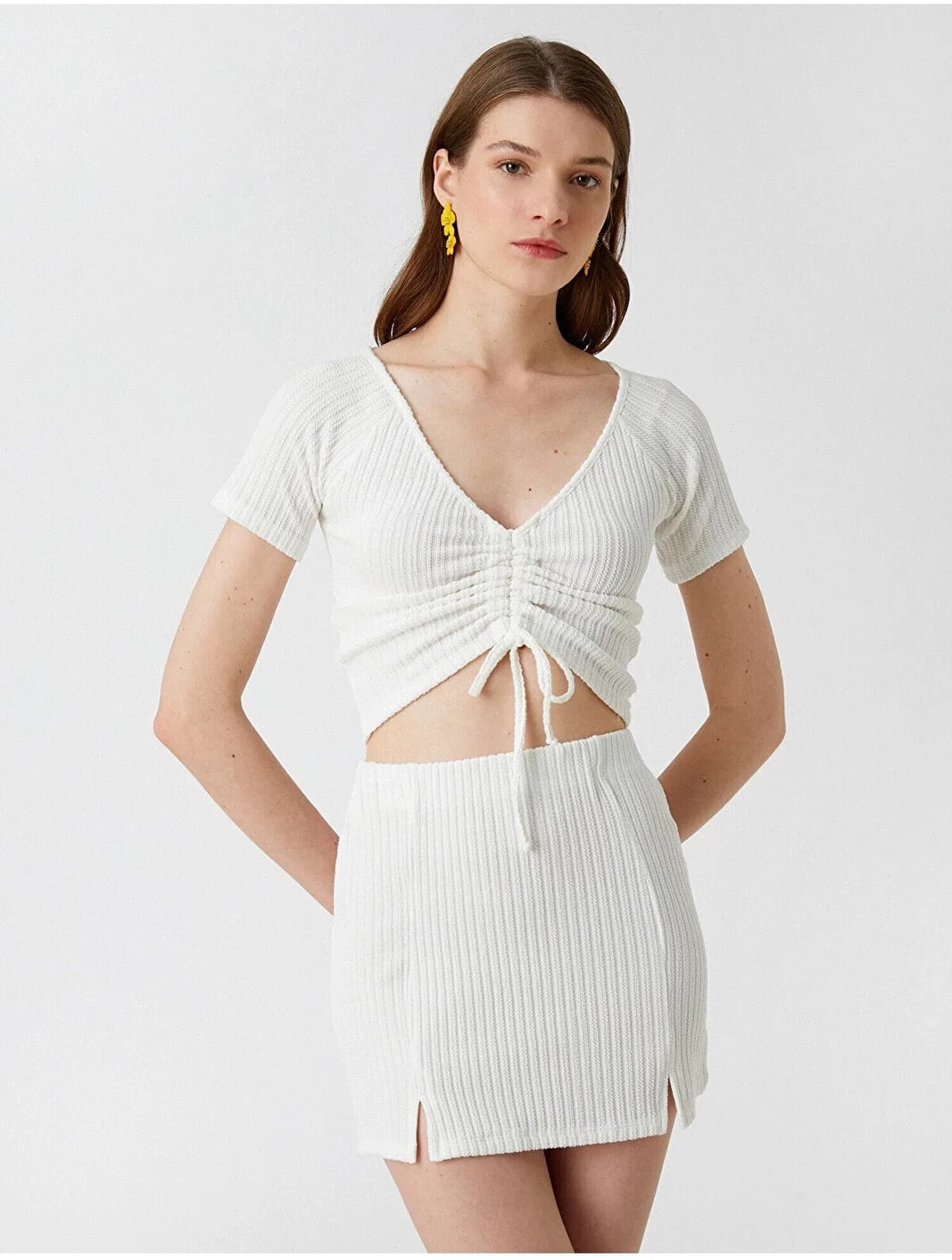 Tek başına anahtar bir görünümün parçası olan V yaka, büzgülü, crop tişört dinamik stiline havalı bir dokunuş sağlıyor. Model Bilgileri: Boy:177 cm, Göğüs:80, Bel:61, Kalça:89, Modelin Bedeni:S