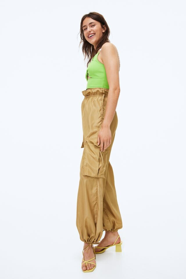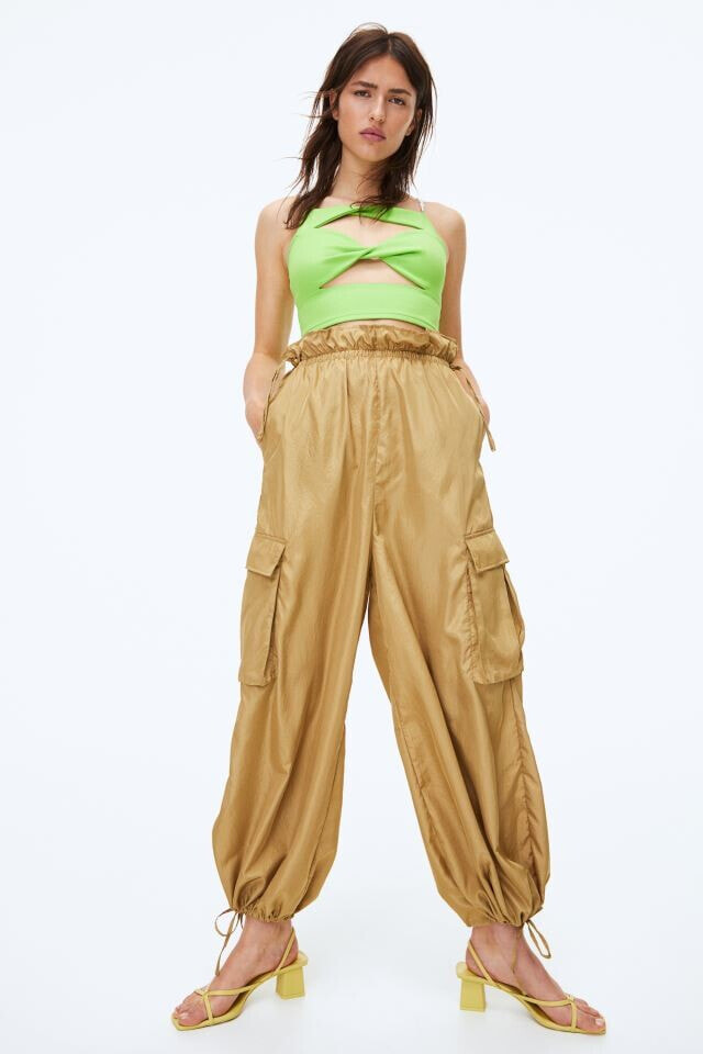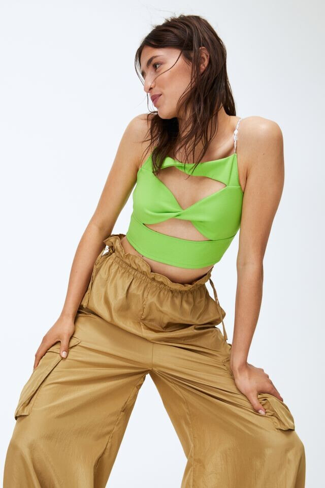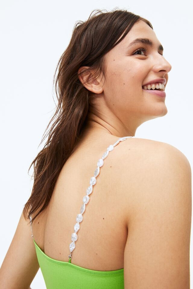 Sleeveless, fitted top in jersey. Narrow, detachable shoulder straps embellished with pearlescent plastic beads. Cut-out sections at front with a twisted design.