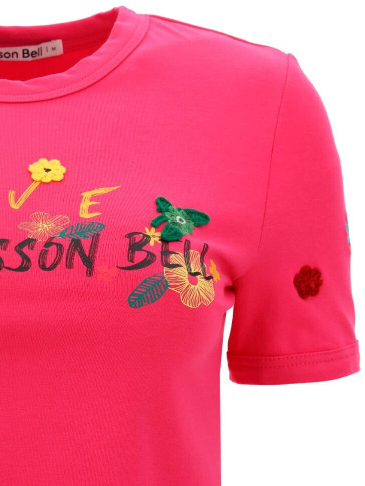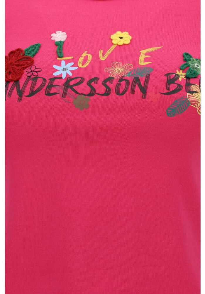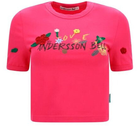 Cotton Dasha T-Shirt by Andersson Bell, ribbed crew neck, cropped pattern iconic contrasting brand monogram on front, all-over embroidered multicolored flowers, regular fit.