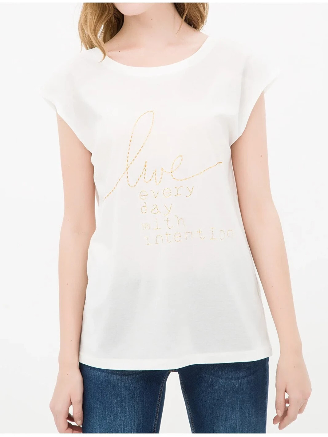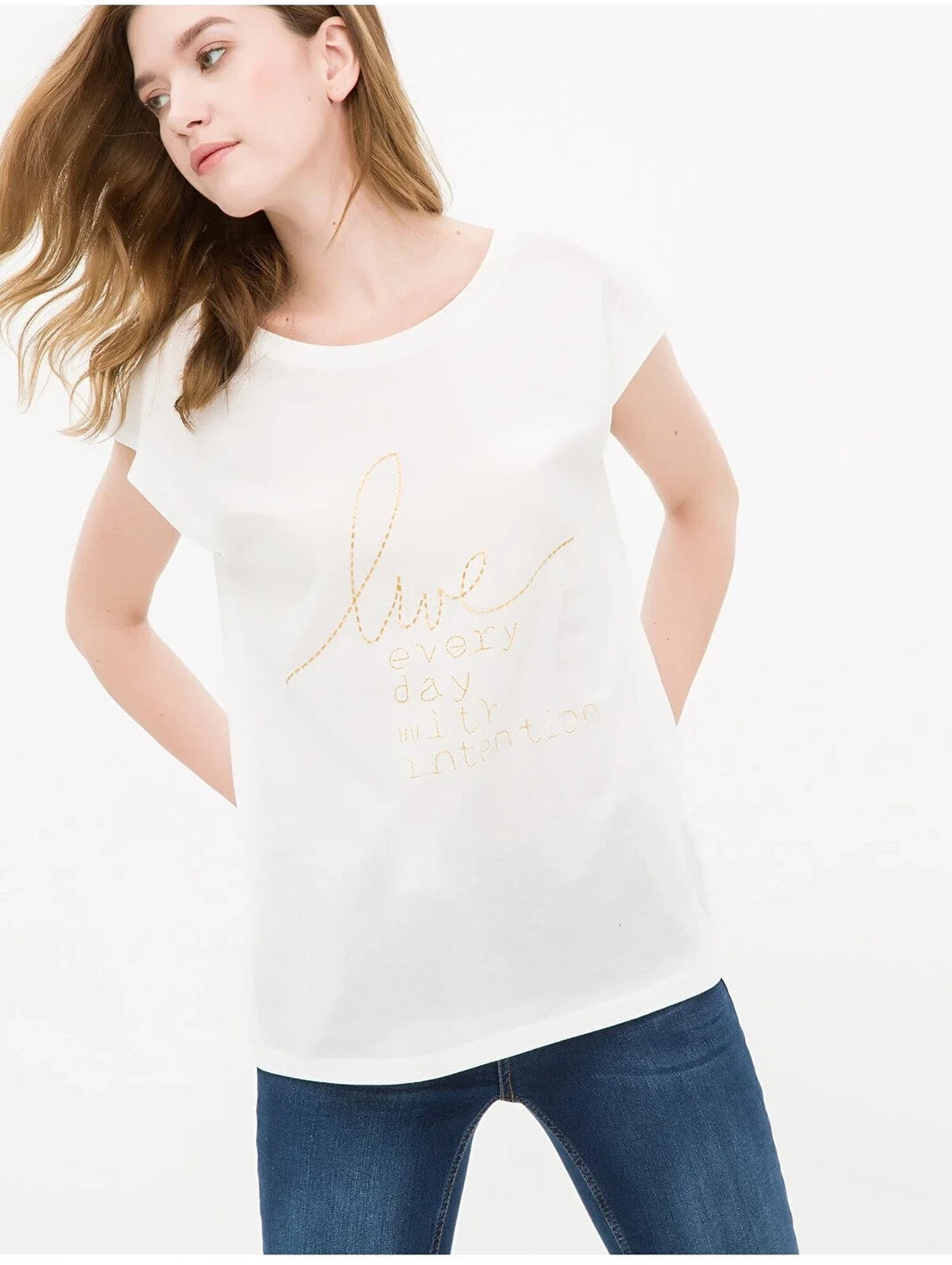 Degaje Yaka, Kolsuz , Rahat Kesim, Baskılı T-Shirt Model Bilgileri: Boy:175 cm, Göğüs:84, Bel:60, Kalça:89, Modelin Bedeni:S