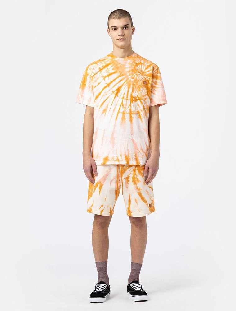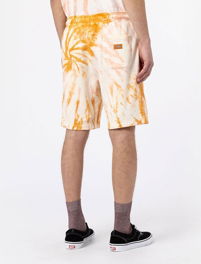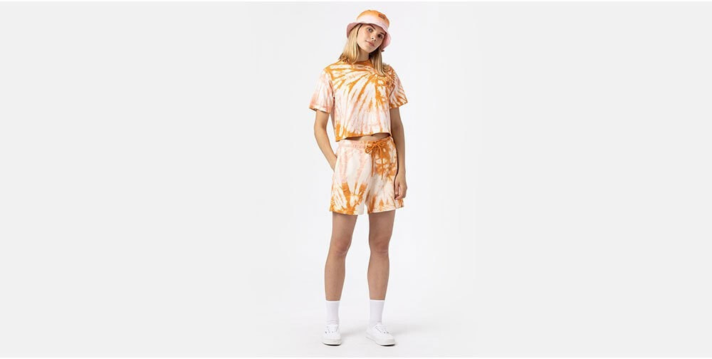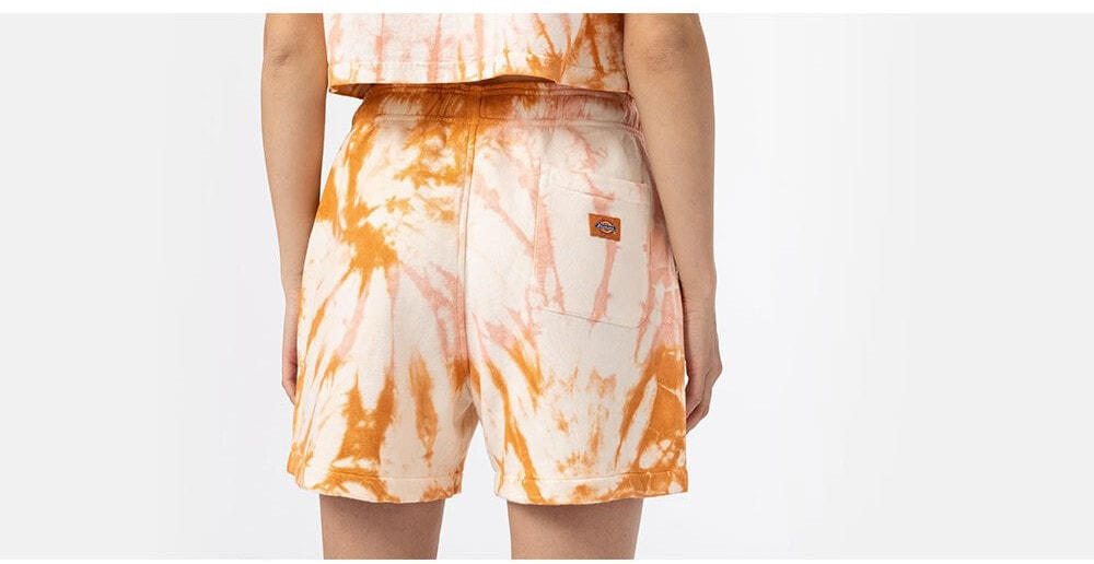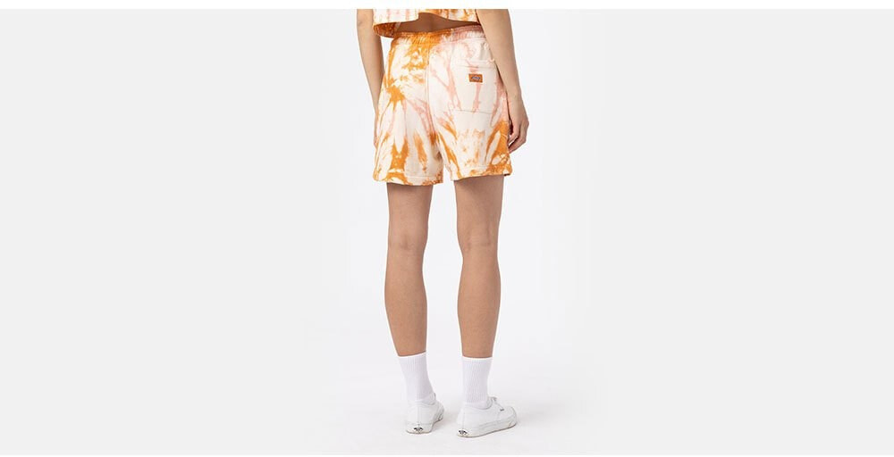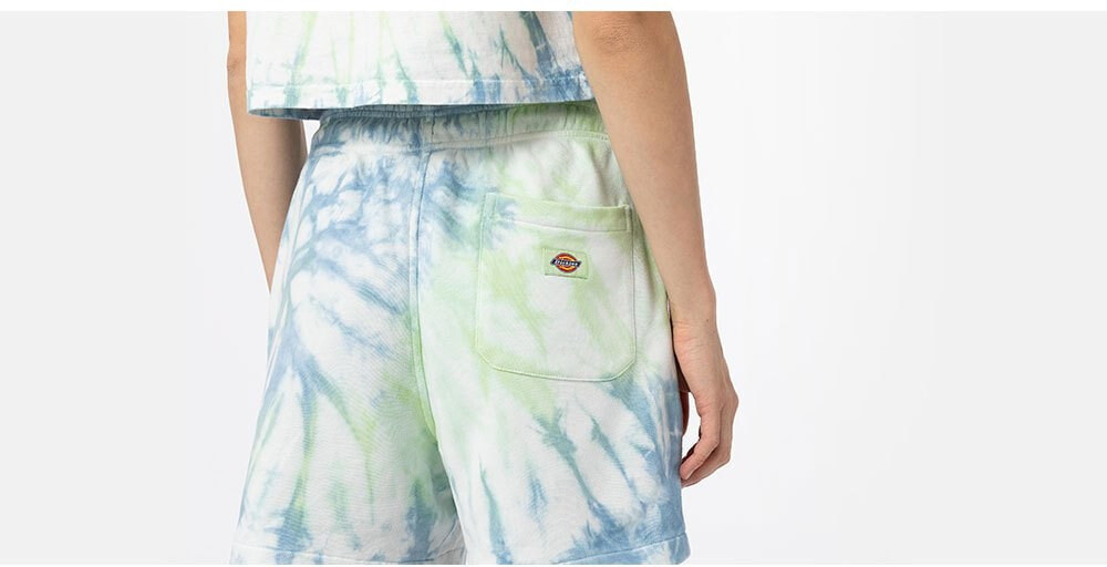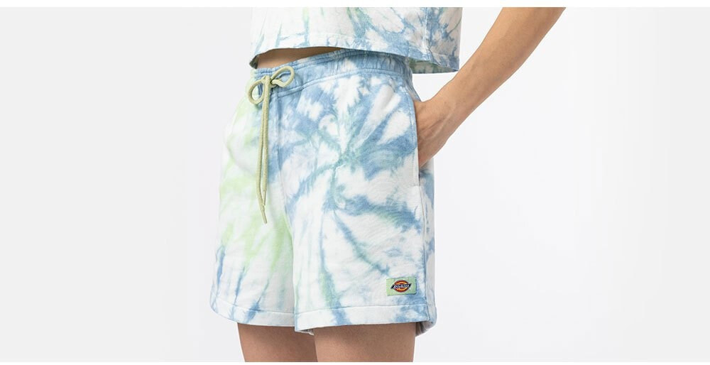A relaxed fit shorter length cut with front pockets, back patch pocket and elasticated drawstring waist, available in golden ochre and celadon green tie-dye pattern.