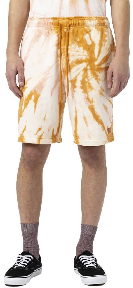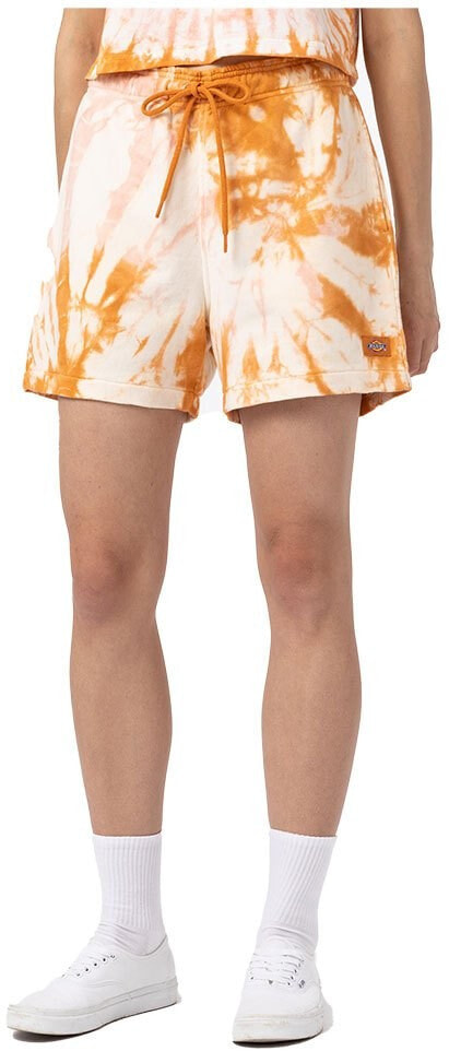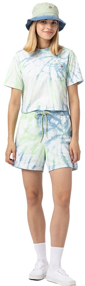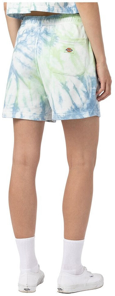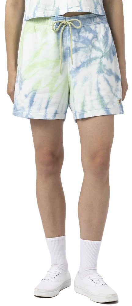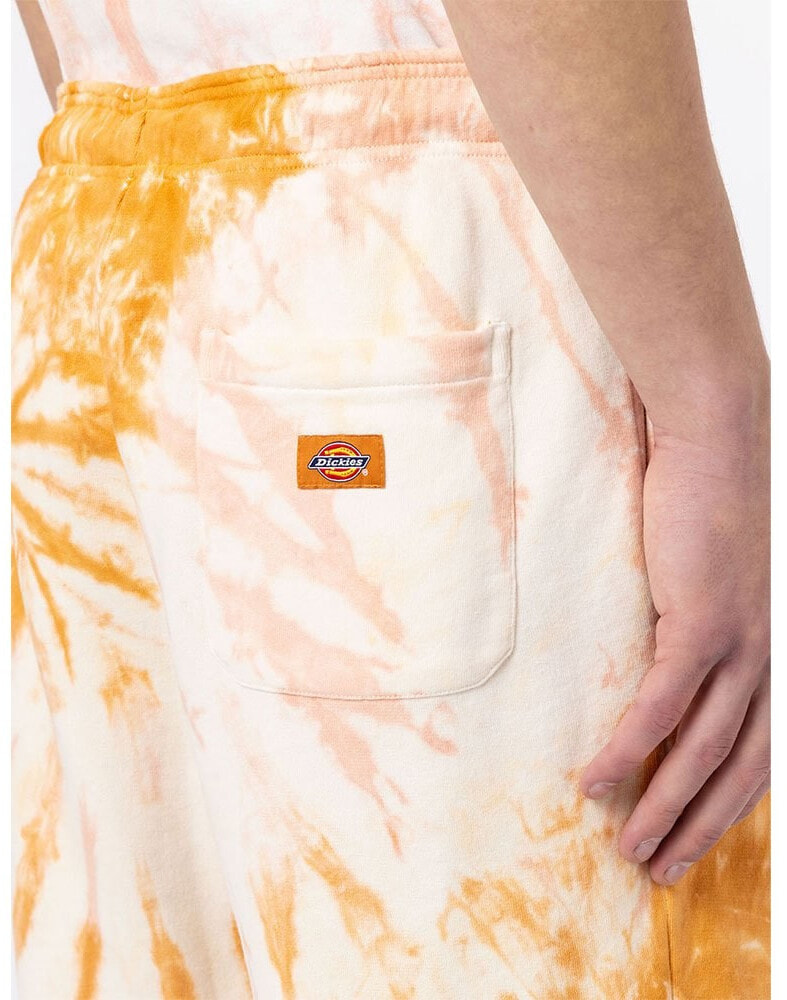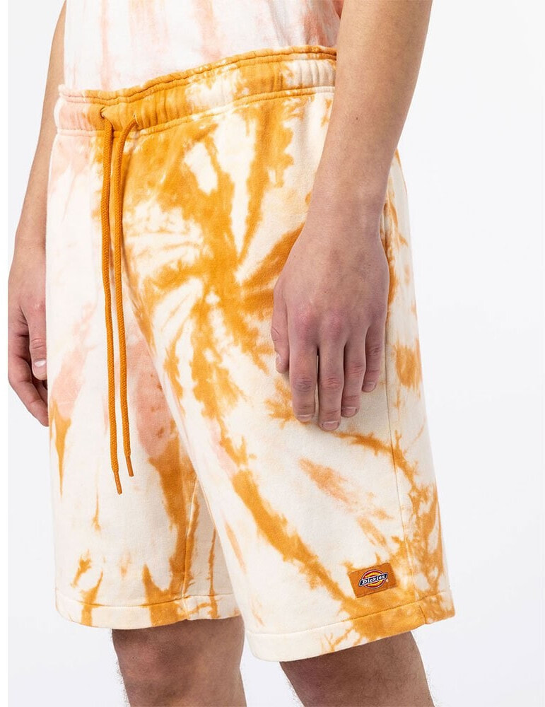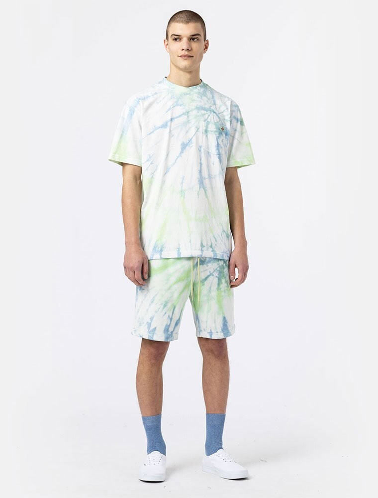 A relaxed fit shorter length cut with front pockets, back patch pocket and elasticated drawstring waist, available in golden ochre and celadon green tie-dye pattern.