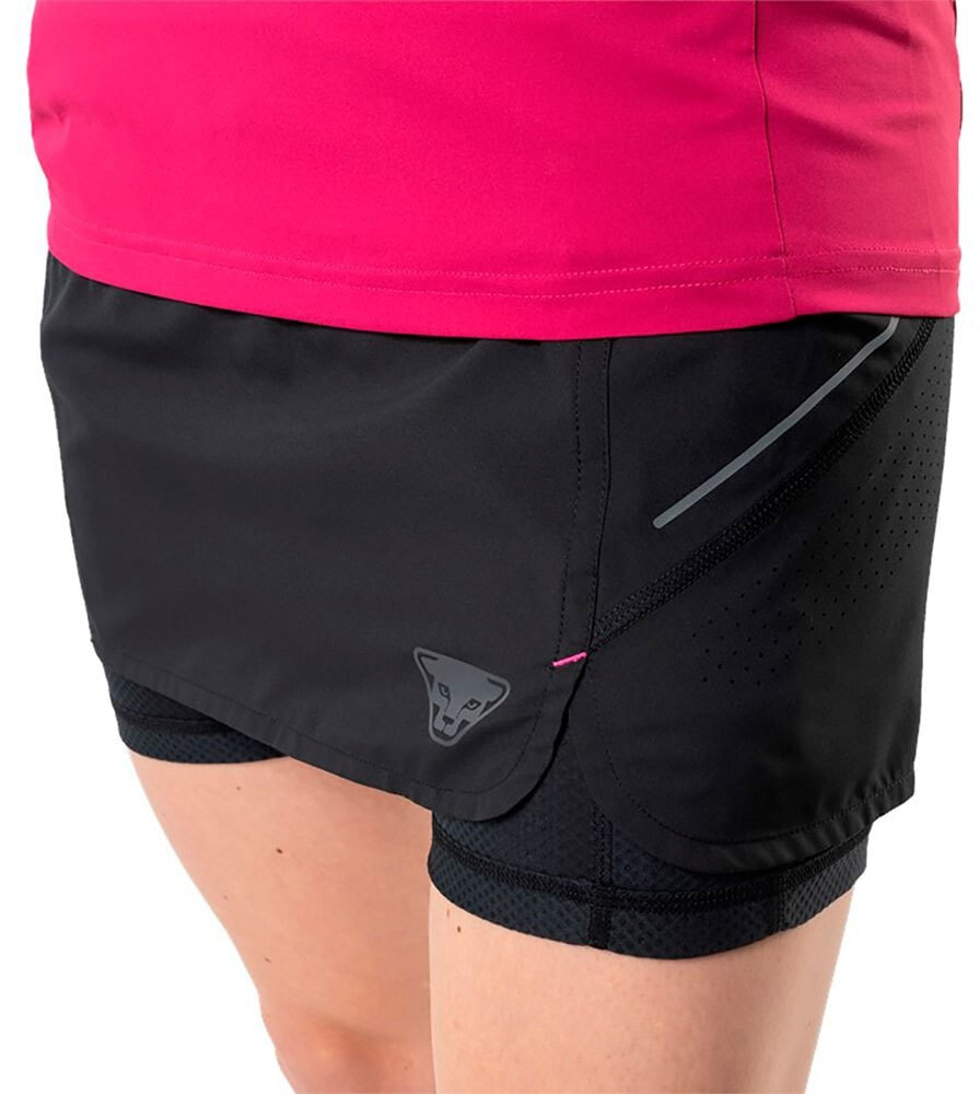 The Alpine Pro 2in1 Shorts for women consist of a snug mesh liner pant with a breezy skirt for comfort and a stylish look on trail runs.