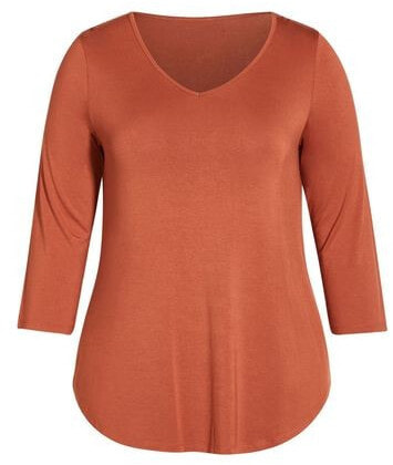 A colourful take on a classic shape, the options are endless in the 3/4 Sleeve V-neck top. This wardrobe staple brings a bold twist to your everyday look with its rust hue and figure-flattering relaxed fit. Features wide V-neckline, 3/4 length sleeves, soft stretch fabrication, unlined, pull over style, relaxed fit, hip length and curved hemline.