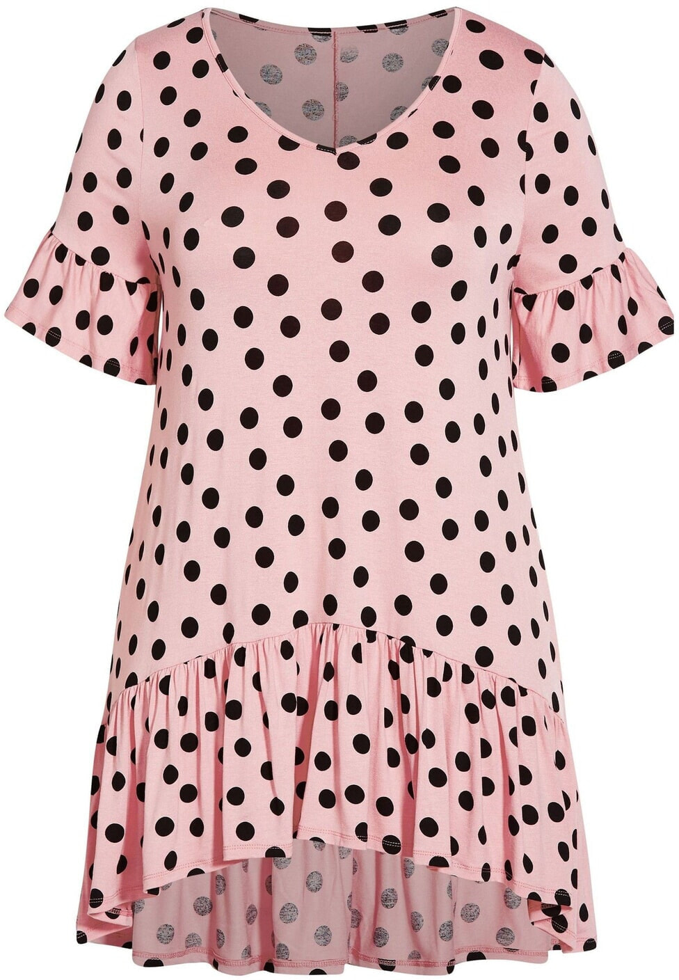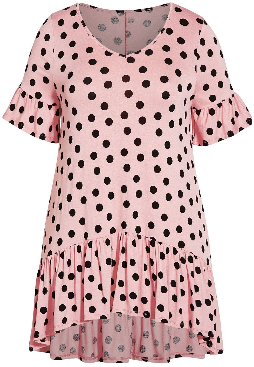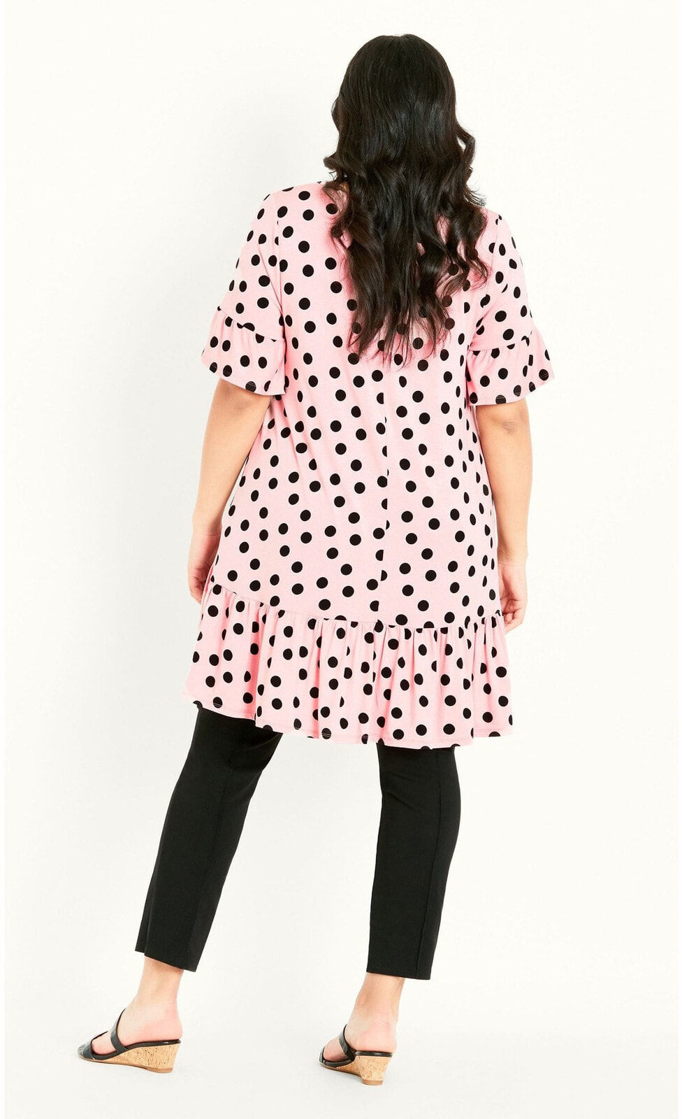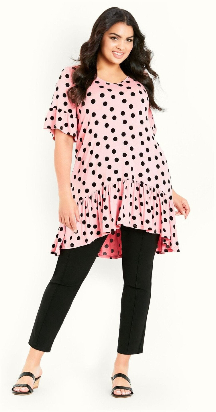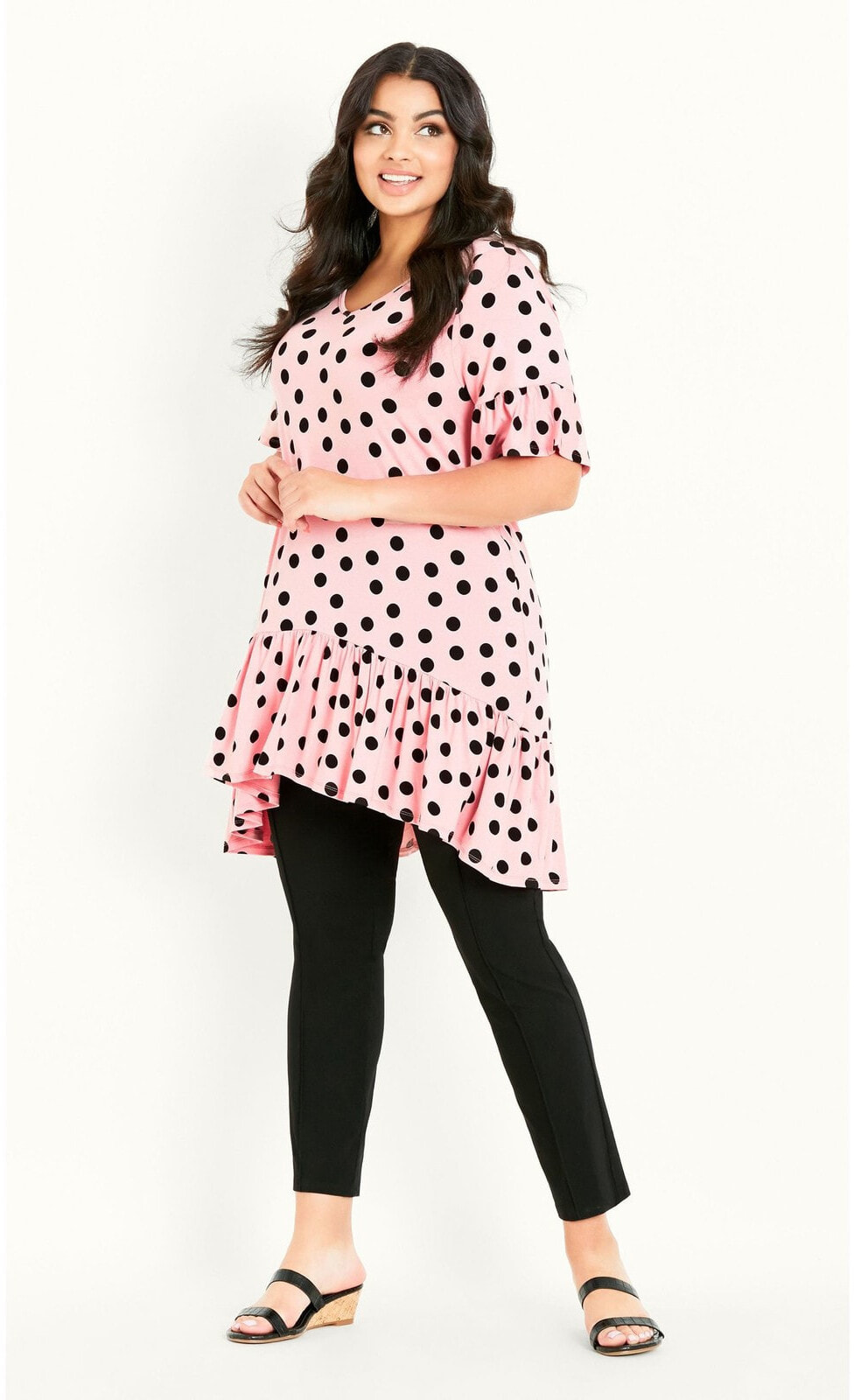 The frill hem print top is a favourite for lovers of playful styling, featuring a polkadot print on pink base that is sure to liven up any casual outfit! With an accented frilled hem for added style, this breezy top is the perfect choice for a laid-back lunch with friends. Key Features Include: V-neckline, frilled short sleeves, relaxed fit, soft stretch fabrication, unlined, pull over style, frilled hemline and below hip length .Style this top with your favourite pair of skinny jeans, low wedges and a cross body bag to complete the look.
