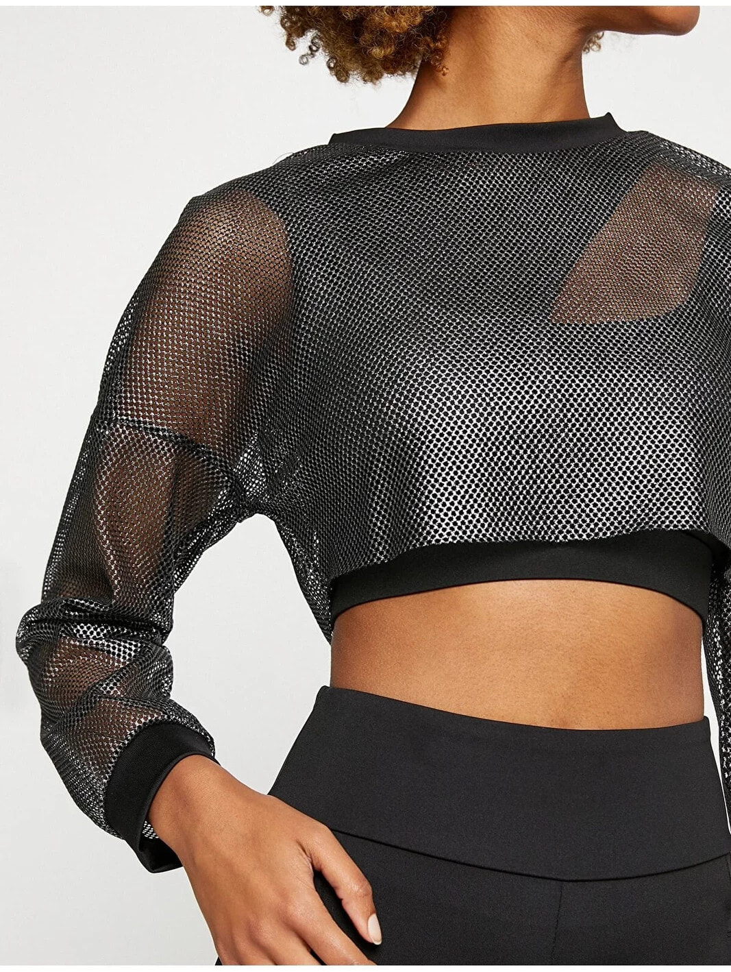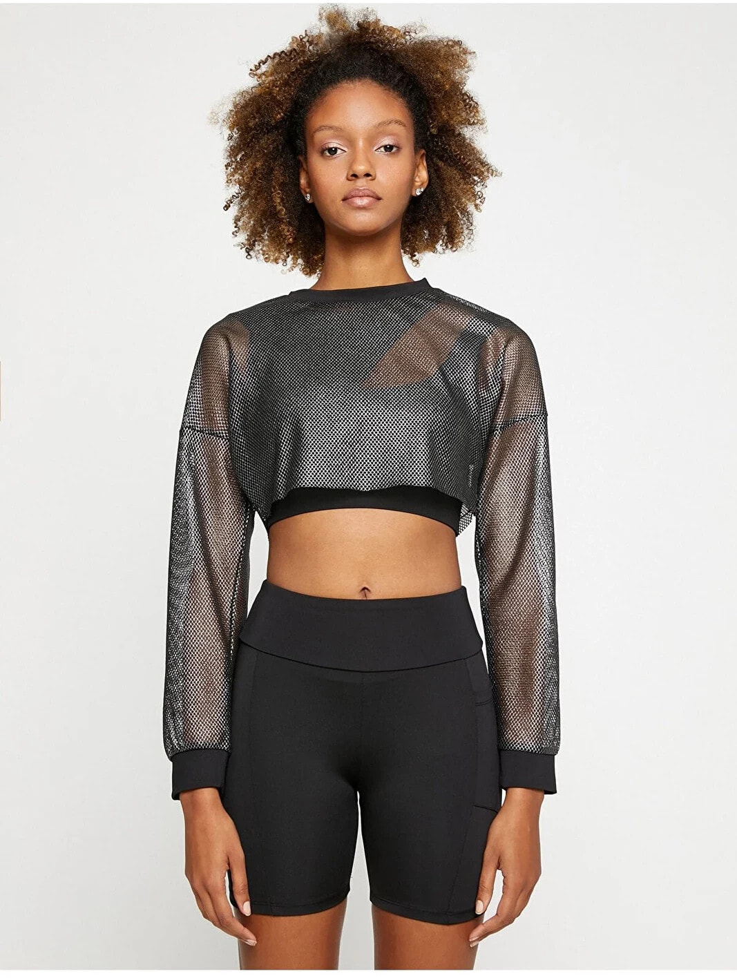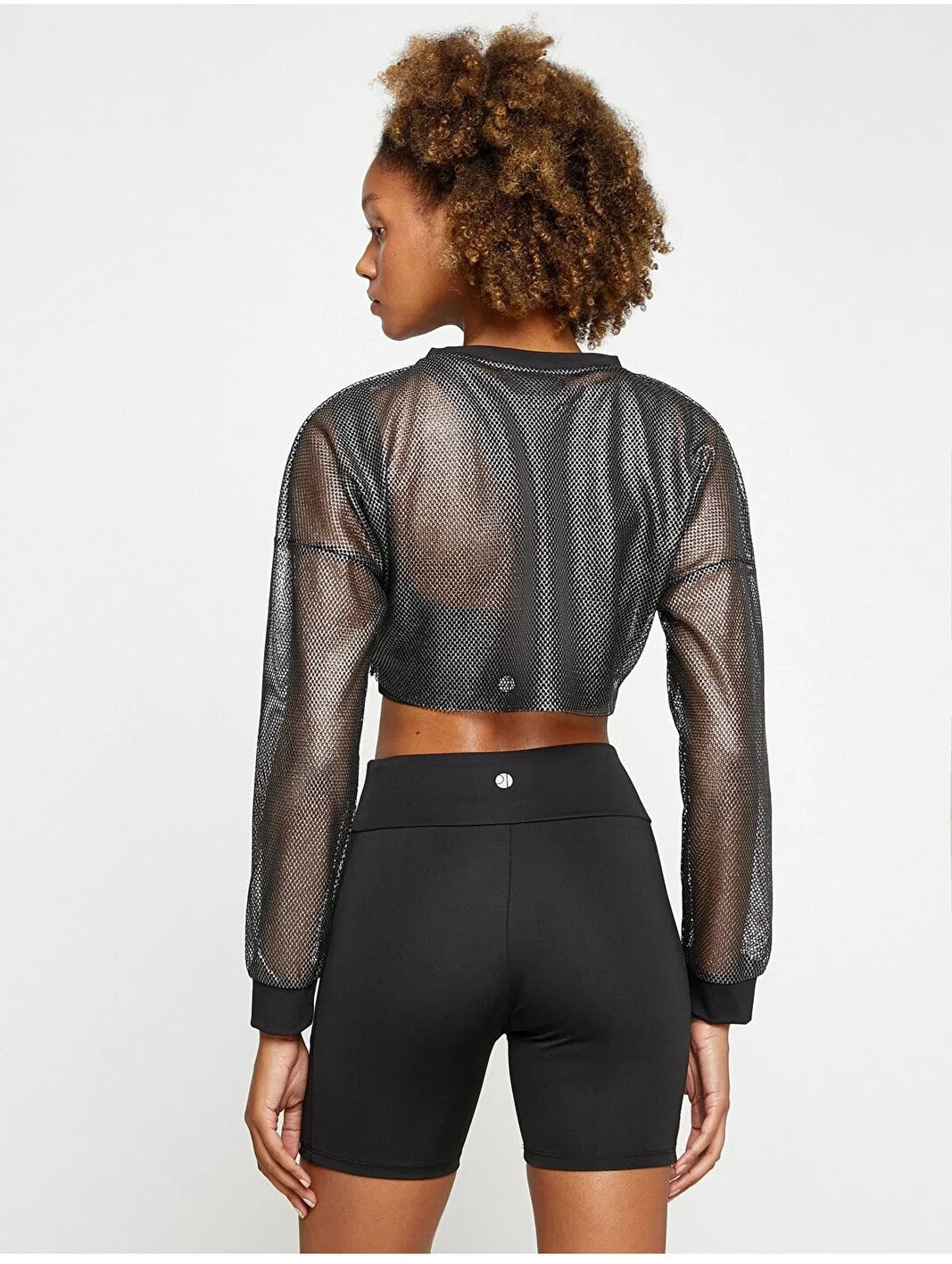 Bisiklet yaka, uzun kollu, fileli, crop spor tişört.