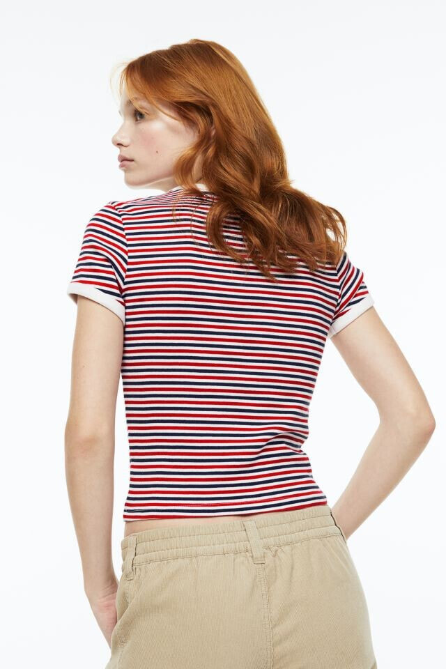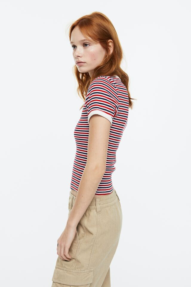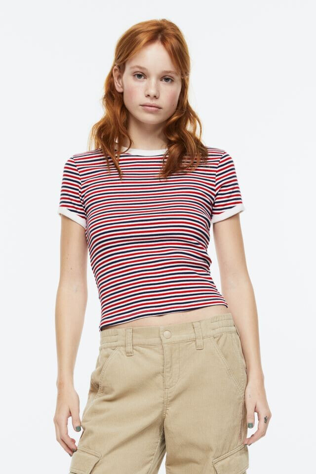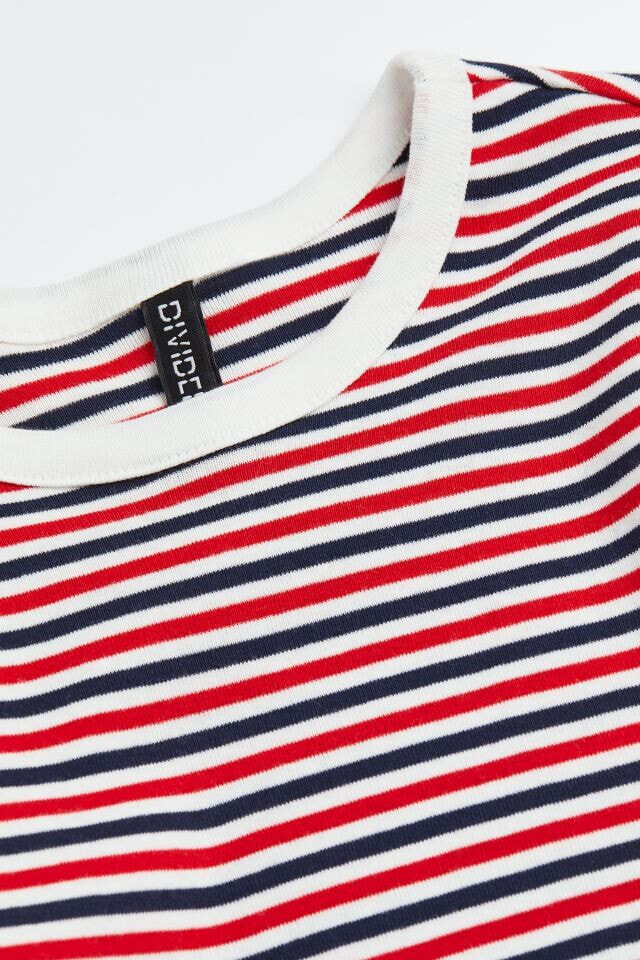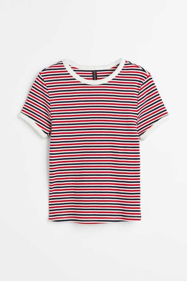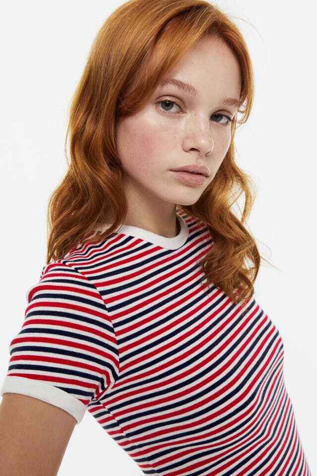 Fitted top in soft cotton jersey. Round neckline, short sleeves, and a straight-cut hem. Narrow trim at neckline and cuffs.