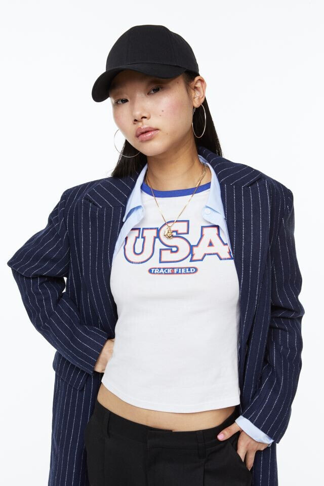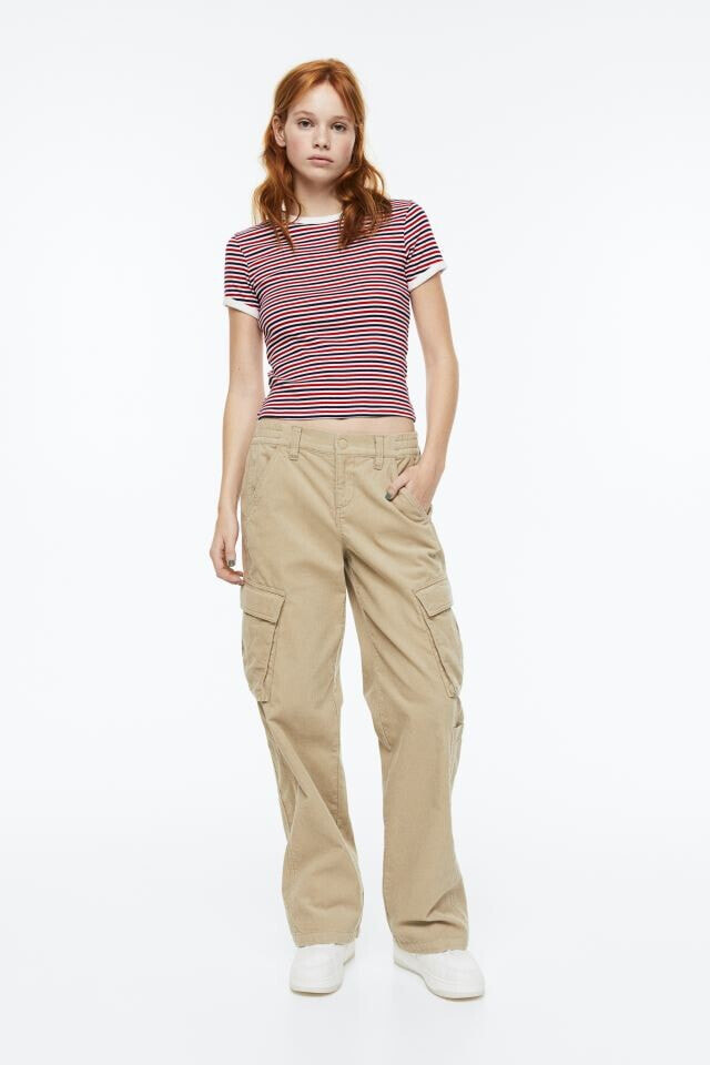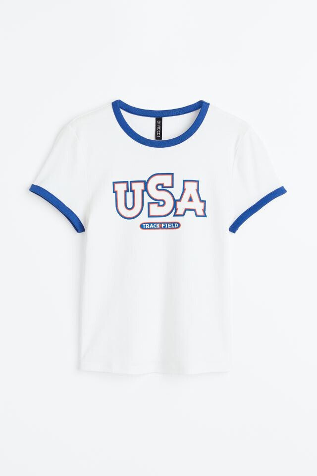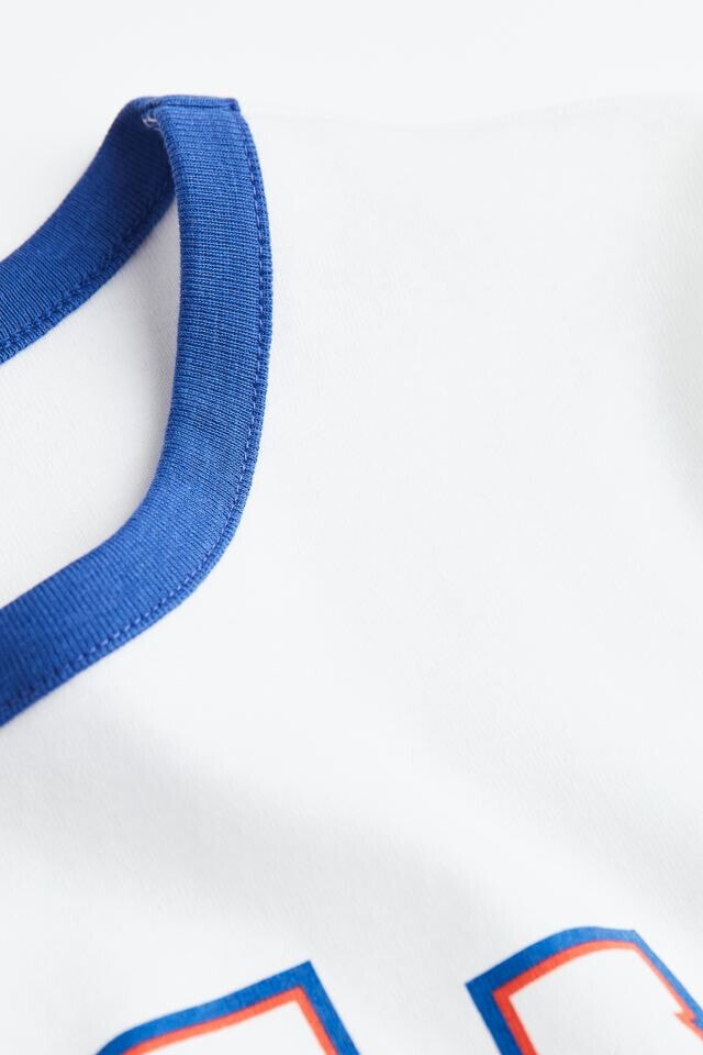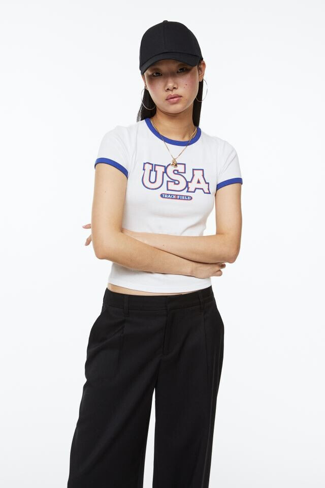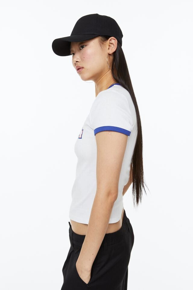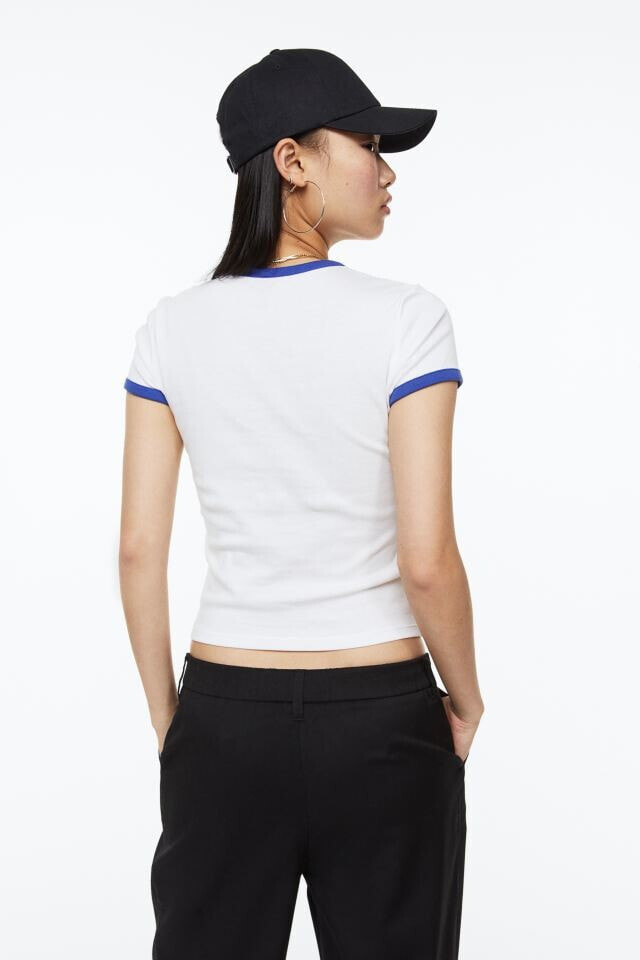 Fitted top in soft cotton jersey. Round neckline, short sleeves, and a straight-cut hem. Narrow trim at neckline and cuffs.