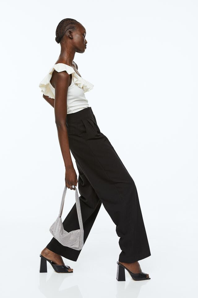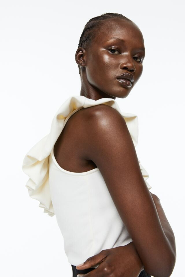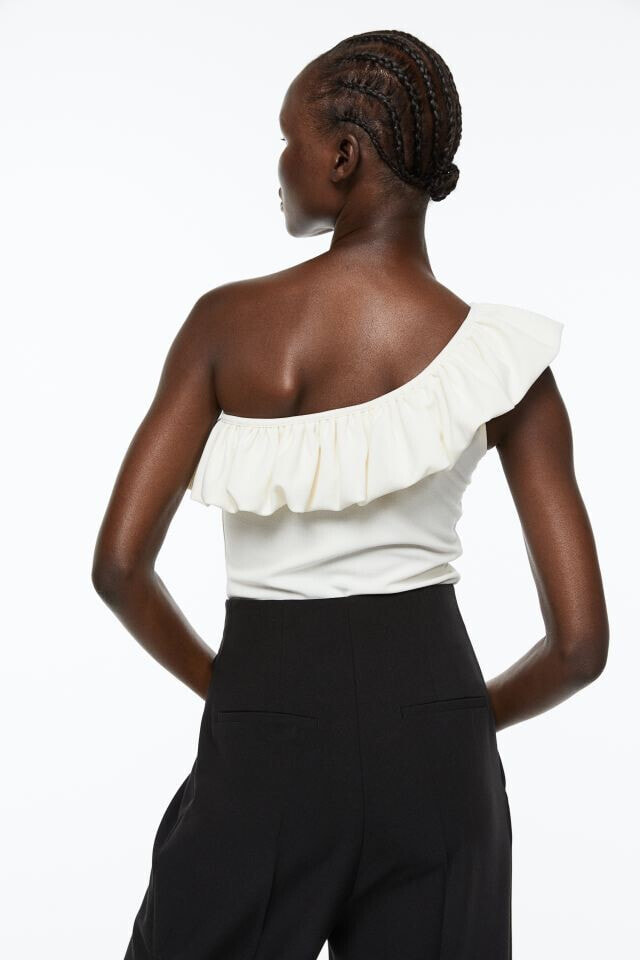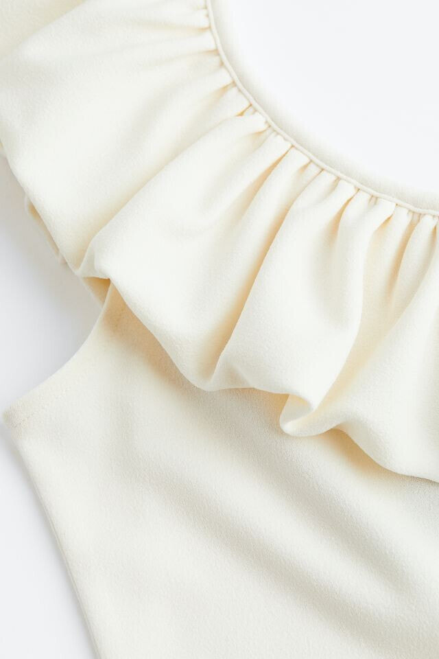 Fitted top in jersey with one shoulder strap and one open shoulder. Wide flounce at neckline and a straight-cut hem.