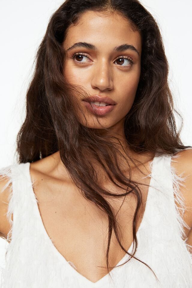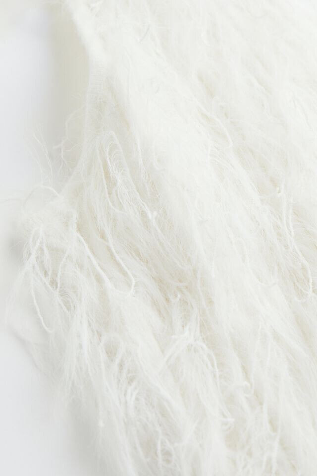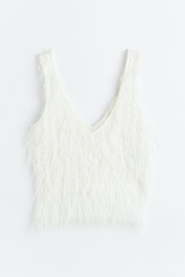 Short, sleeveless top in a fluffy, fringed knit. Wide shoulder straps, low-cut V-neck front and back, and fringe at hem.