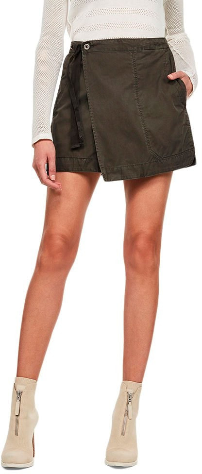 The Utility wrap mini skirt offers a foldover design with a shank button closure.