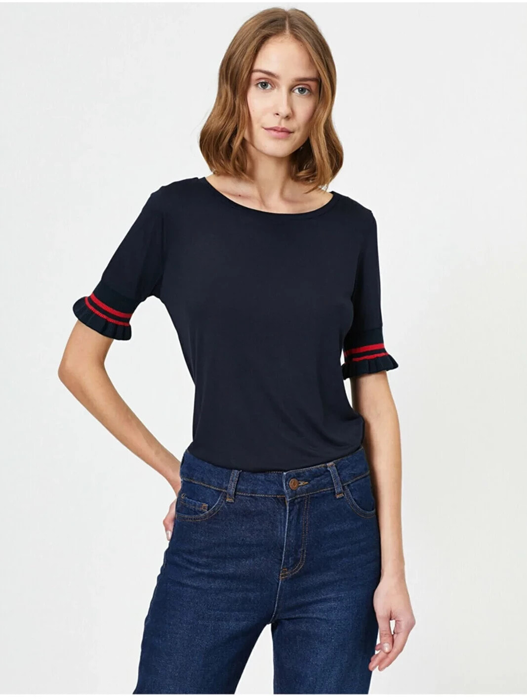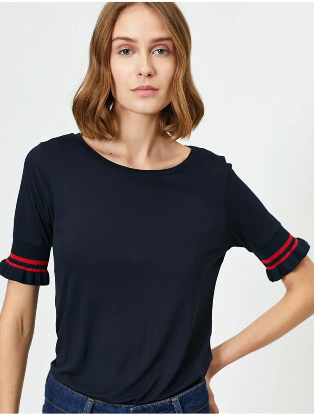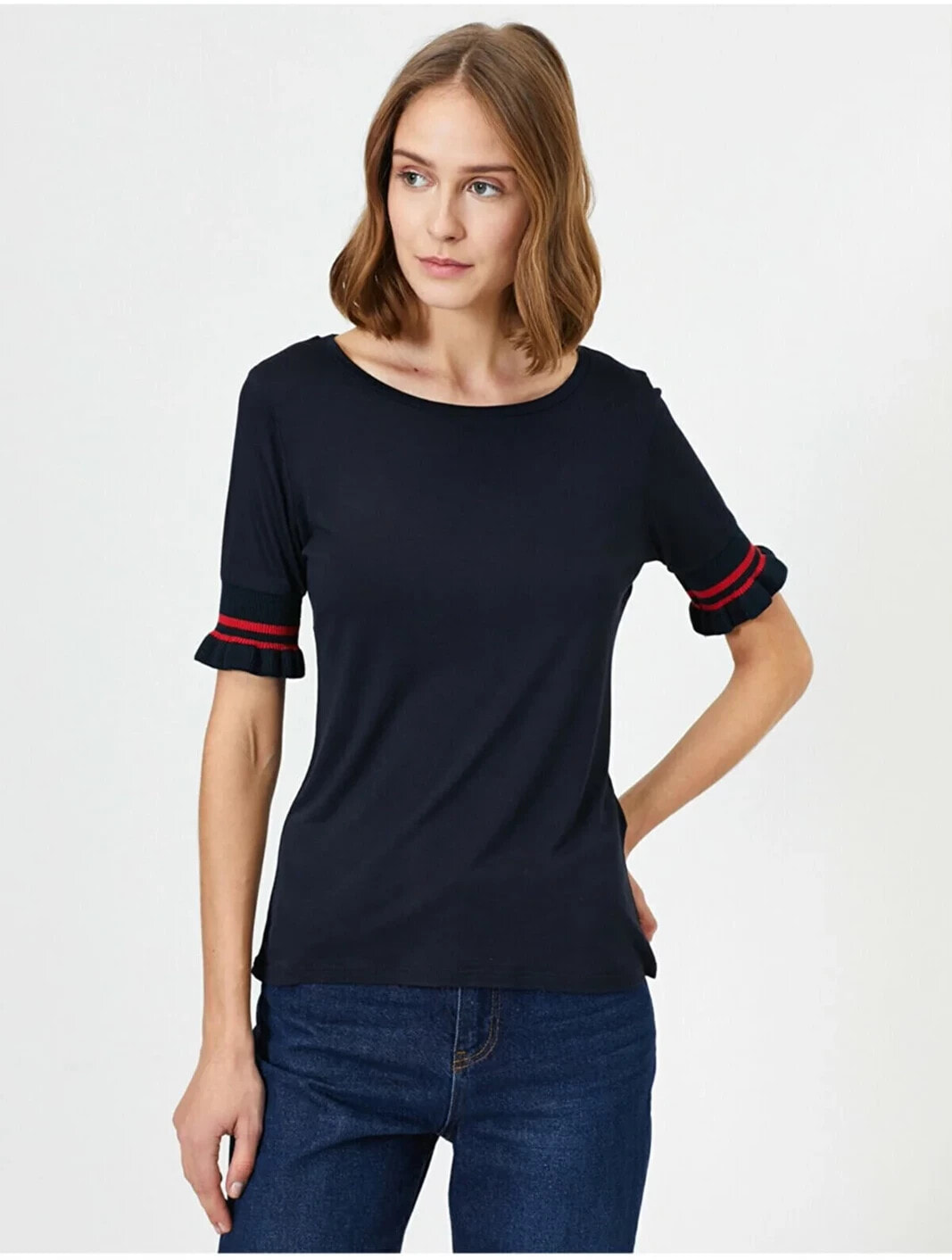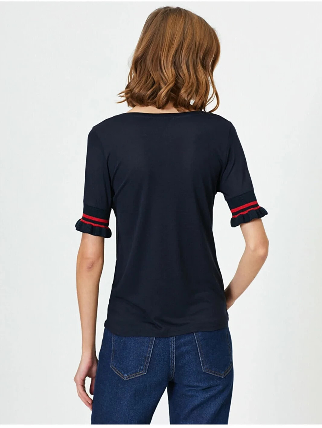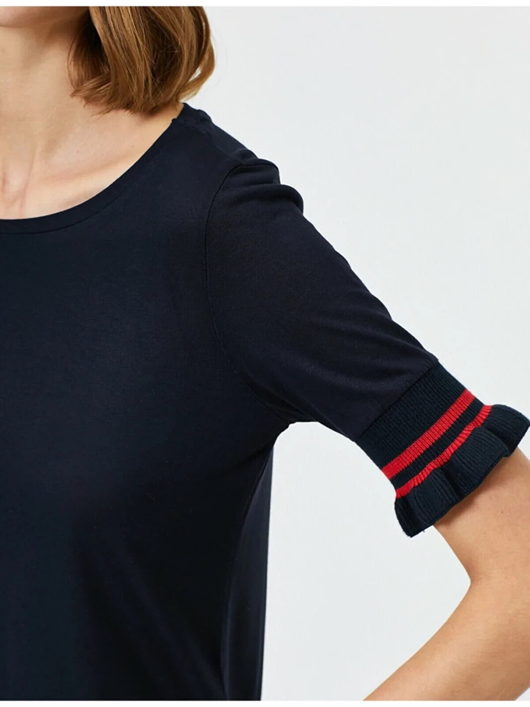Kadın Lacivert Kolu Lastik Detayli Bisiklet Yaka Tisört
