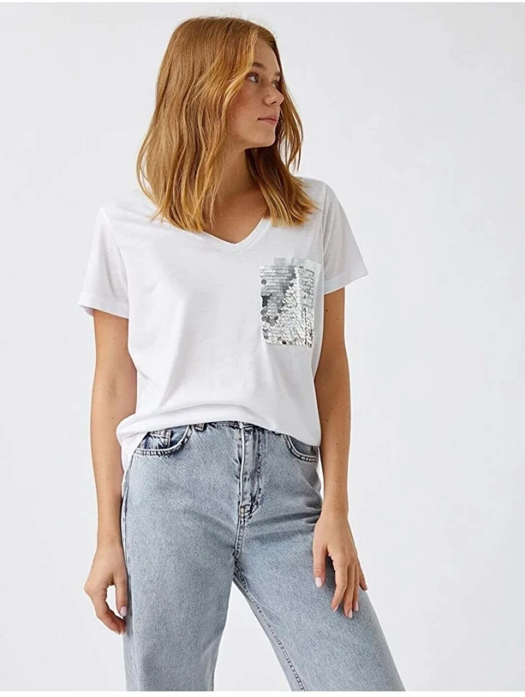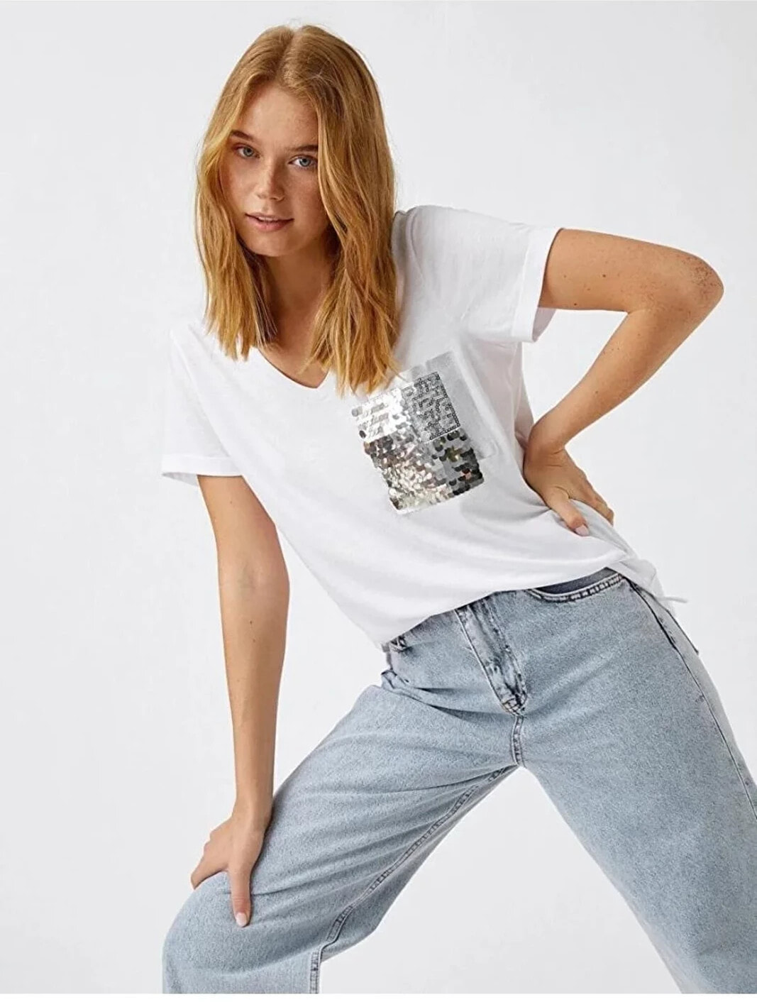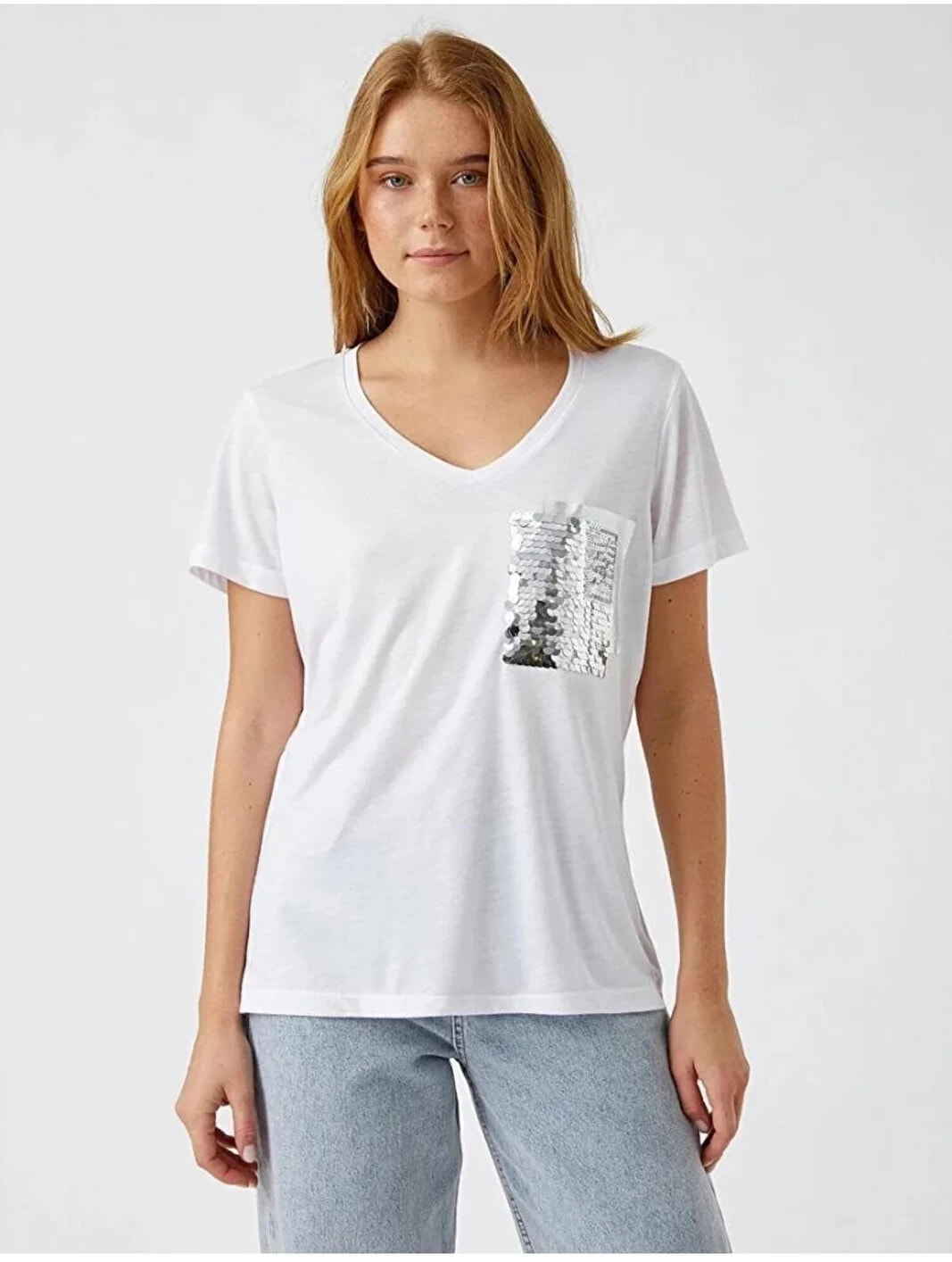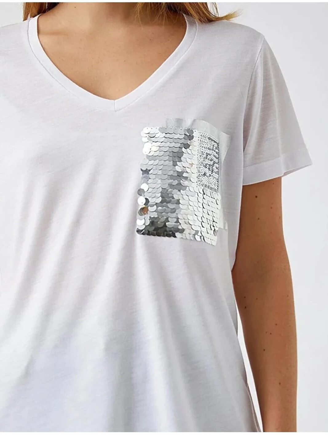 V Yaka Payet Kısa Kollu Tişört Materyal Bilgileri: %65 Polyester, %35 Viskoz Model Bilgileri: Boy: 175 cm, Göğüs: 81, Bel: 60, Kalça: 88Modelin Bedeni: S