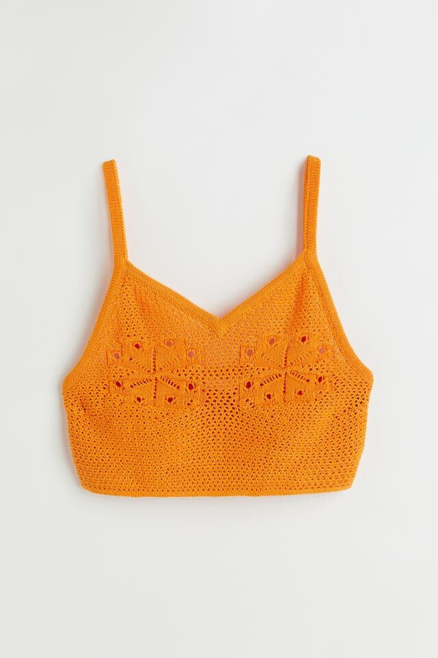 Soft, knit crop top with a crocheted look. Narrow shoulder straps, V-neck, and concealed elastic at lower edge.