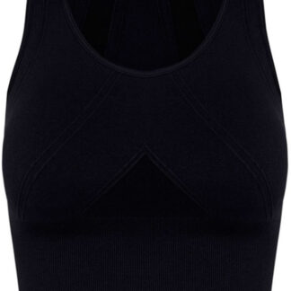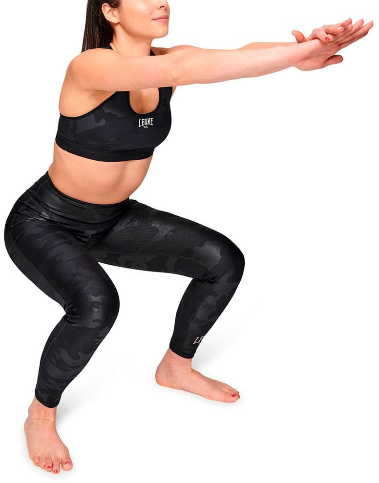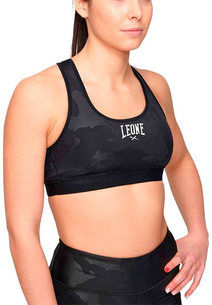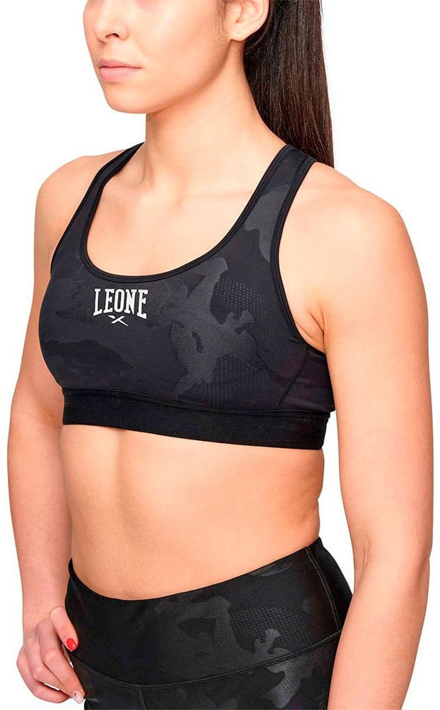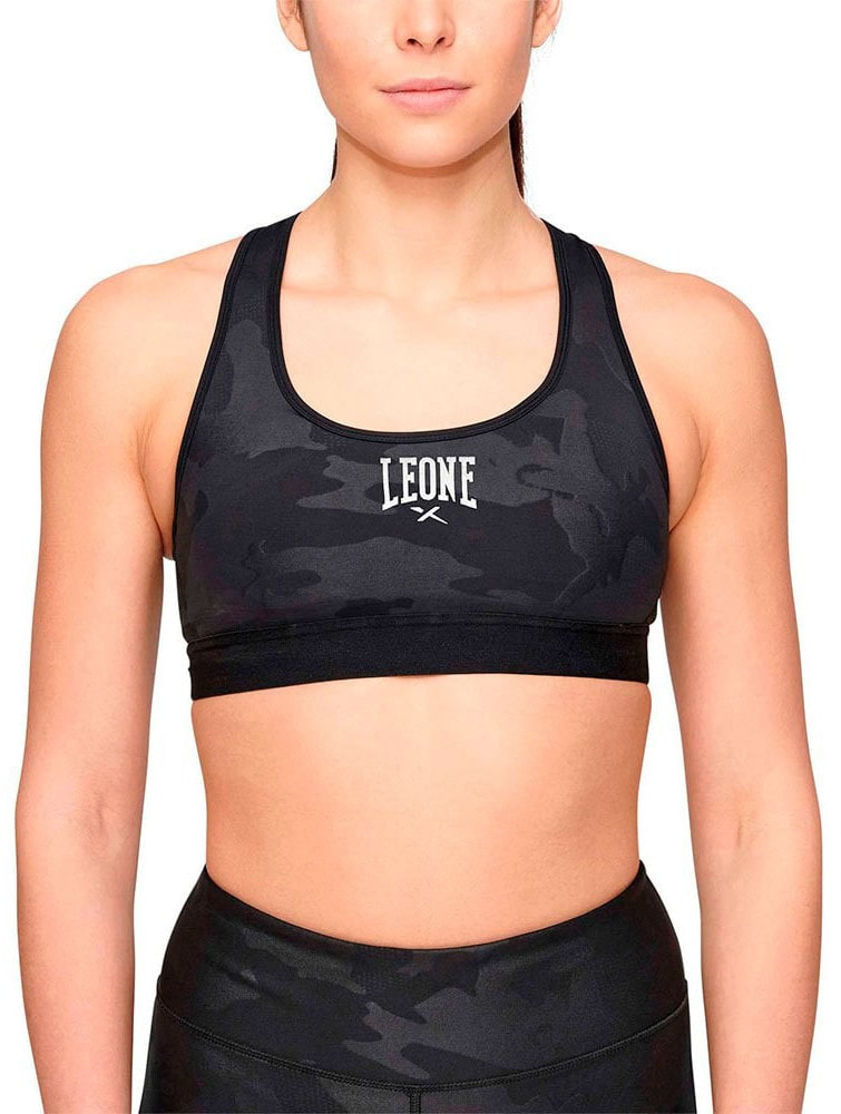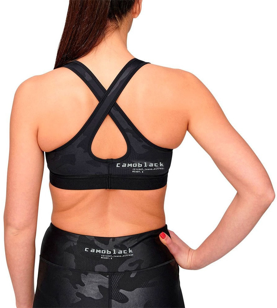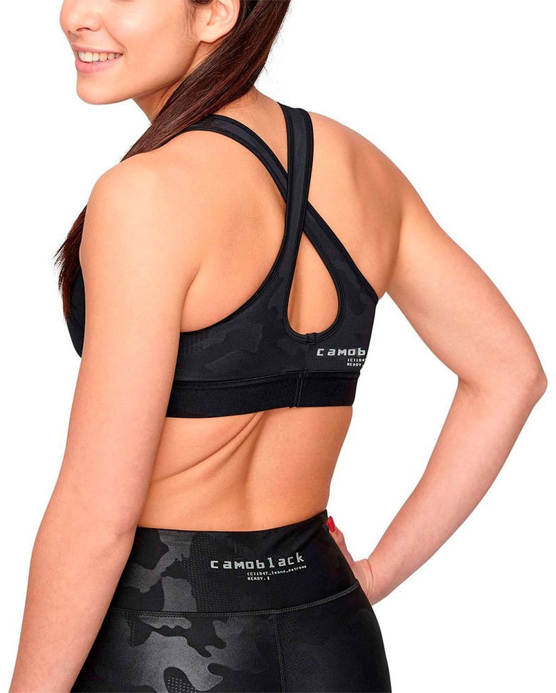 Camoblack sports bra, enveloping and oriental with crossed straps.