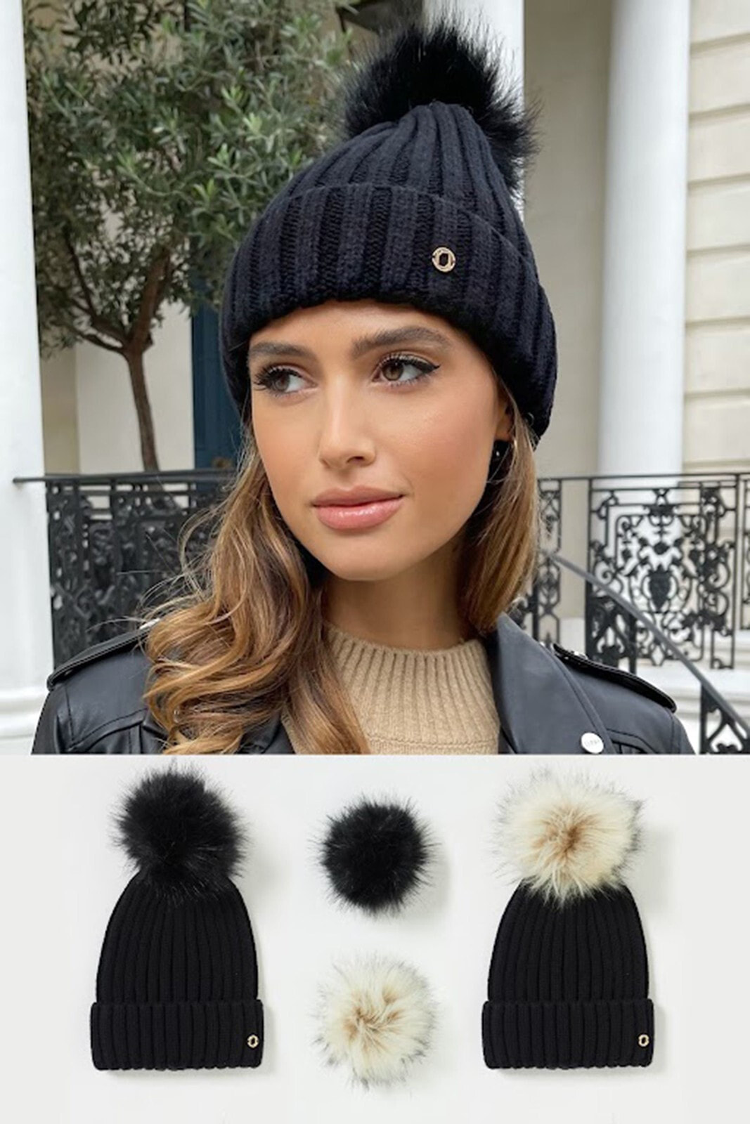 Cosy ribbed 3 piece hat with two changeable faux fur poms and branded Lipsy hardware