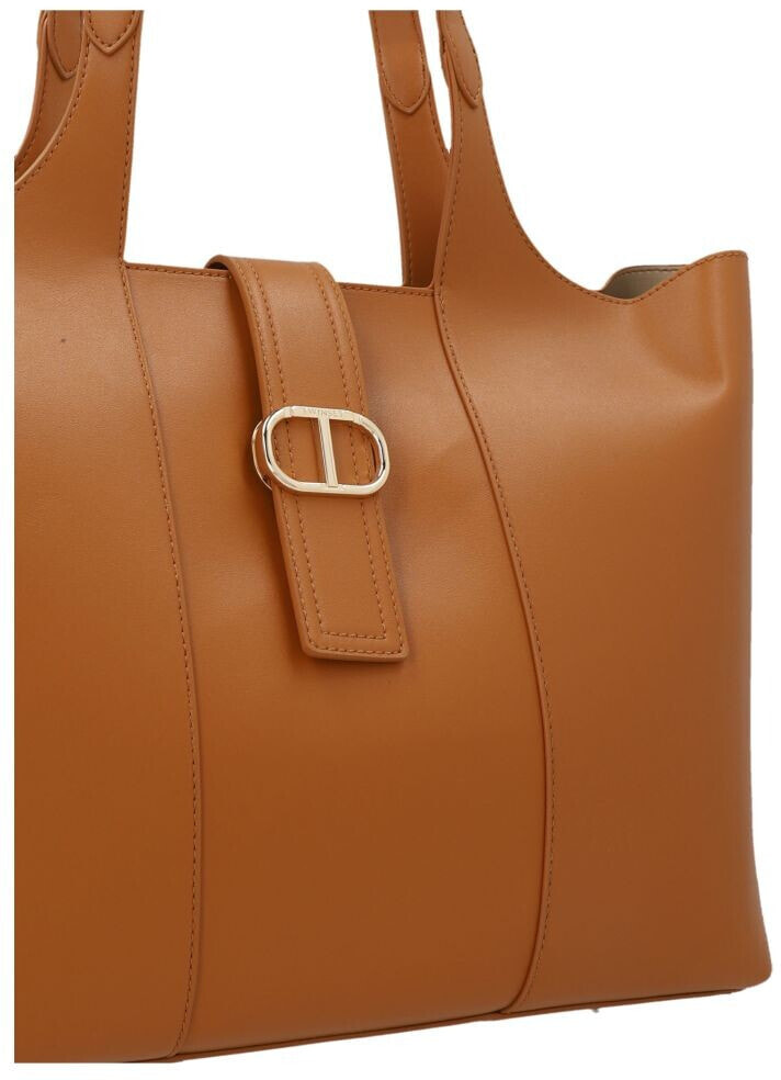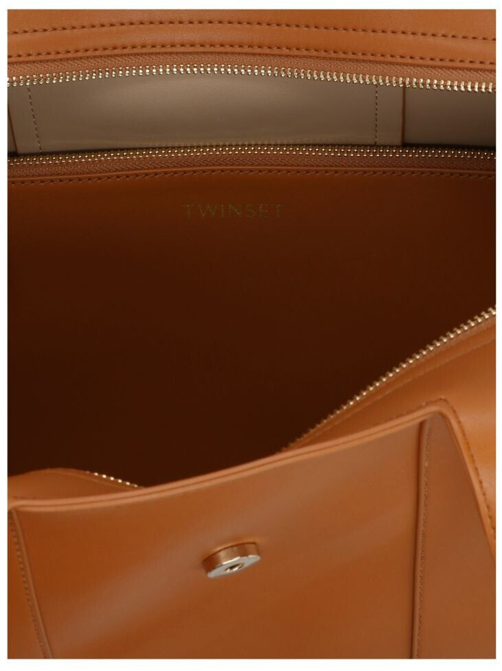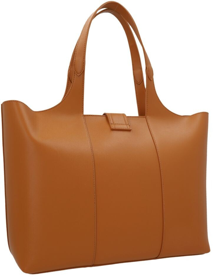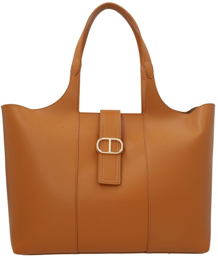 Faux leather shopping bag with zip and hook closure, metal logo, double handle.