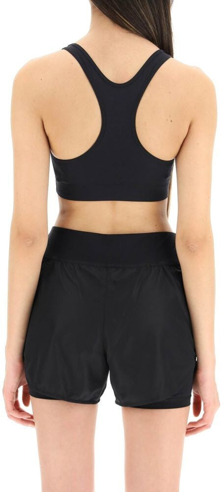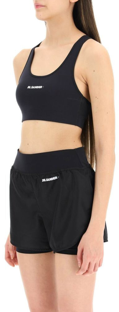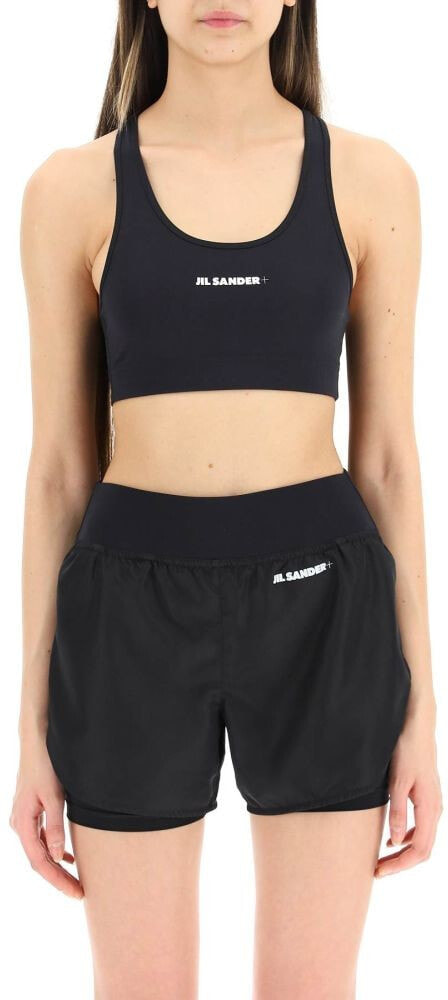 Jil Sander sports bra crafted in stretch technical fabric with contrasting logo print on front. Elastic edge, racer back. The model is 177 cm tall and wears a size XS.