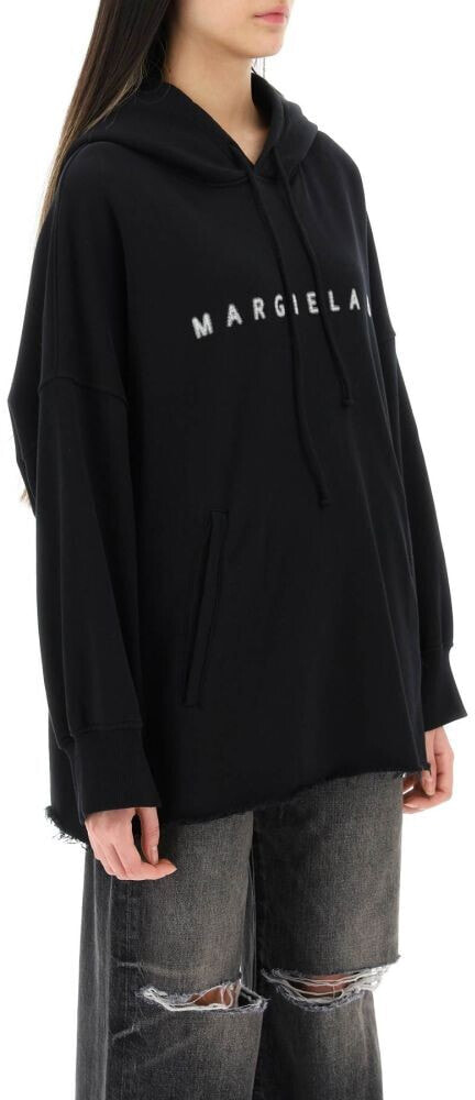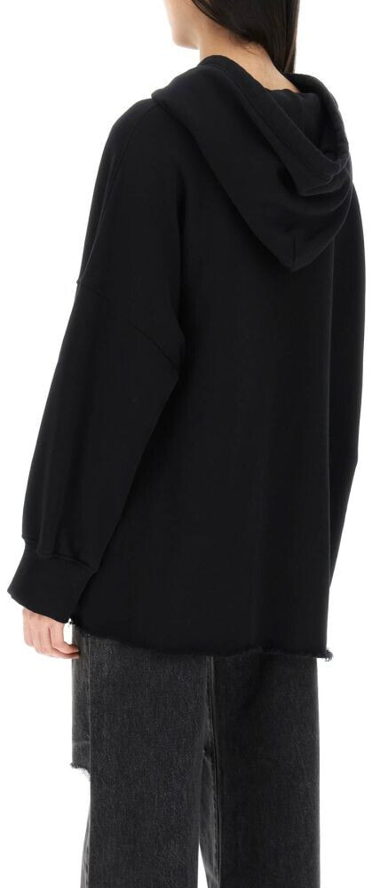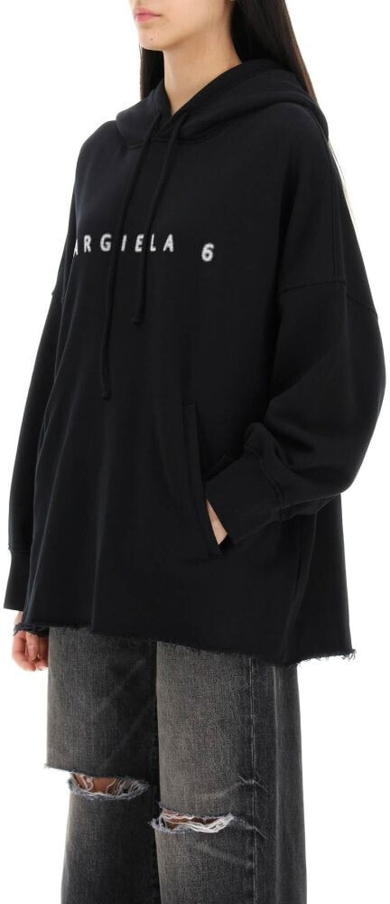 Unbrushed cotton jersey hoodie from the MM6 Maison Margiela collection, sporting a pixel-effect “Margiela 6” front print that glows in the dark. Kangaroo pocket, elastic drawstring, raw-cut hems, signature white stitch line on the upper back. Regular fit. The model is 177 cm tall and wears a size XS.