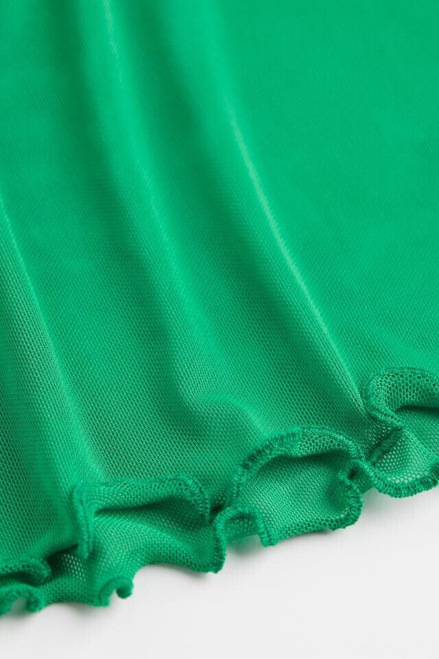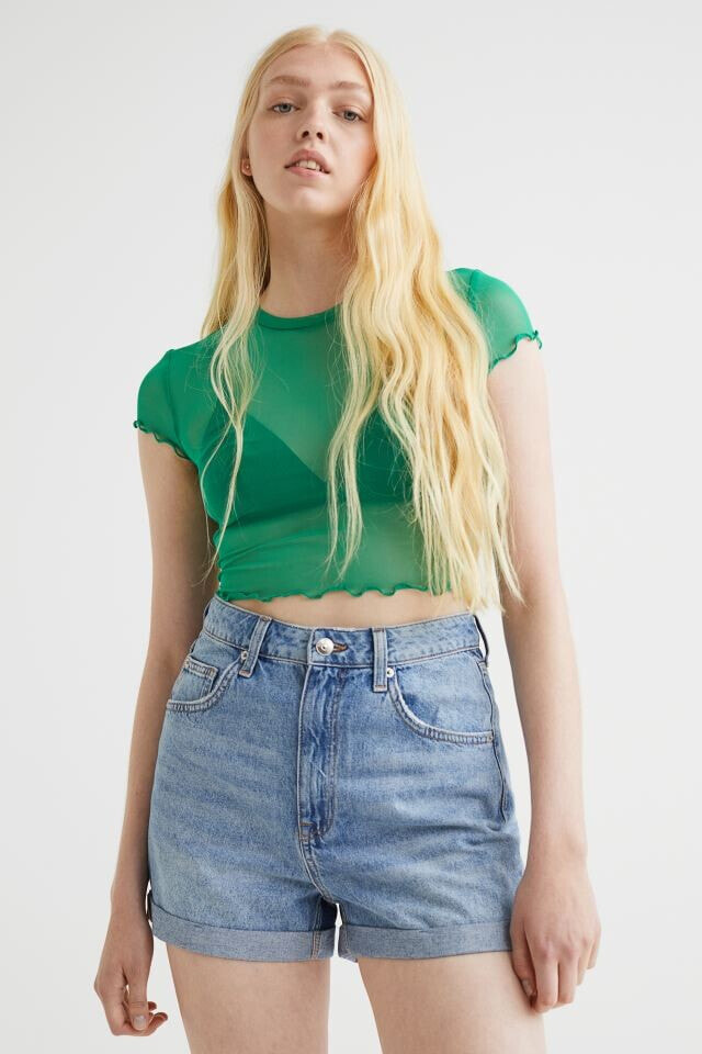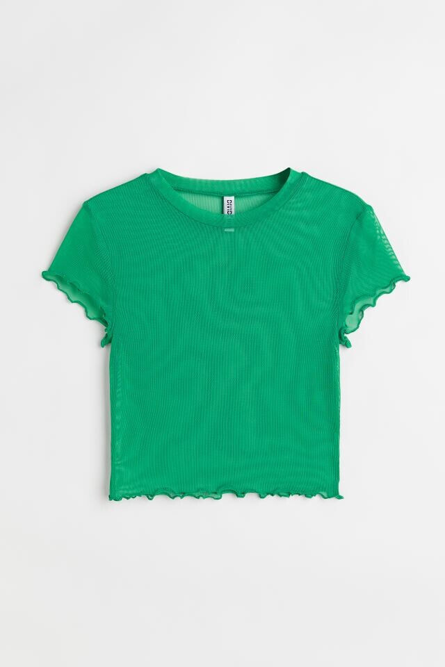 Fitted crop top in mesh. Round neckline with trim, short sleeves, and overlocked edges at cuffs and hem.