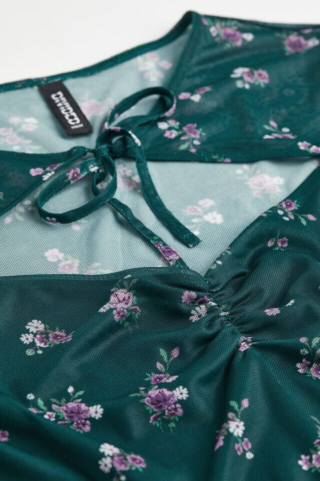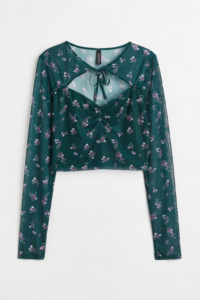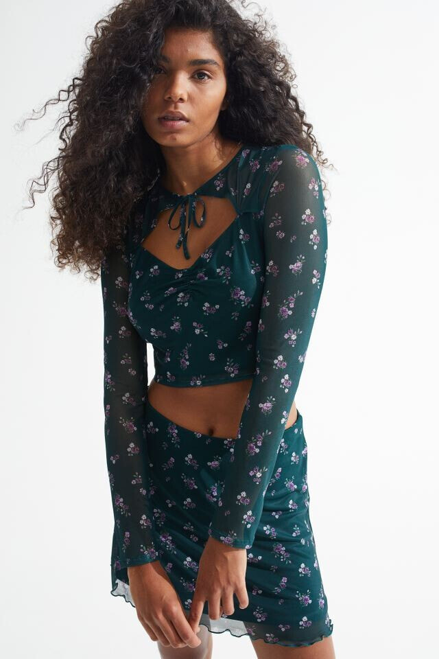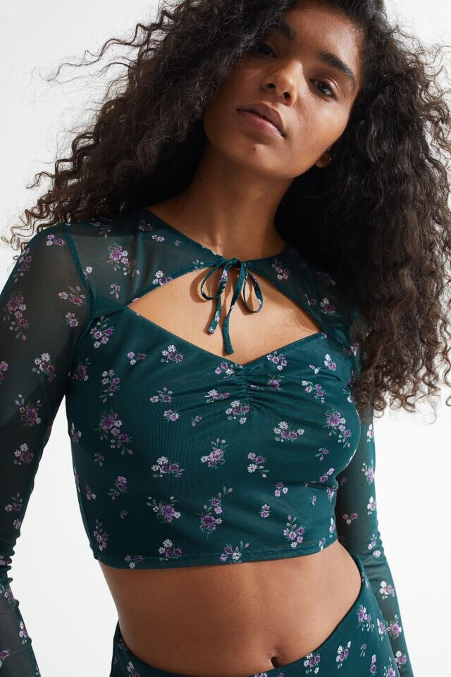 Long-sleeved crop top in mesh with a printed design. Cut-out section at top with ties.