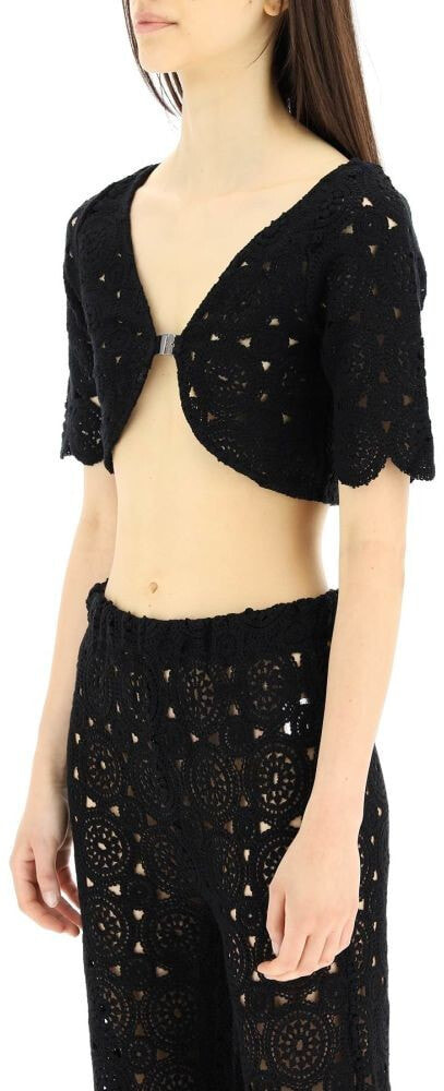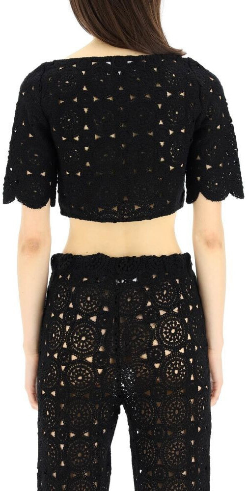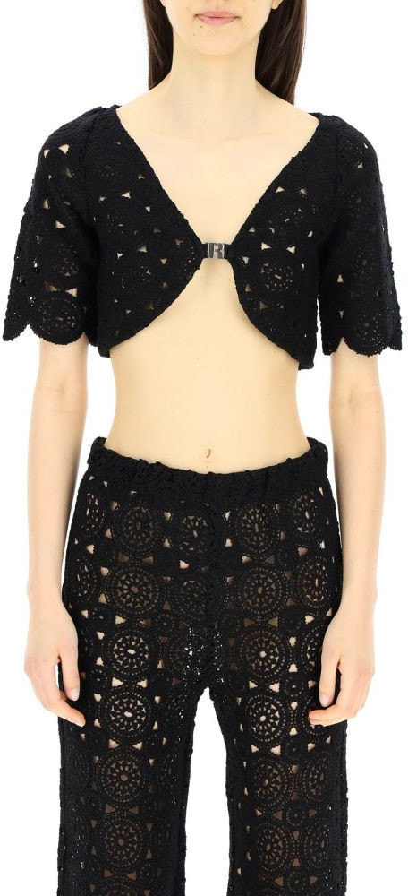 Short-sleeve cropped top by Rotate in organic cotton blend crochet. V neck, R-hook closure at front. The model is 177 cm tall and wears a size XS.