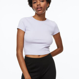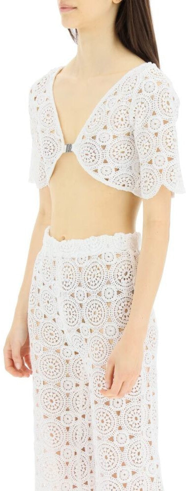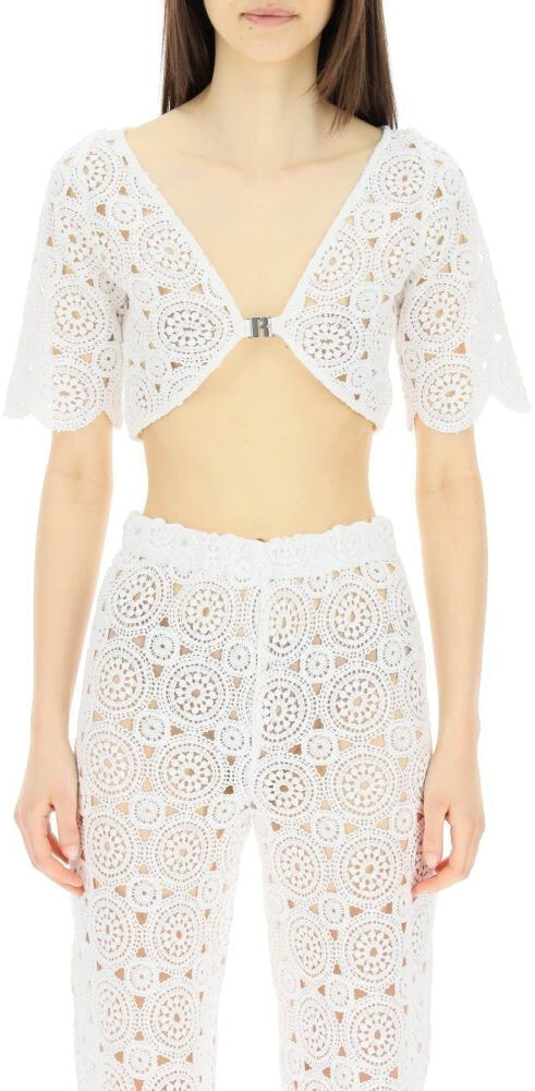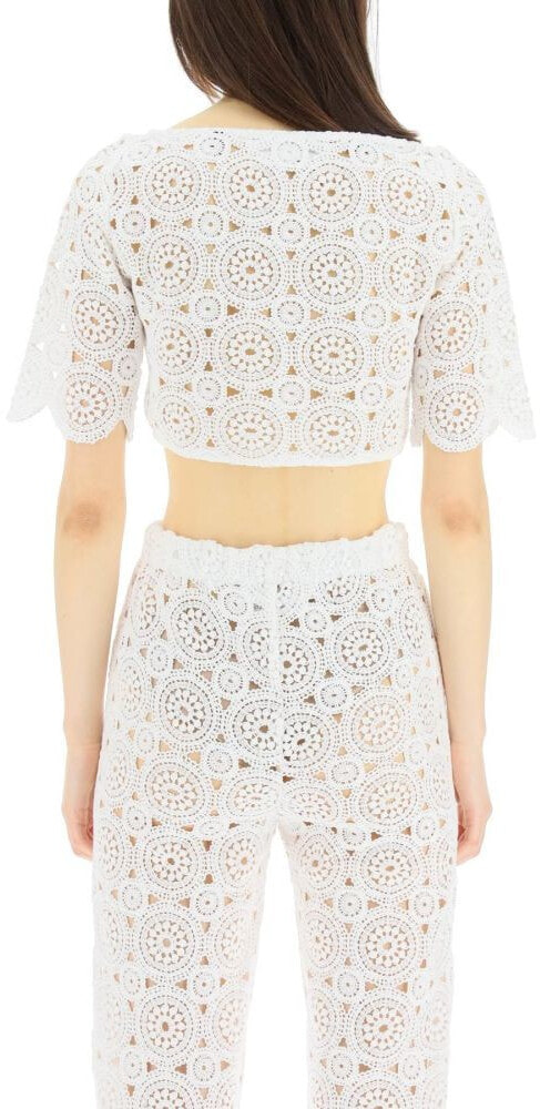 Short-sleeve cropped top by Rotate in organic cotton blend crochet. V neck, R-hook closure at front. The model is 177 cm tall and wears a size XS.