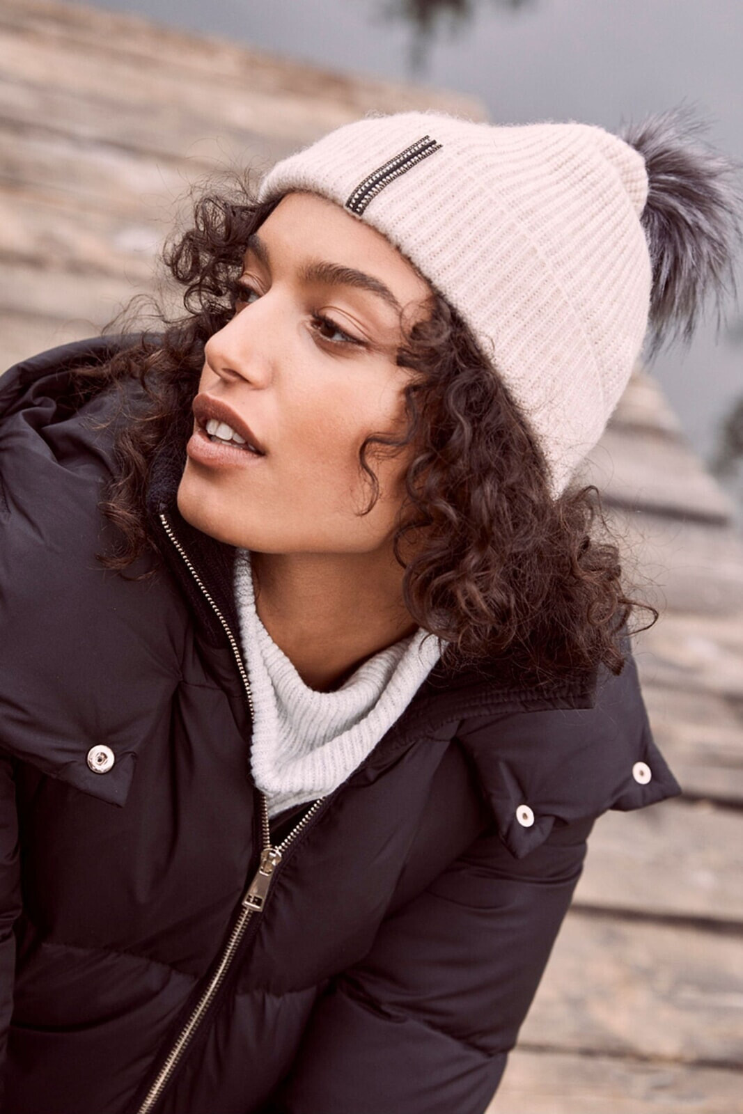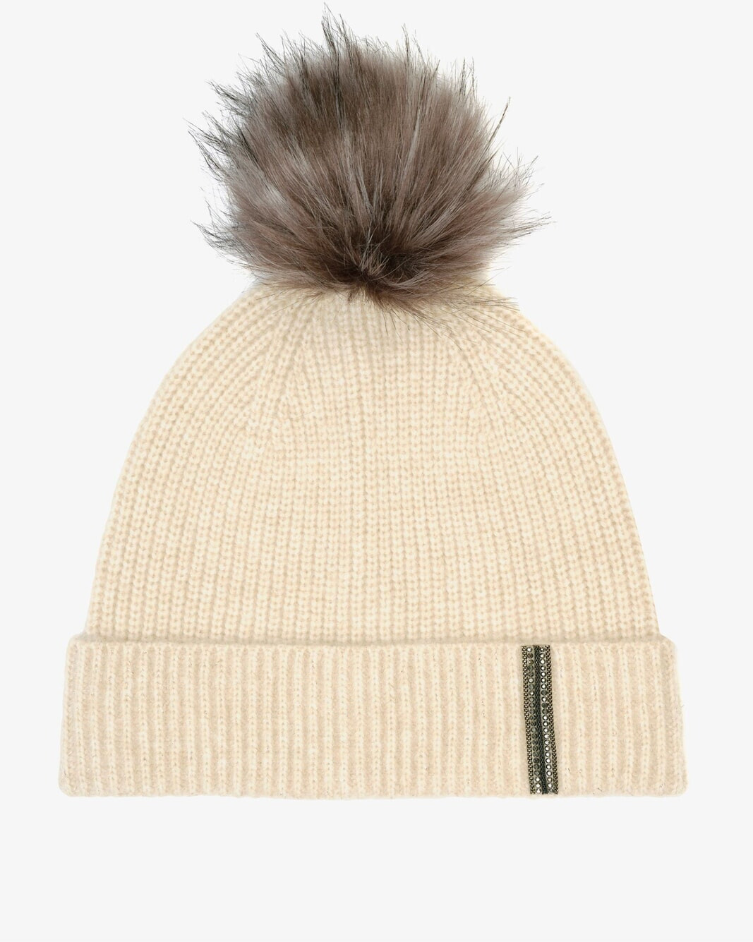 This beige beanie hat features a metallic twill striped detail on the turned-up cuff for a touch of sparkle � it’s finished it with a fluffy pom pom for a playful feel.