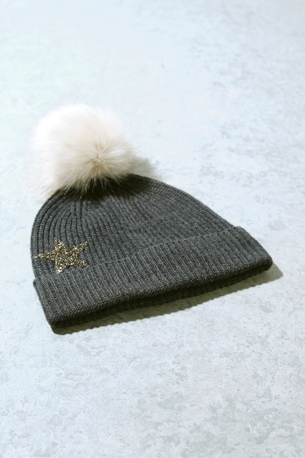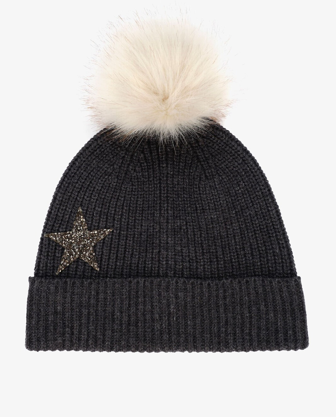 Knitted with a touch of cashmere for added softness, this beanie hat features embellished star patches and a pom-pom at the top.